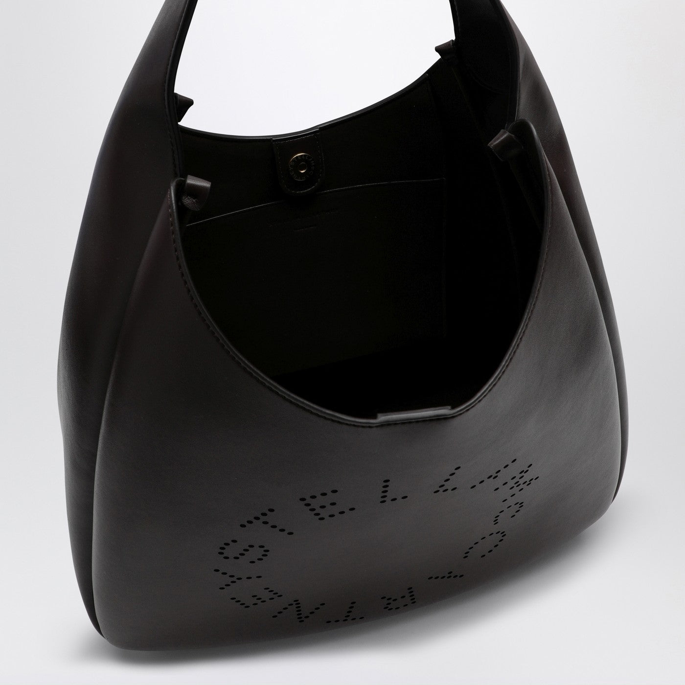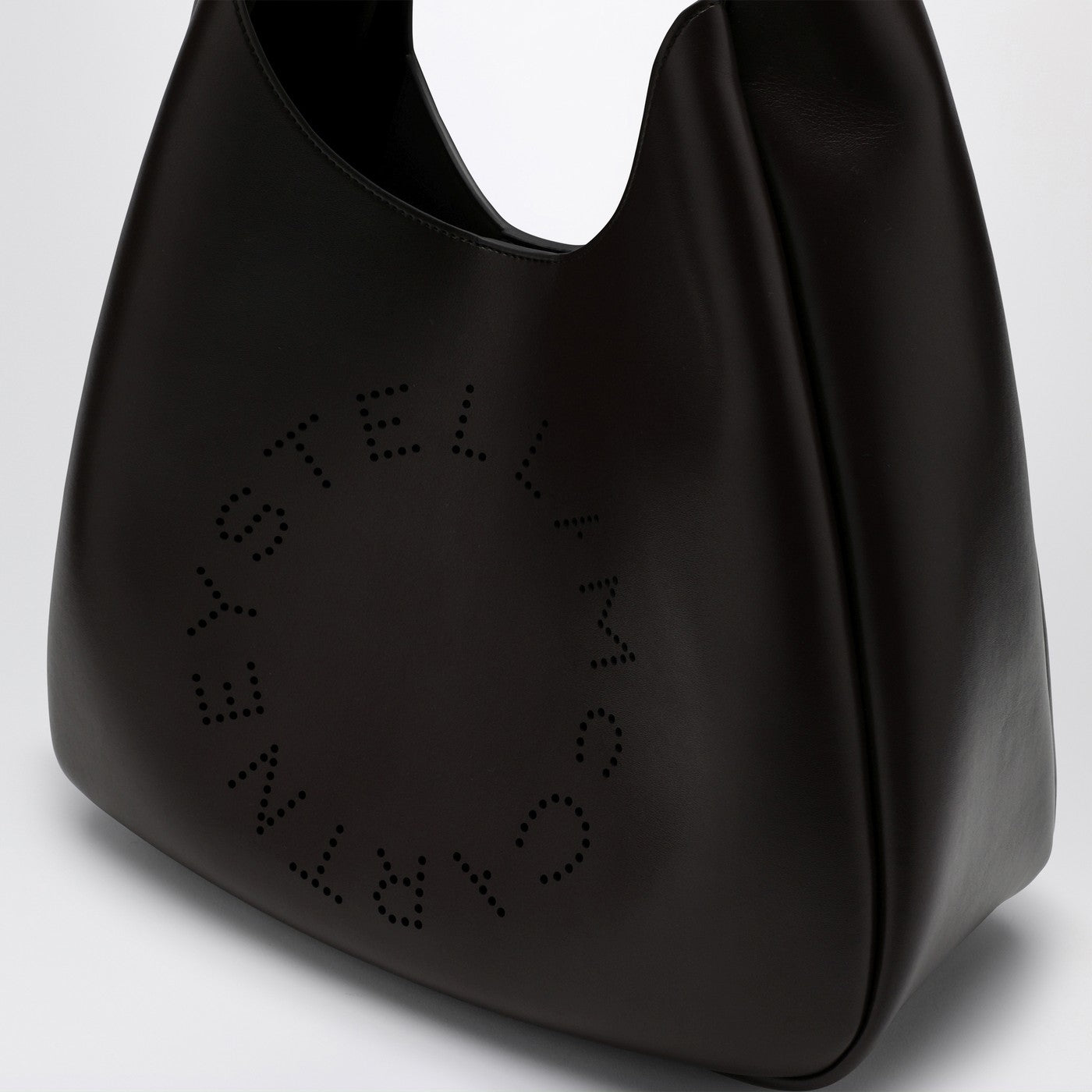 Schwarzes, weiches Kunstledertasche aus Stella McCartney mit perforiertem kreisförmigen Logo -Detail auf der Vorderseite, einem oberen Griff, einer inneren flachen Tasche und einem Pressebosenverschluss.
