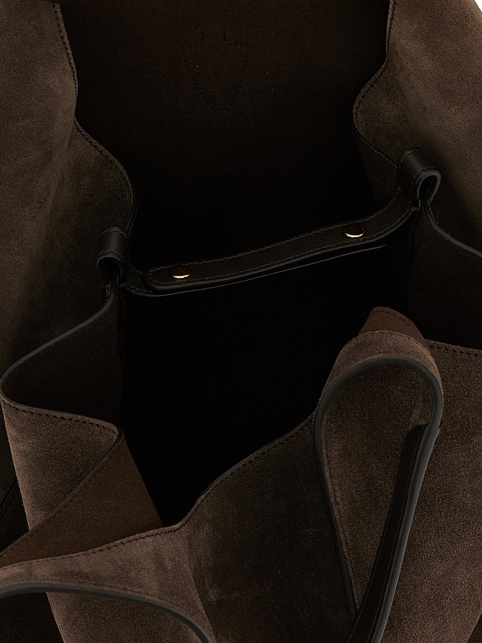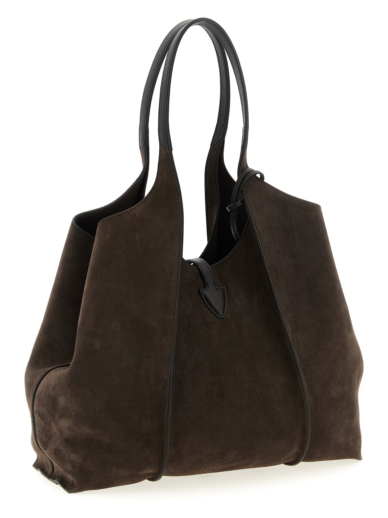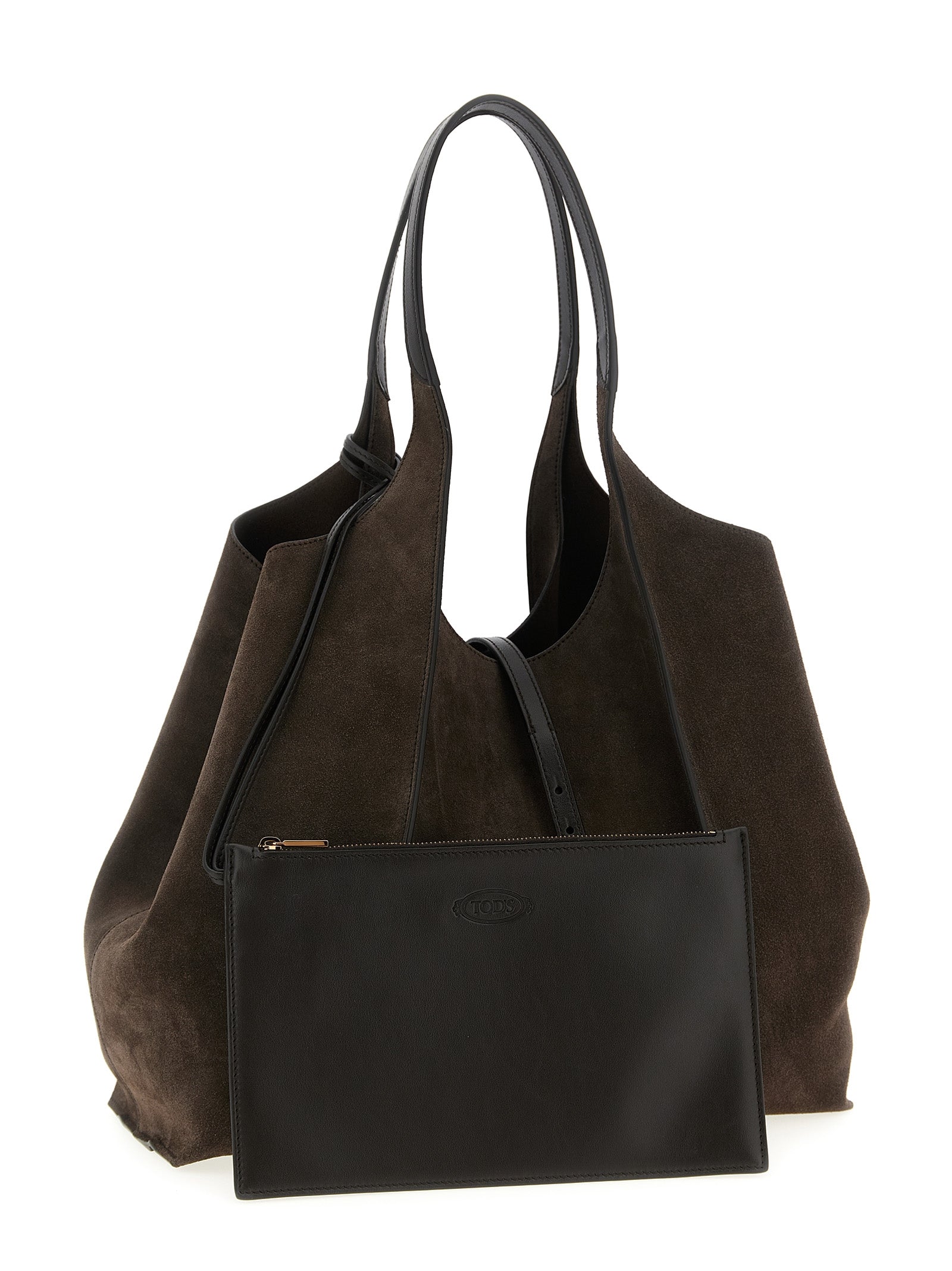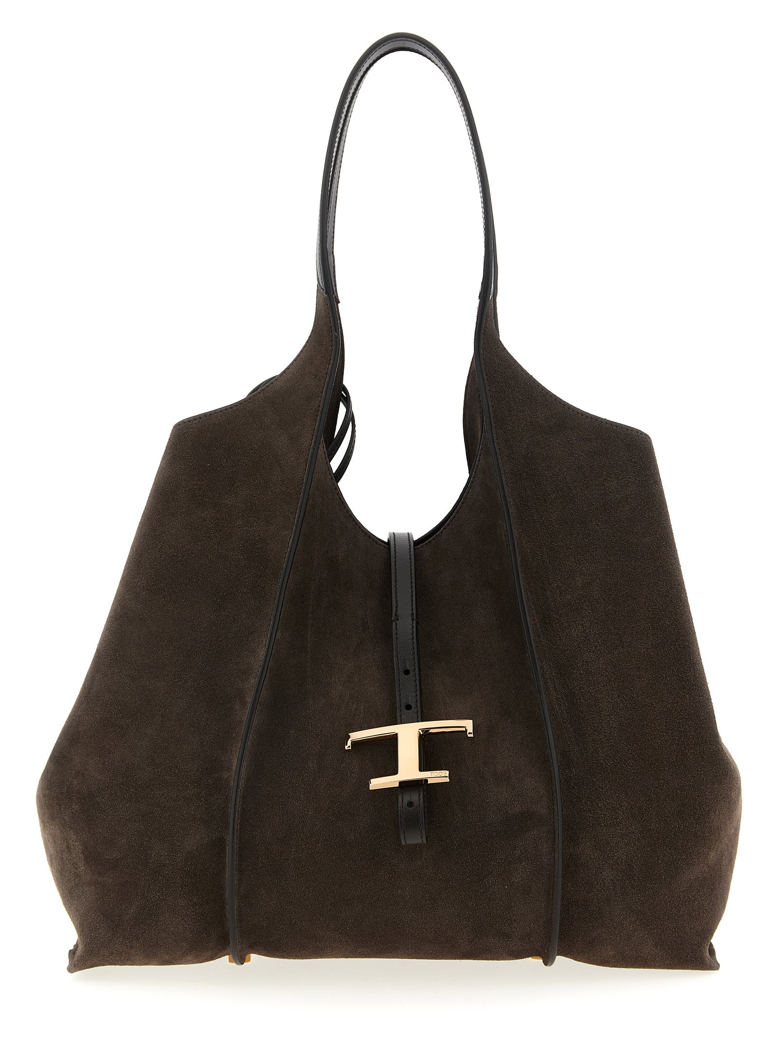 Einkaufstasche mit mittlerem Wildleder mit glatten Lederdetails, Bandverschluss und Schnappknopf mit vorderem Metall 'T Timeless', doppelter fester Griff, starre Basis mit Metallfüßen, Innenriemen, um die Breite, den abnehmbaren Schlüsselring, den abnehmbaren inneren Beutel zu ändern.