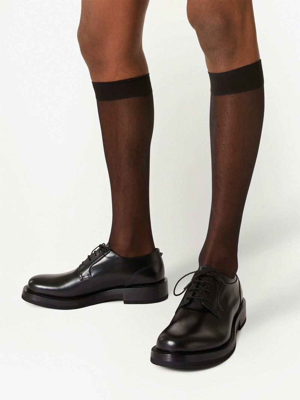 Römisch-Stud-Leder-Derby-Schuhe von Valentino Garavani mit schwarzem, Leder, Kalbleder, poliertem Finish, Signature Rockstud-Details, Logo-debossed-Zunge, runden Zeh, vorderem Schnürfalben, Marken-Leder-Innensohle, niedrig gestapelter Ferse und Gummi-Sohle.