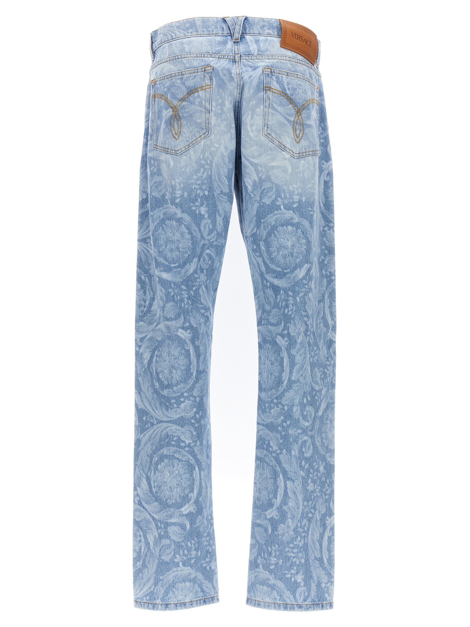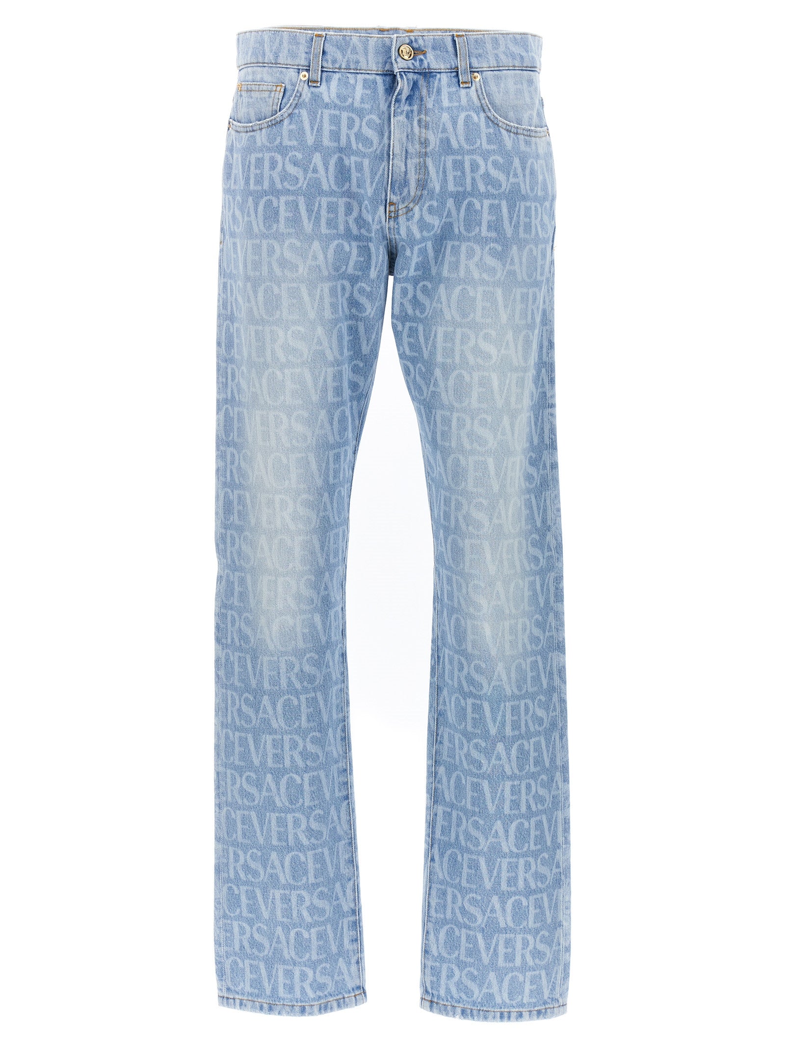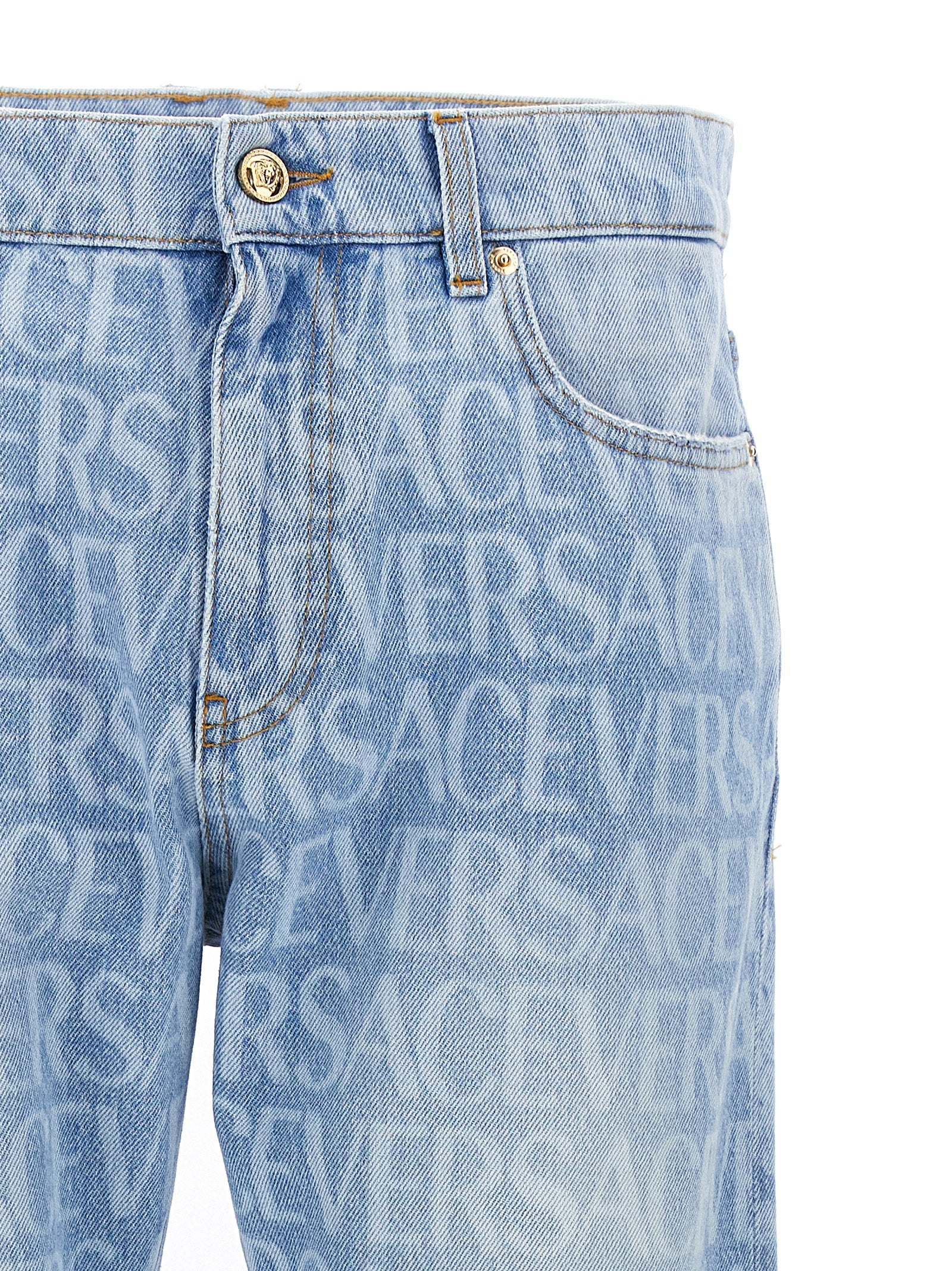 Cotton Denim-Jeans mit "Versace Allover" -Mustern auf der Vorderseite und einem Barocco-Silhouette-Muster an der Rückseite, dem Reißverschluss und dem Knopfverschluss, fünf Taschen und Details der Verwendungswirkung.