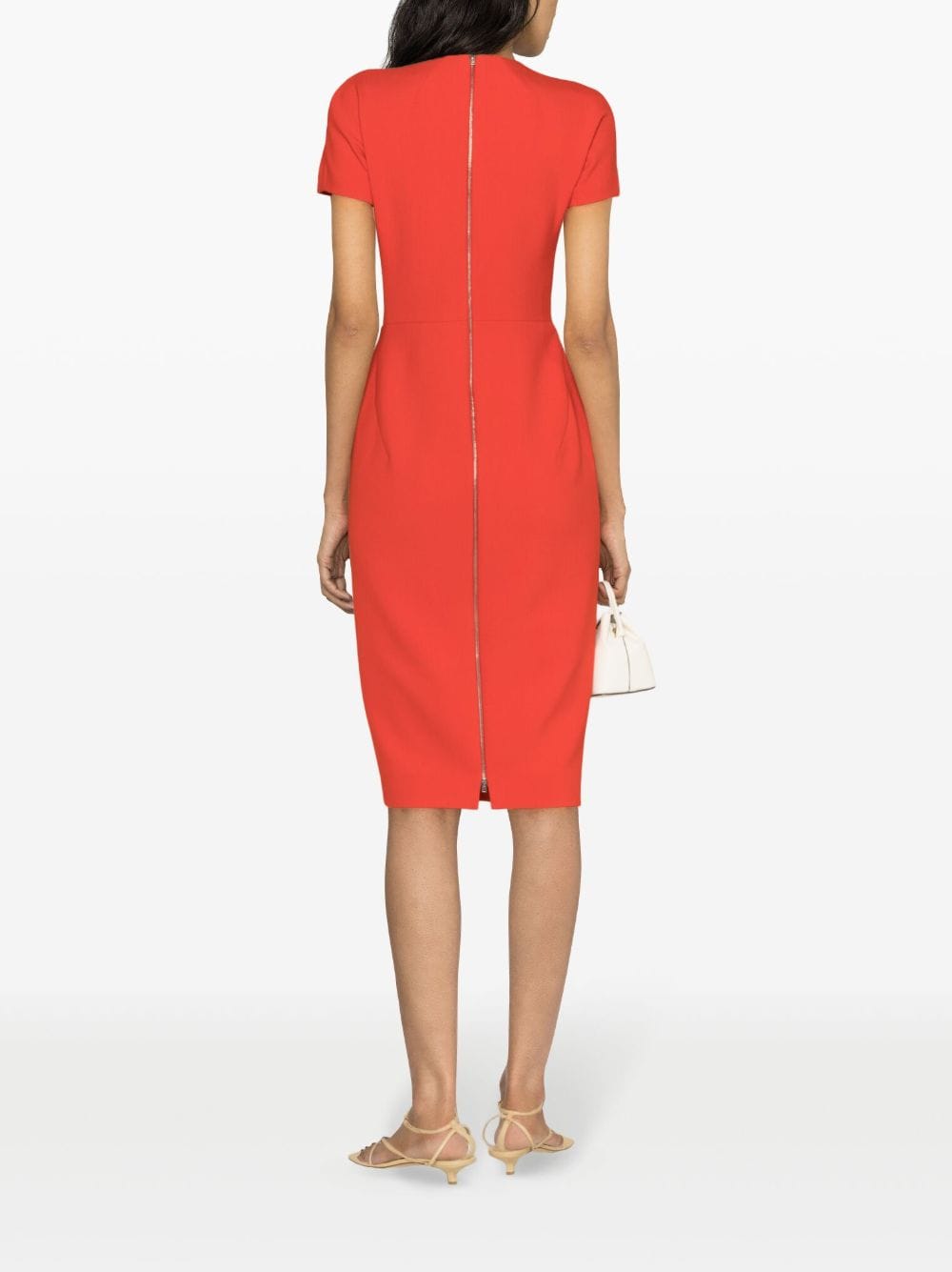 Kardinal Red Gabardine Gewebepfeil detailliert Details runder Hals Heck Heck Zwei-Wege-Reißverschluss Kurzärmel Bleistift Silhouette gerade Saum unter dem Knie Länge