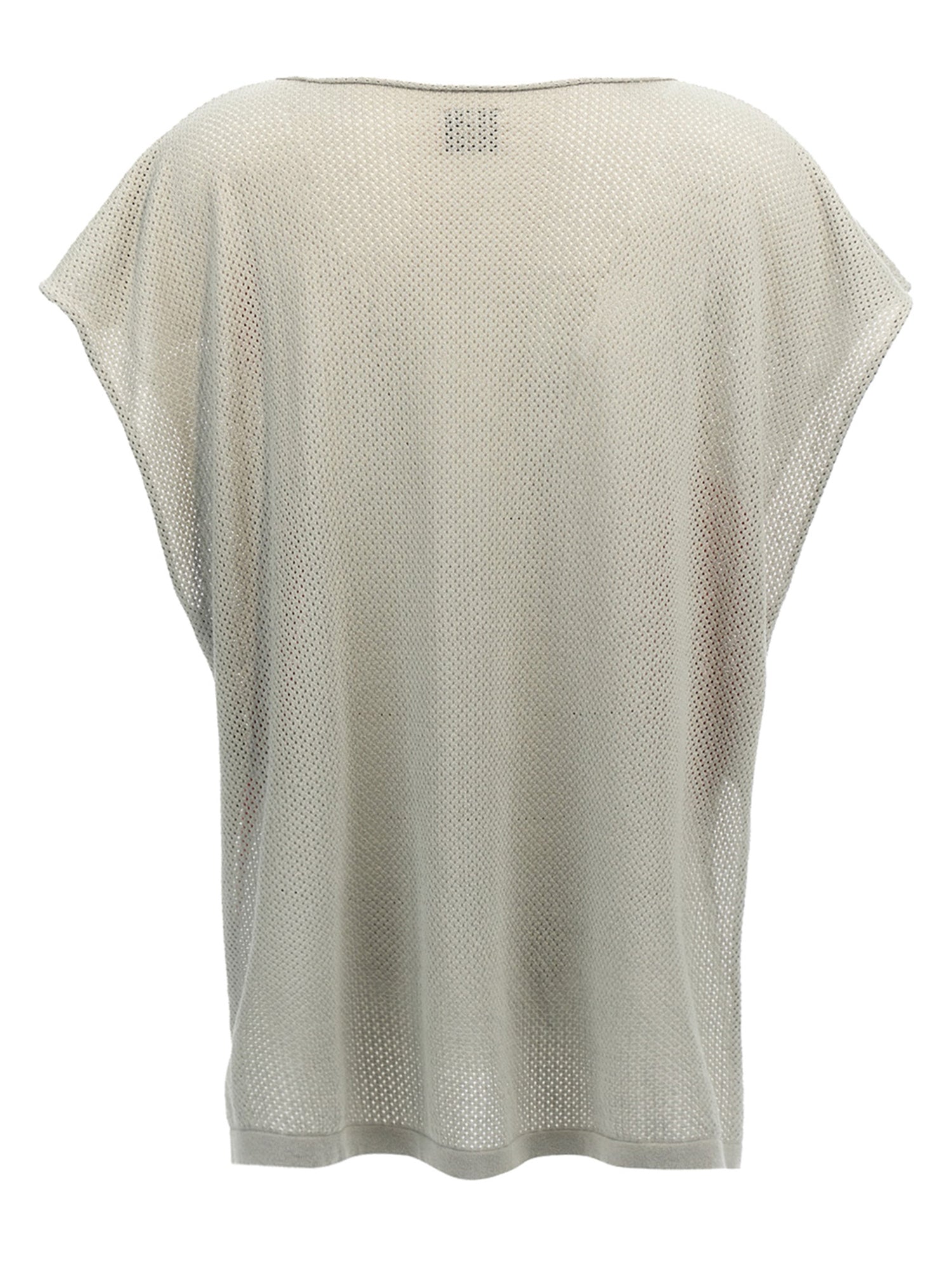 Stricktisch mit offenem Baumwolltop mit dem vorderen 'Intarsia Pixel Orb Beach' Jacquard, rohem Schnittsaum, Crew -Hals, ärmellose mit abgelassener Schulter und breiten Armlöchern, Seitenschlitzen.