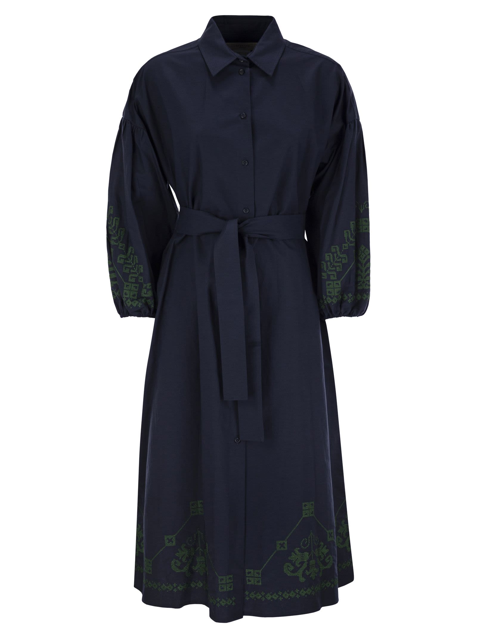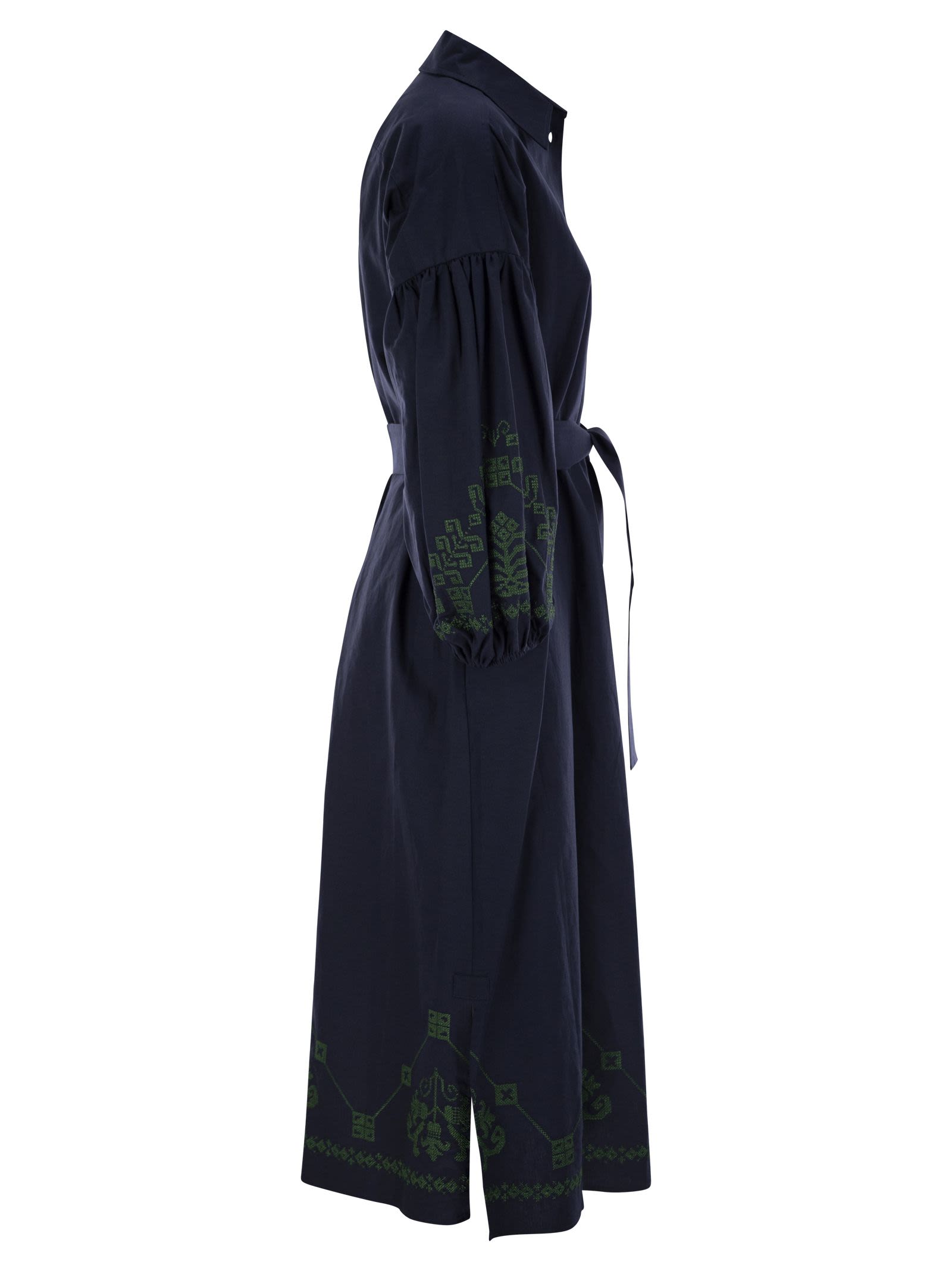 Chemisierter Kleid in leichten Baumwoll- und Leinen-Leinwand, verschönert mit kreuzgenähten Details auf den Ärmeln und dem Boden. Das Modell zeichnet sich durch breite, voluminöse Ärmeln mit abgebrochener Schulter und elastischer Manschette, klassischem Hemdkragen und Seitenschlitzen aus. Der passende Gürtel betont die Silhouette. - Exponierte Knopfbefestigung entlang der gesamten Länge - gestickte Details - Droped Schulter - reguläre Passform - Matching Belt Designer ID: 2425226141600 003