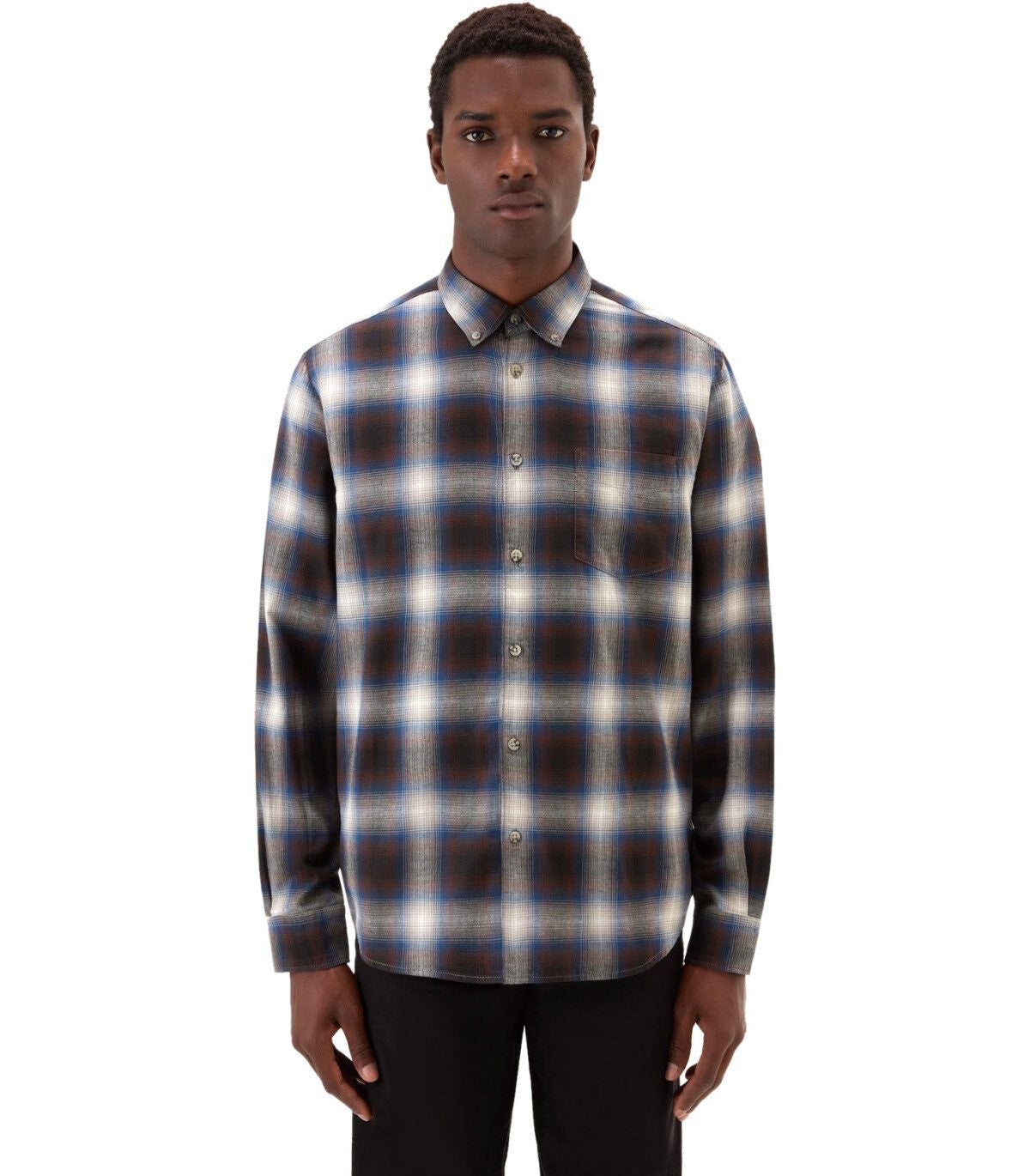 Woolrich -Hemd aus reinem Baumwollflanell mit einem Scheckmuster in braunen und blauen Schatten. Zeigt nachahmische Perlmuttertasten, eine Tasche auf der Brust und ein Logo-Etikett an der Seite. Normale Passform. Das Modell ist 187 cm groß und trägt eine Größe L. Zusammensetzung: 100% Baumwolle.