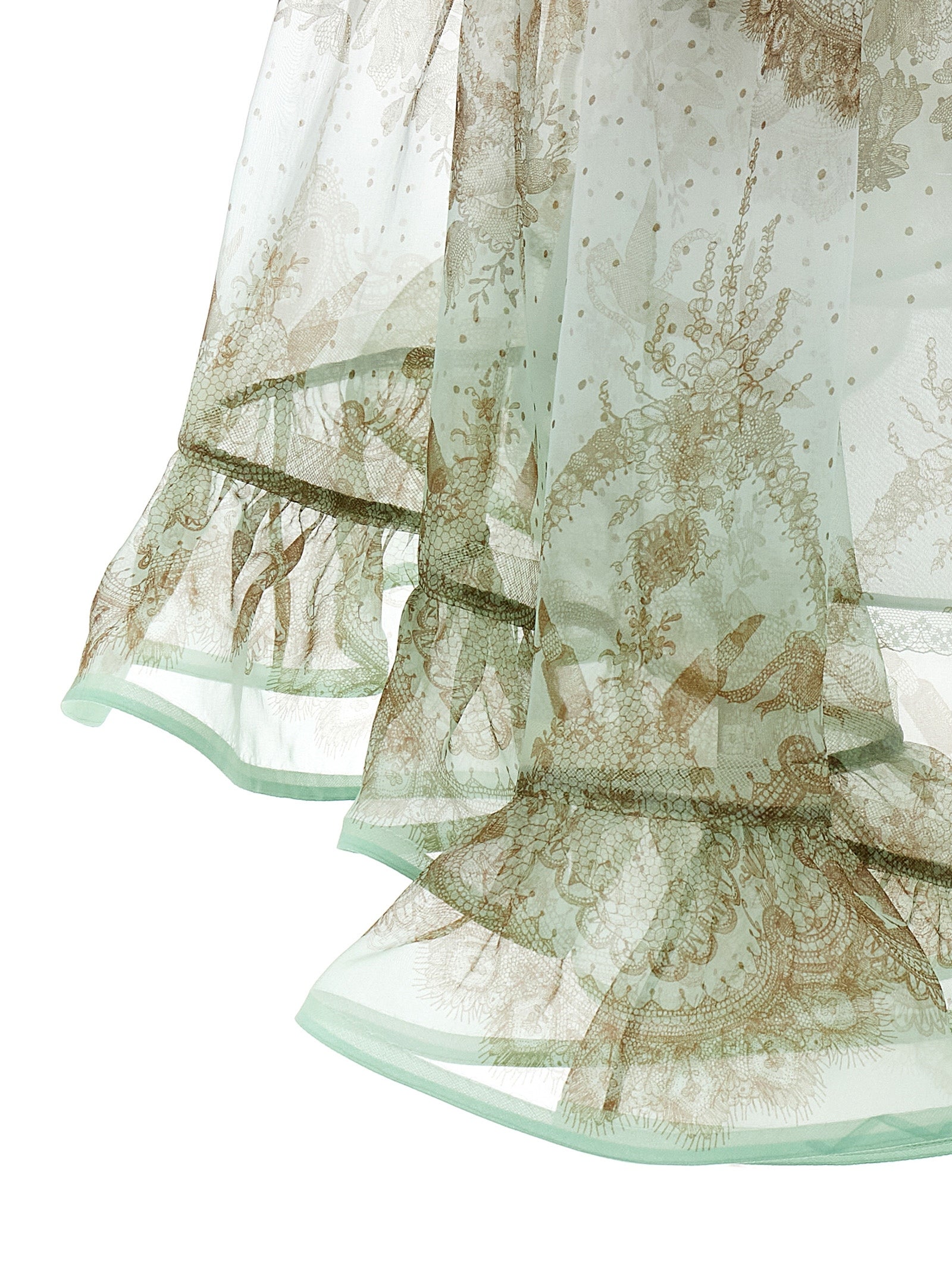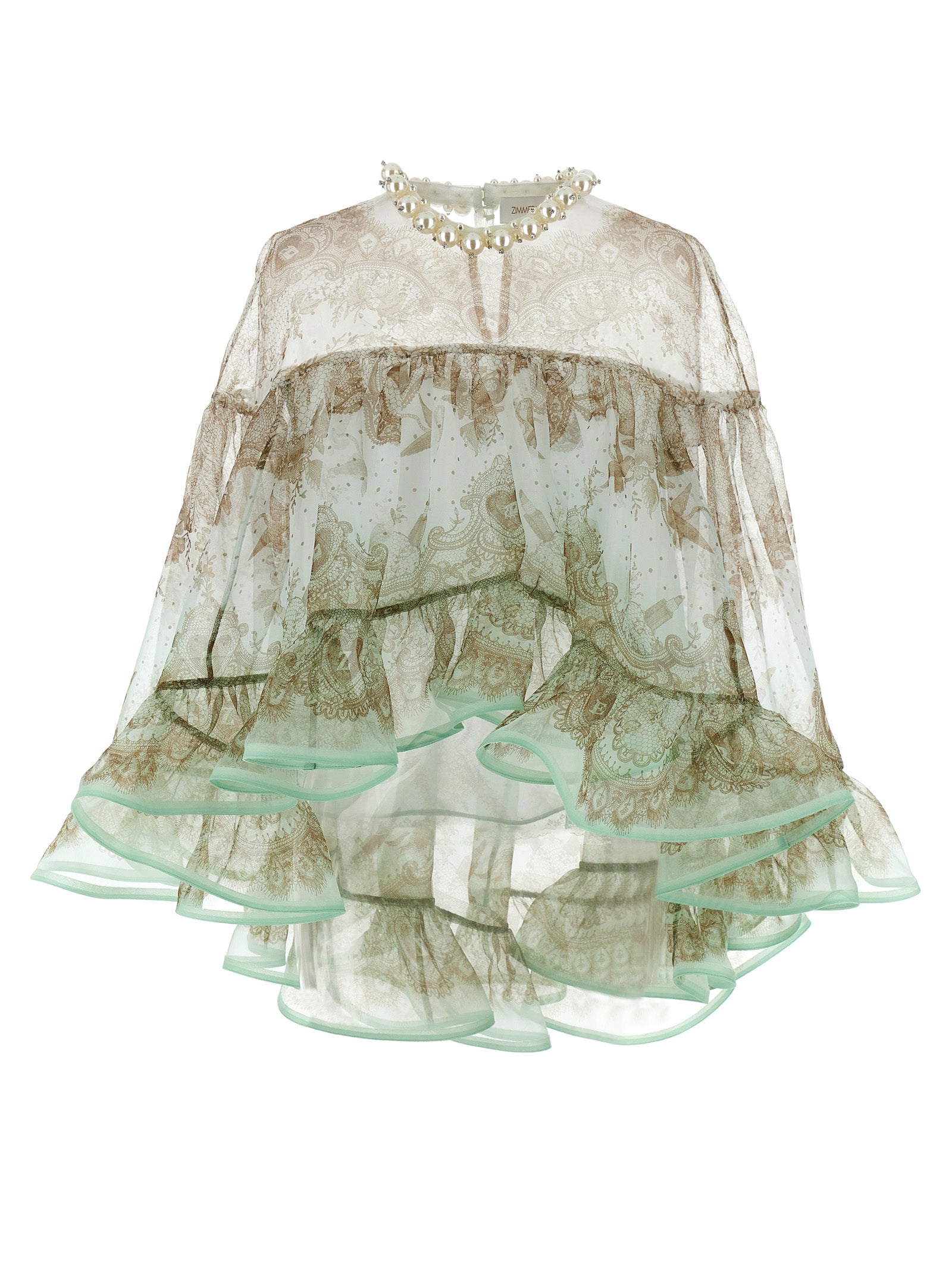 "Crush-verziert" Leinen- und Seidenorganza-Bluse mit Spitzendruck Ich sehe nicht, Crew-Hals mit Perlen und Kristallen, Rüschenärmel, Crinolin am Saum, Rückenknopfverschluss mit ausgeschnittenem Detail,