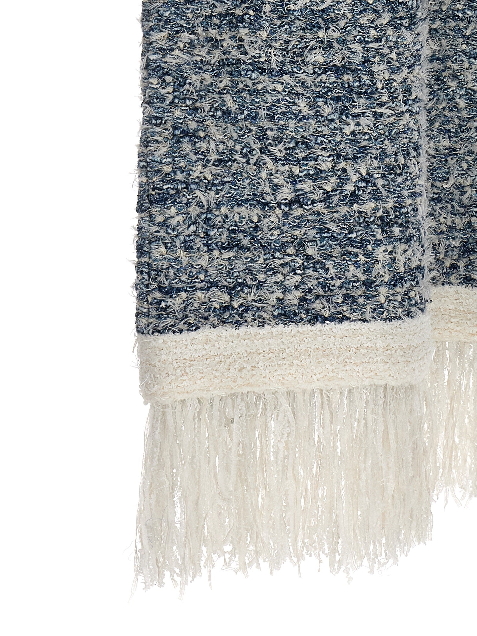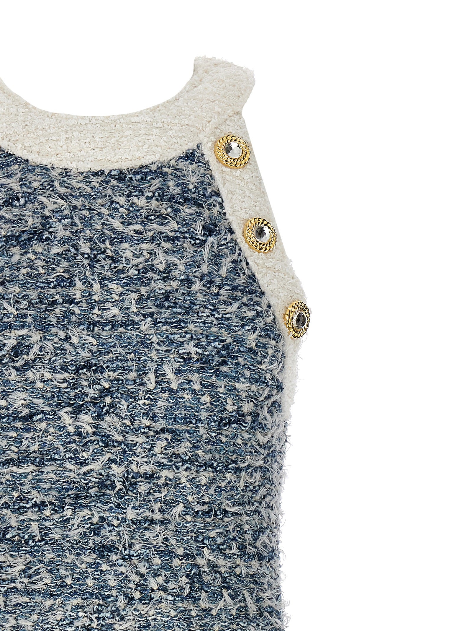 'Fringed Tweed' tweed dress with front jewel button appliqué, sleeveless model with fringes on the hem, back zip closure.