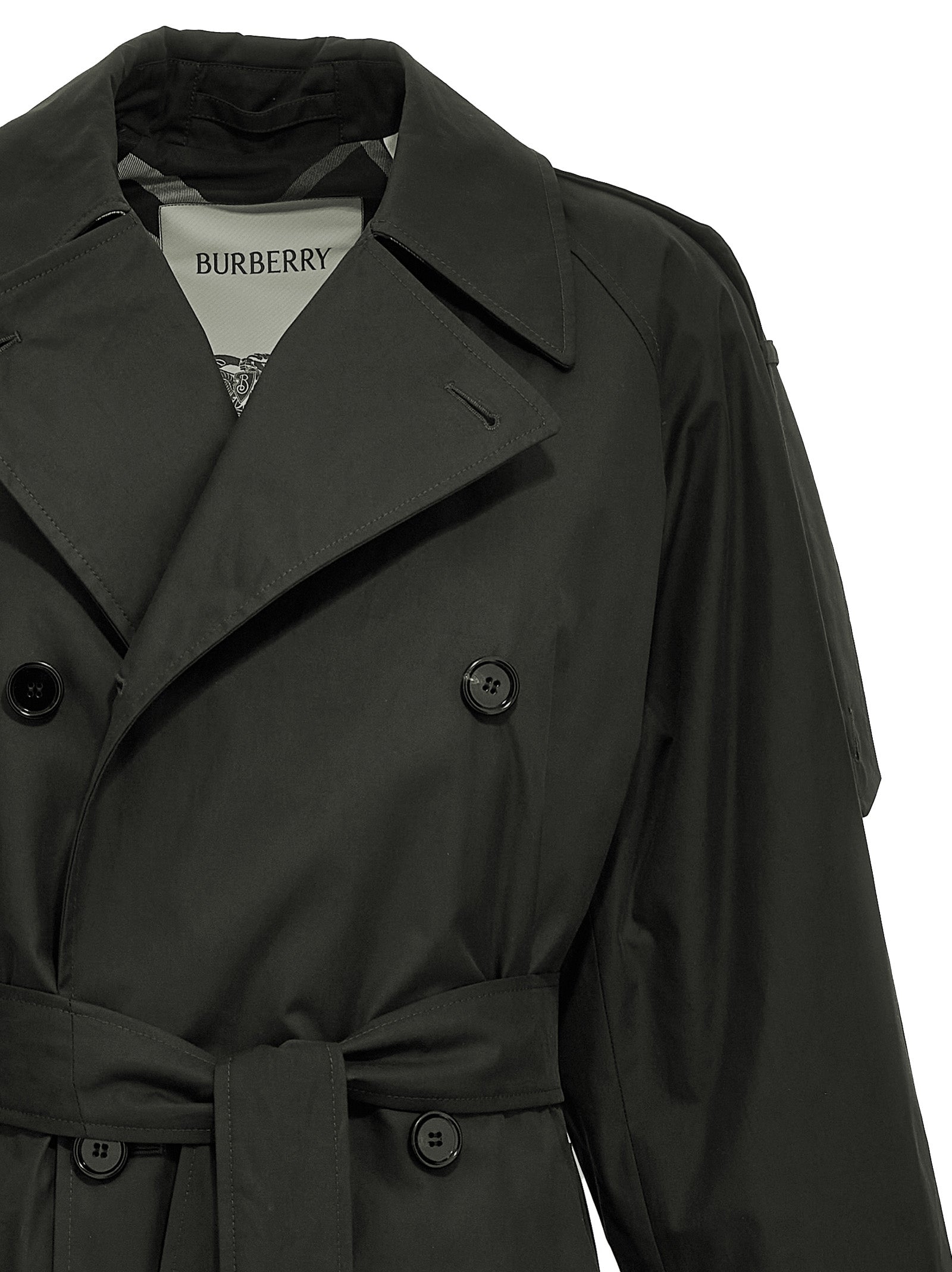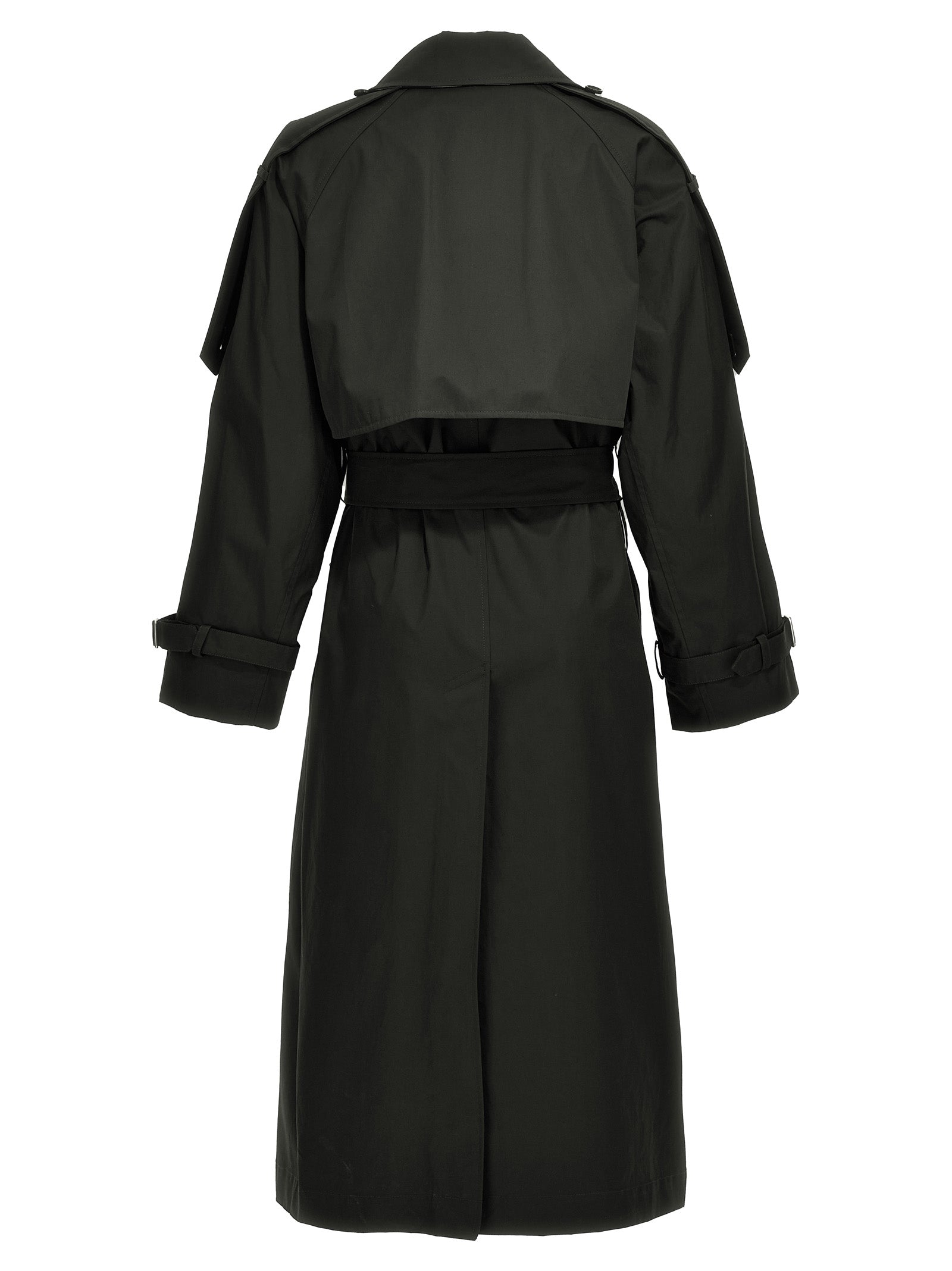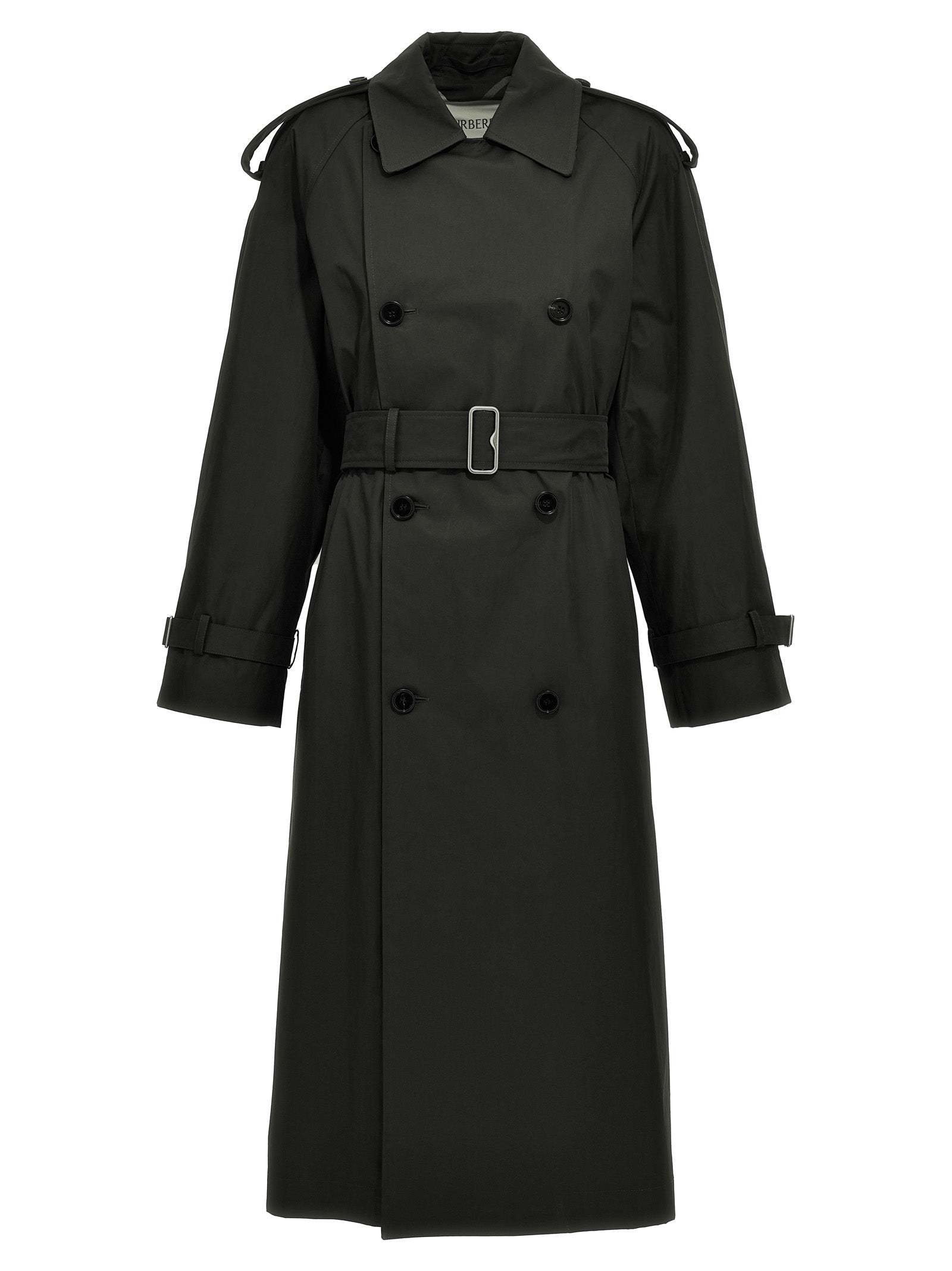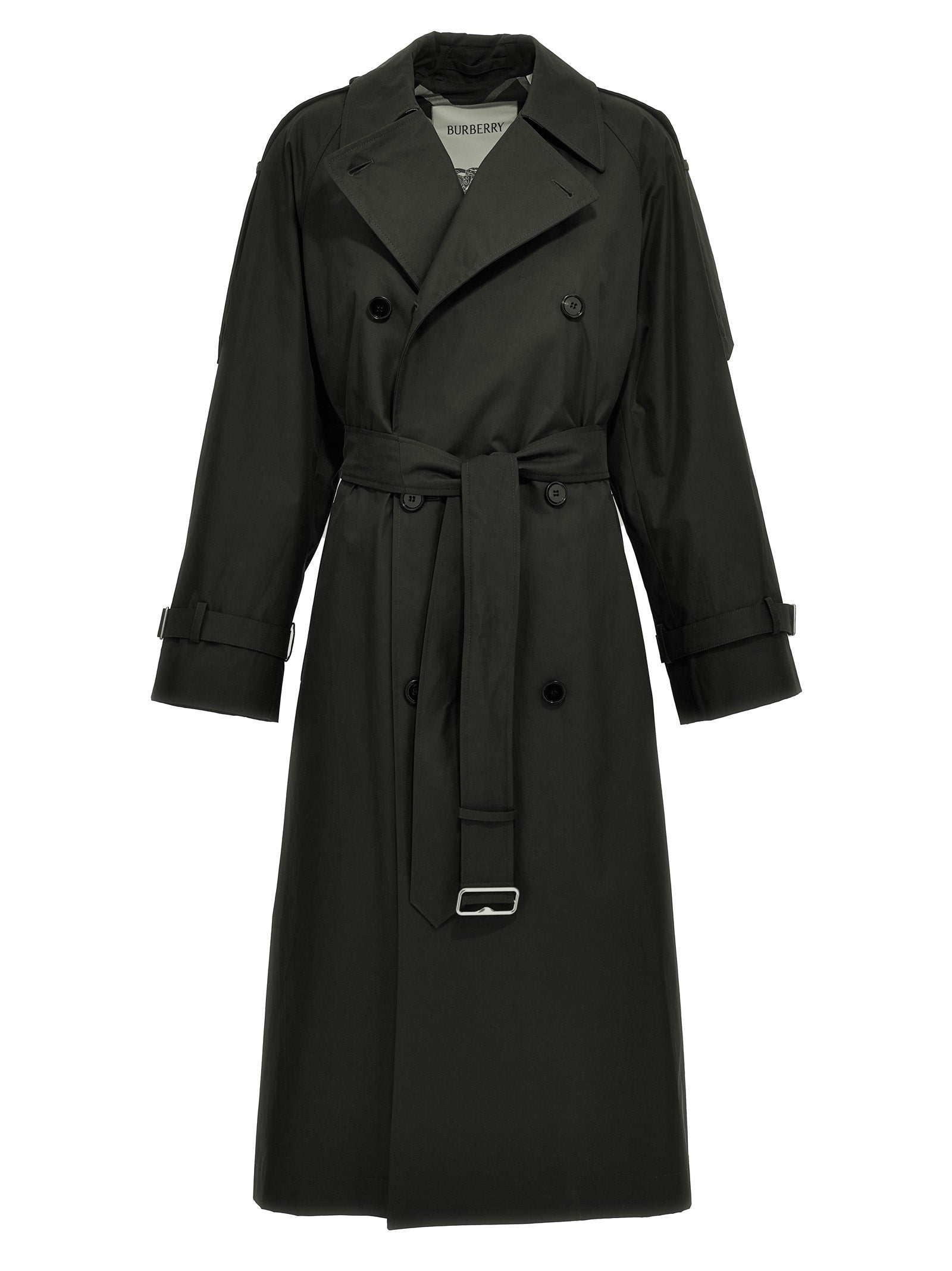 Long cotton gabardine trench coat with double-breasted closure and adjustable and removable waist belt.