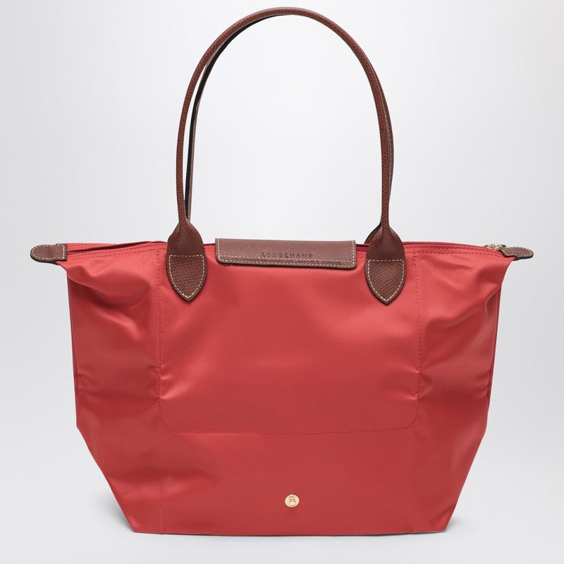 Medium shoulder bag by Longchamp in tomato red econyl recycled polyamide canvas with brown leather details, featuring two top handle, foldover top with magnetic closure, zipper closure and main compartment.