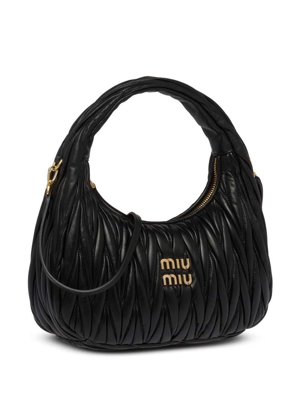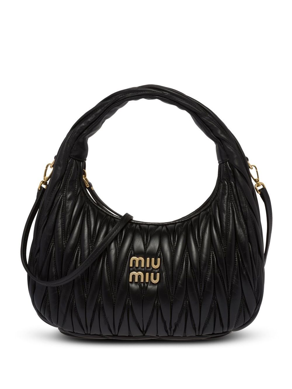 Miu Miu's Wander hobo bag is made of leather with matelassé workmanship with metal logo.