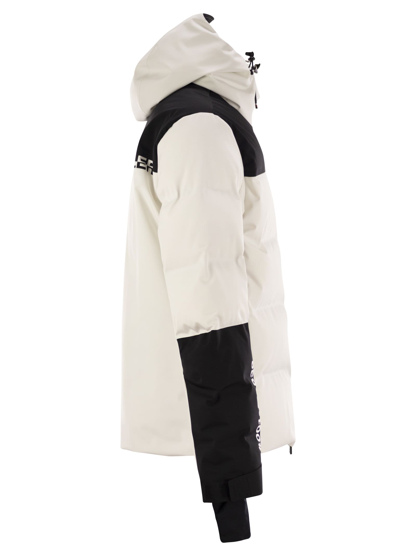 Designed for alpine skiing, the Curtis down jacket is made of water- and wind-resistant fabric. The model features 4-way stretch nylon inserts for maximum freedom of movement. To ensure warmth even in the most extreme conditions, this short down jacket features PrimaLoft® insulation and heat-taped seams. This warm hooded garment boasts several technical details designed for the ski slopes, including a Recco® reflector for added safety and a windproof gaiter. - Water-repellent - Waterproof - Windproof - Insulating - Breathable - Designed for alpine skiing - Made of technical 4-way stretch fabric - Lining in technical stretch nylon - Yoke and sleeve patches in 2L 4-way stretch technical nylon - Padded model - PrimaLoft® Active Insulation on back, sides, underarm and hood - Taped seams - Adjustable hood with visor - Back yoke - Underarm vents - YKK® AquaGuard® Highly Water-Resistant zip closure - External YKK® AquaGuard® Highly Water-Resistant zipped pockets - Inside pocket for smartphone - Ski pass pocket - Windproof body gaiter - RECCO® reflector - Adjustable cuffs - Cuffs with elasticised jersey gaiters - Bottom hem with elasticated drawstring - Laser-cut and adhesive logo details - Embossed silicone logo - Slim fit DESIGNER ID: J20971A00022M4839 21D