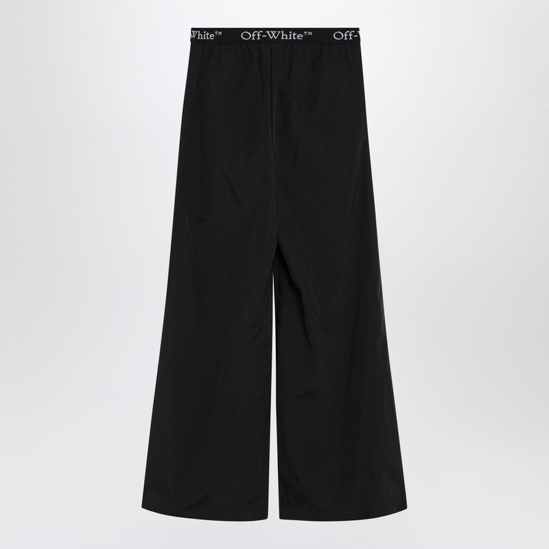 Wide Off-White pants in black nylon, featuring a high elasticized waist with contrasting logo lettering and two side welt pockets.