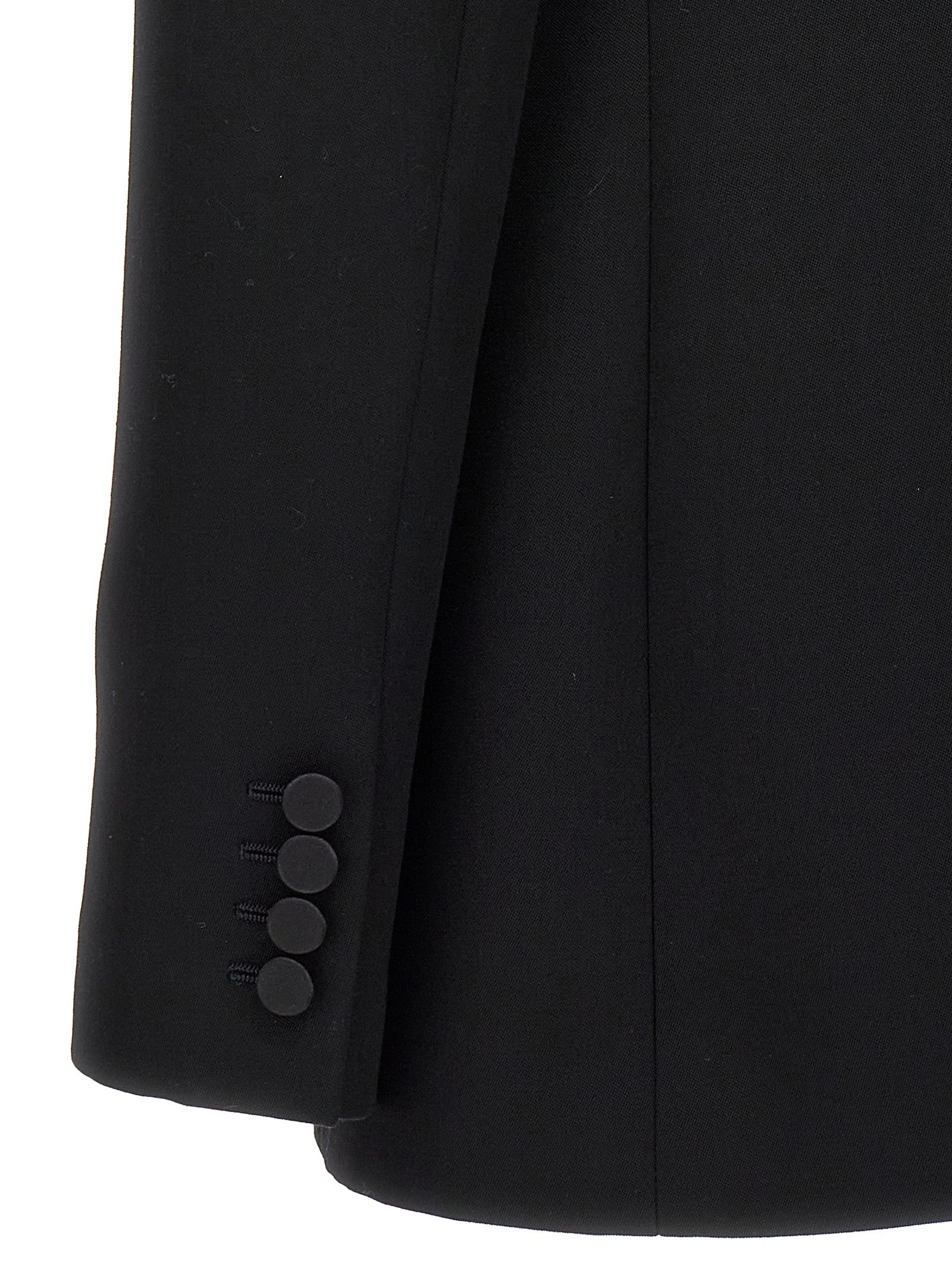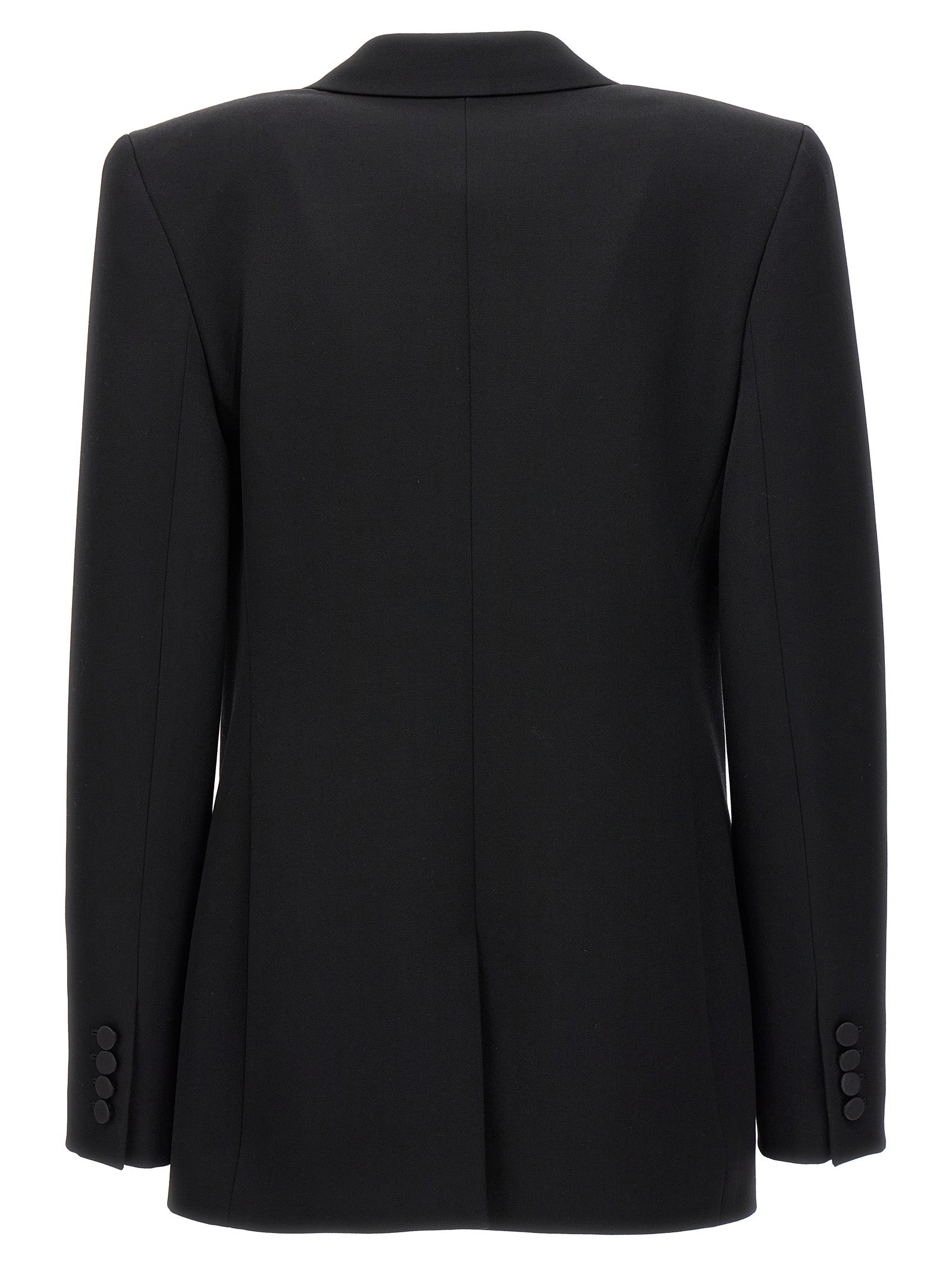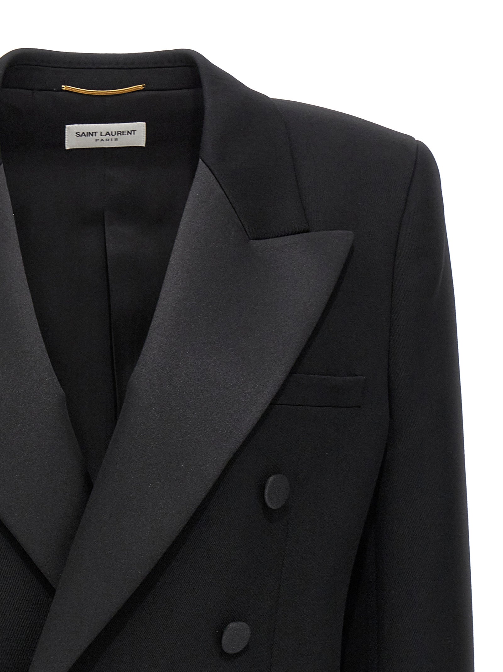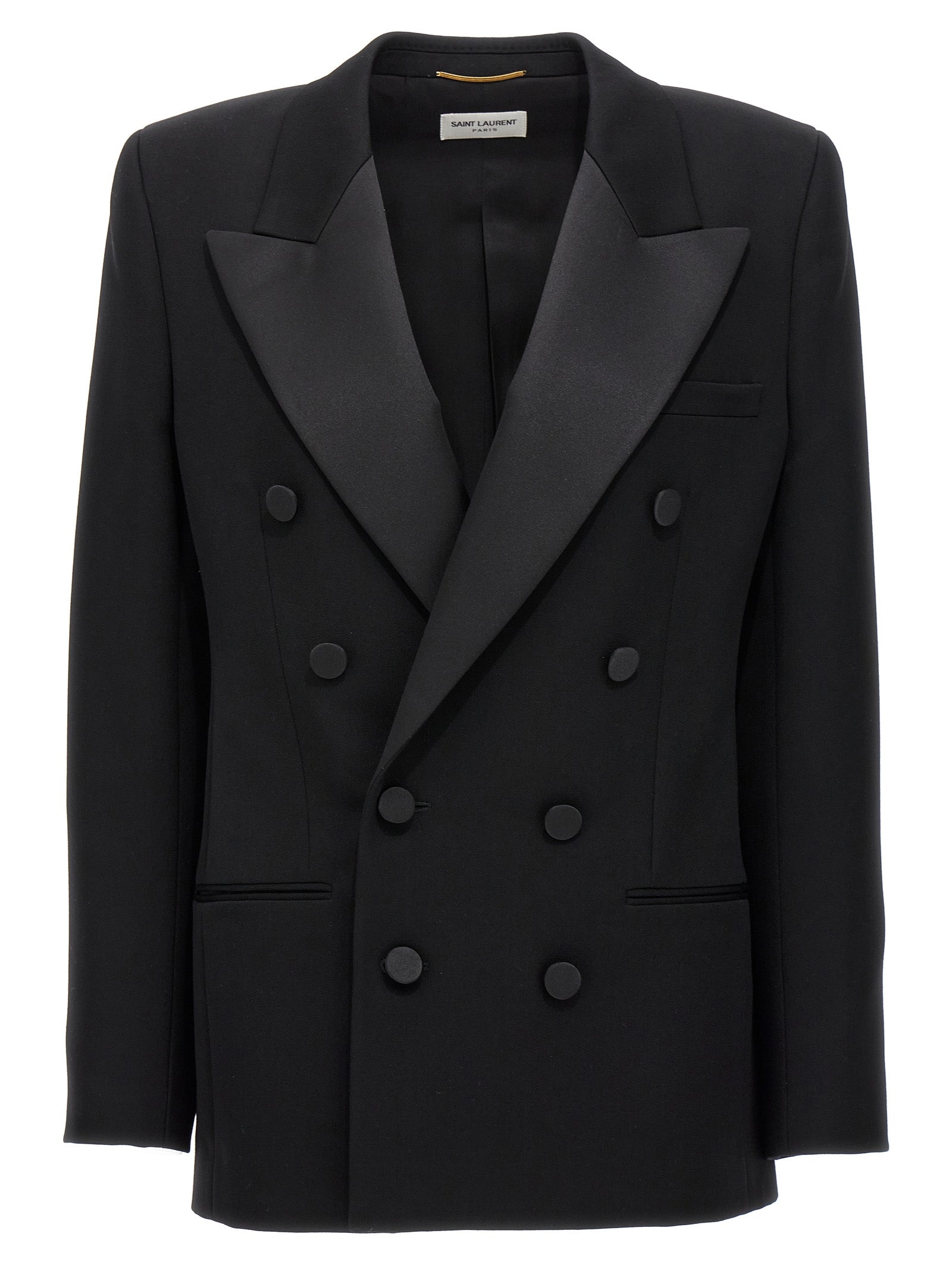 'Leger Armure' double-breasted wool blazer with satin lapels, button closure, pockets, padded shoulders, long sleeves, back vent.