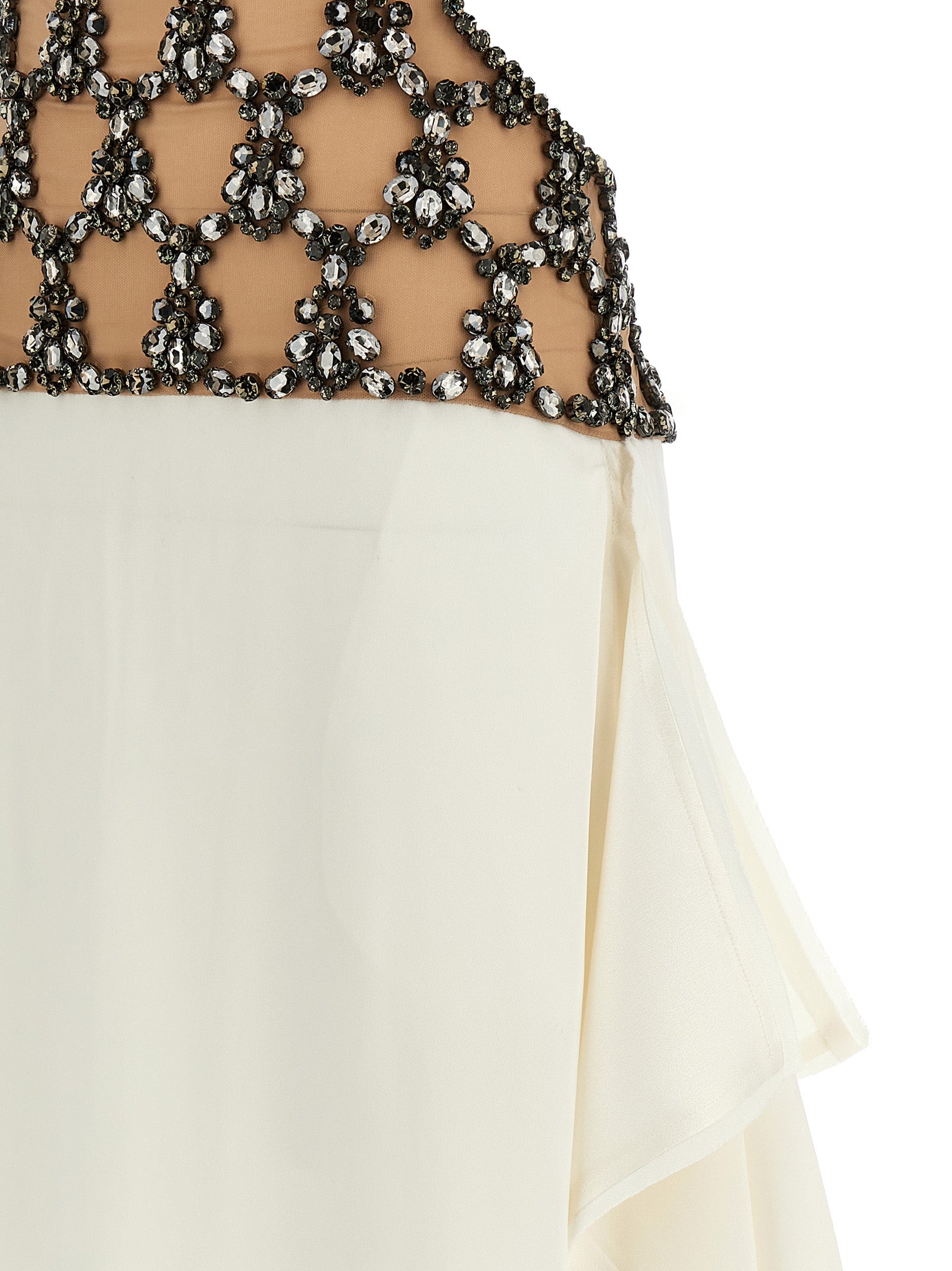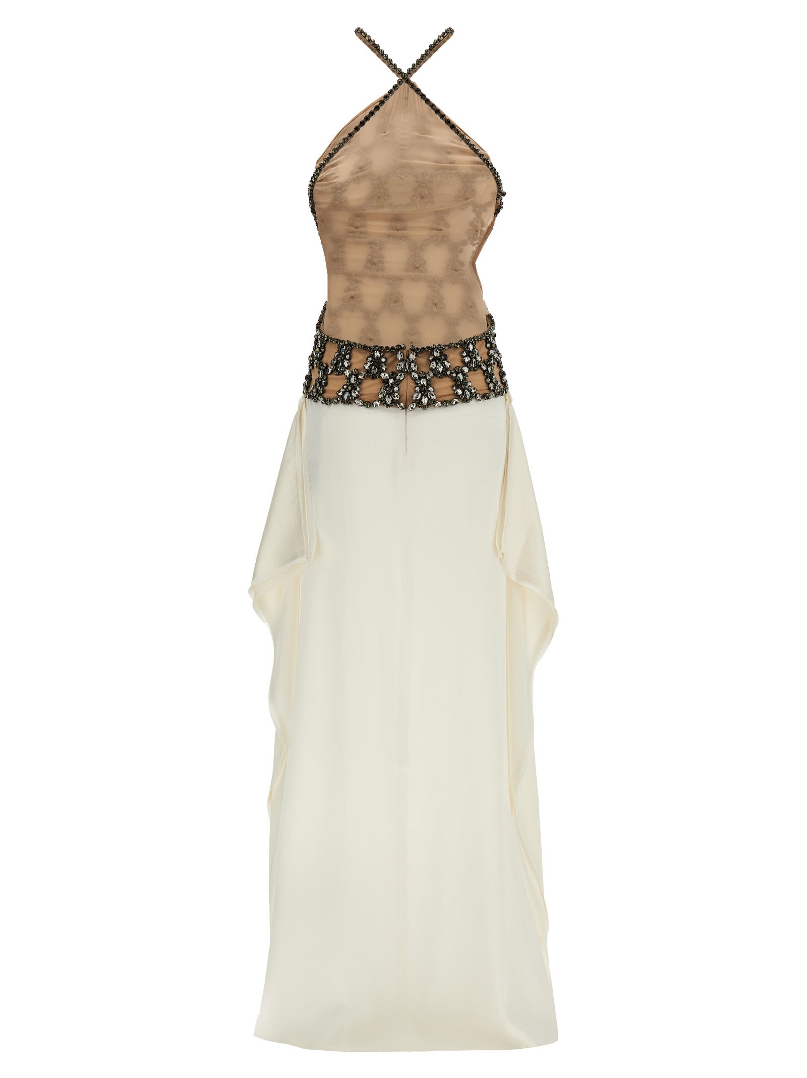 Sleeveless dress in viscose blend with crystal cage top, bare back, and back zip closure.