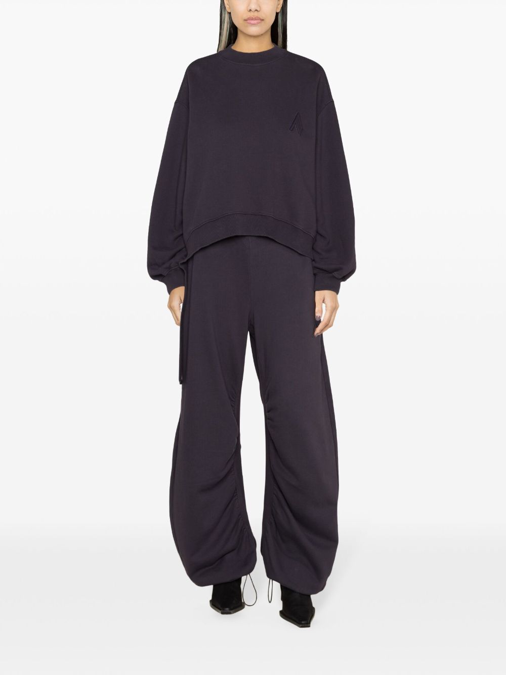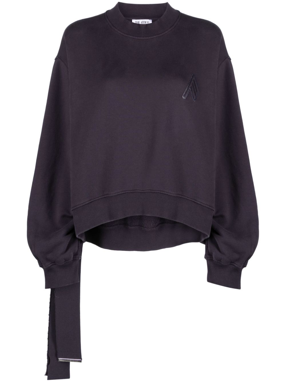 dark purple cotton jersey texture ruched detailing to the sleeves draped strap detailing to the hem appliqué logo to the front crew neck drop shoulder long sleeves ribbed cuffs and hem high-low curved hem fleece lining
