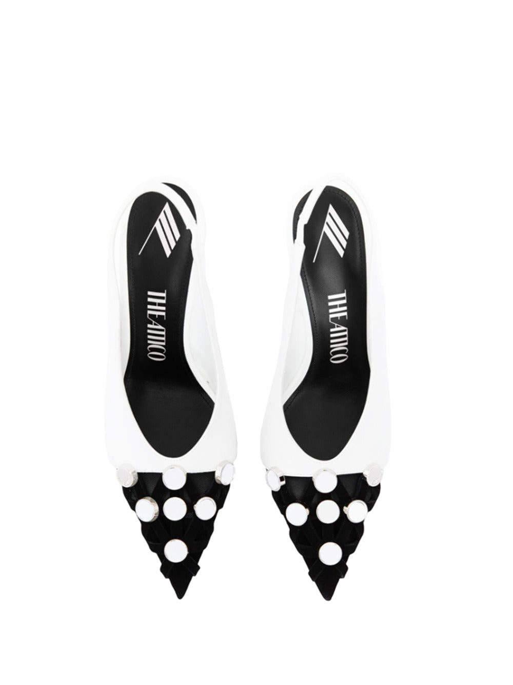 ``Fiona`` slingback in white and black nappa and suede with mirror application, 105mm high heel. Made in Italy.