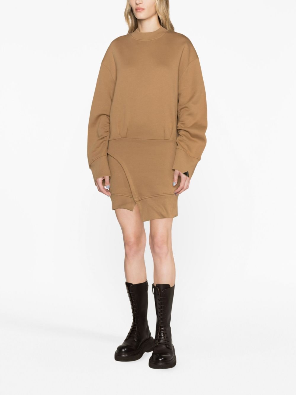 Ivory cotton sweatshirt dress from The Attico featuring camel brown, cotton, jersey knit, crew neck, long sleeves, ruched detailing, silver-tone logo plaque, ribbed-knit edge, asymmetric hem and thigh-length.