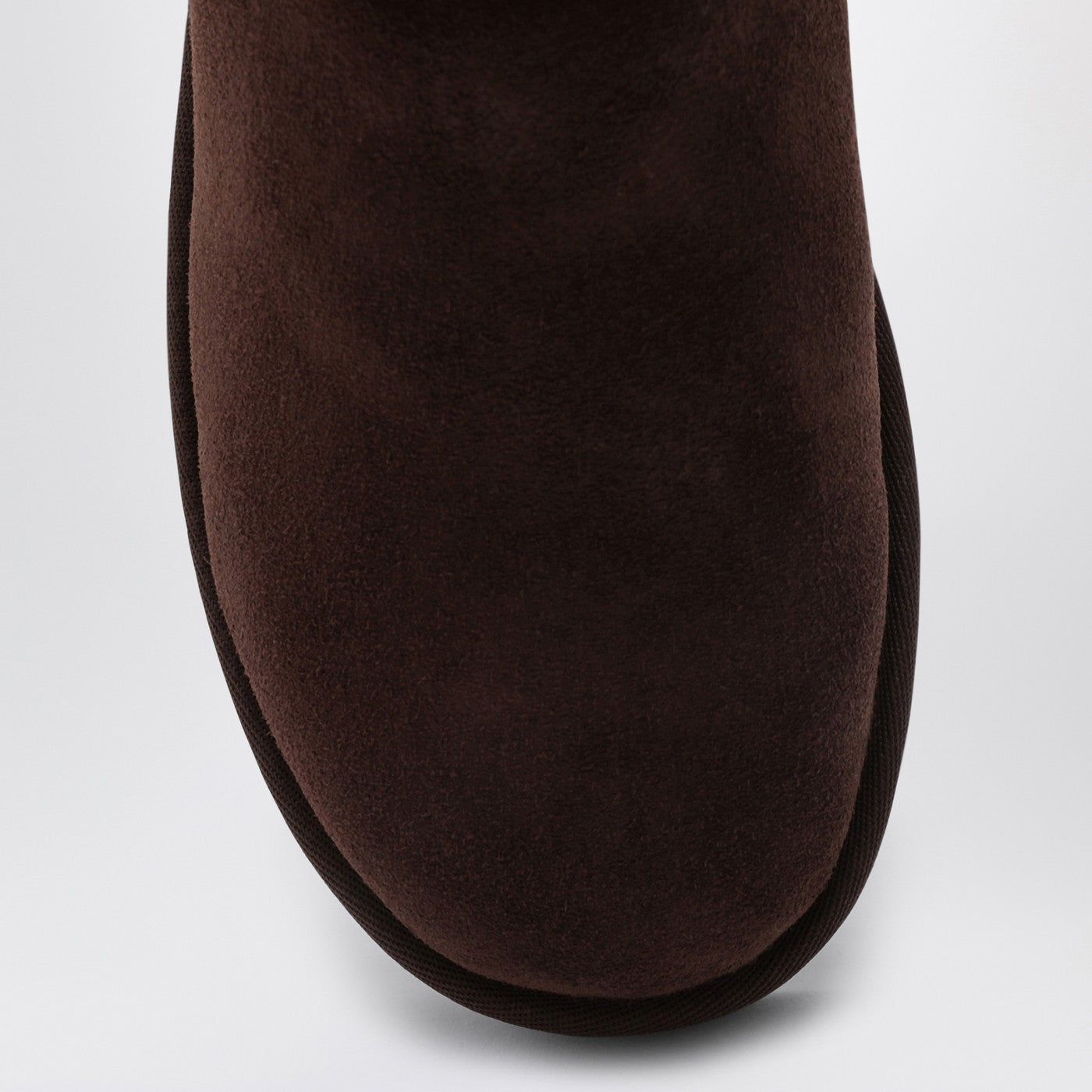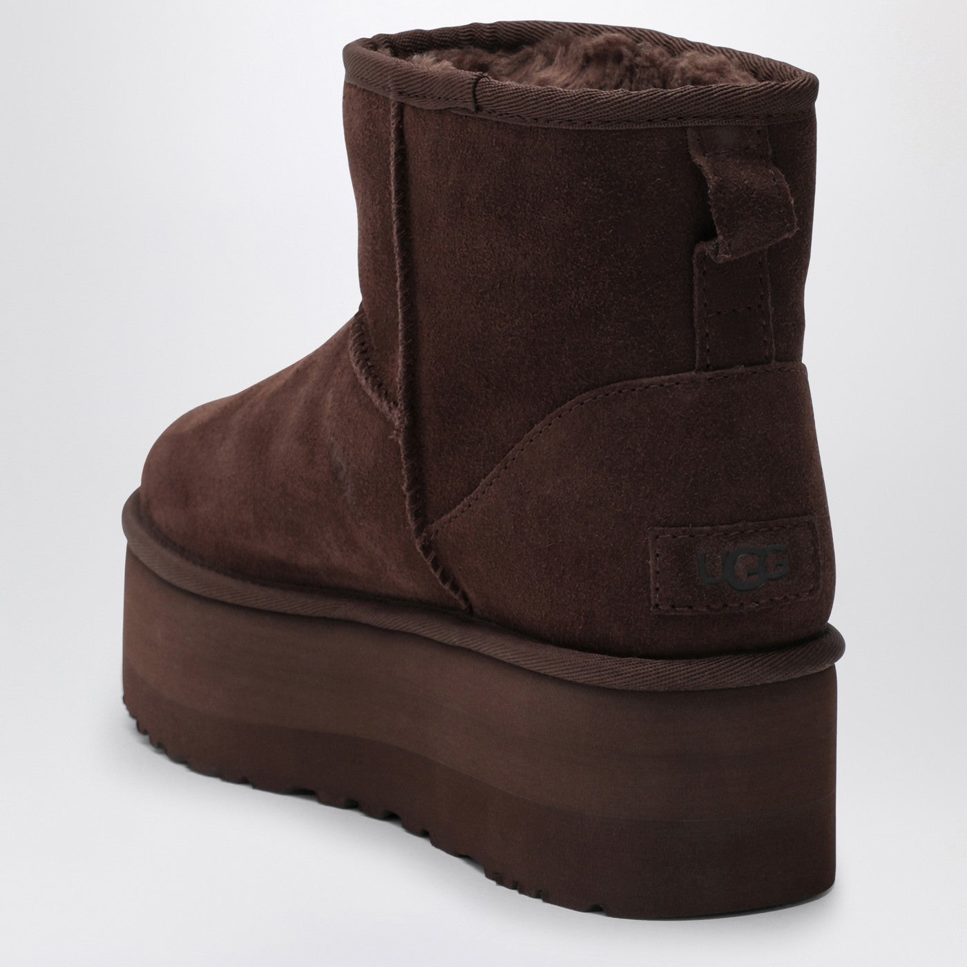 Brown suede ankle boot from UGG featuring a sheepskin and suede upper, round toe, back puller, sheepskin insole and a 5.1 cm platform sole. Leg height: 12.7 cm.