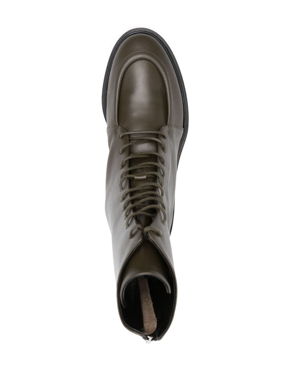 olive green calf leather panelled design round toe front lace-up fastening ankle-length rear zip fastening low stacked heel
