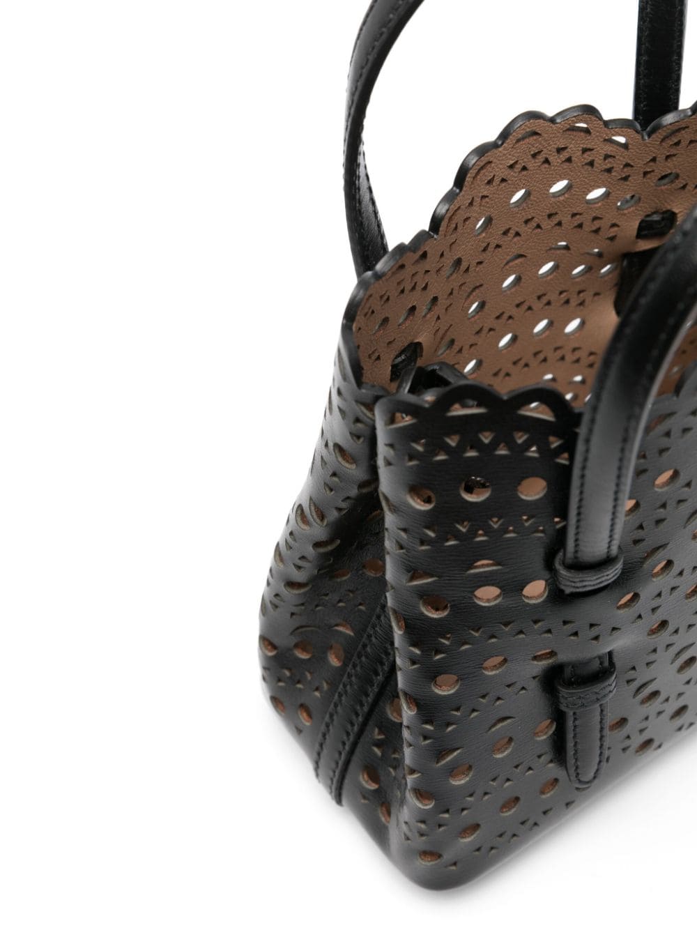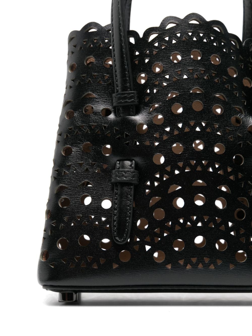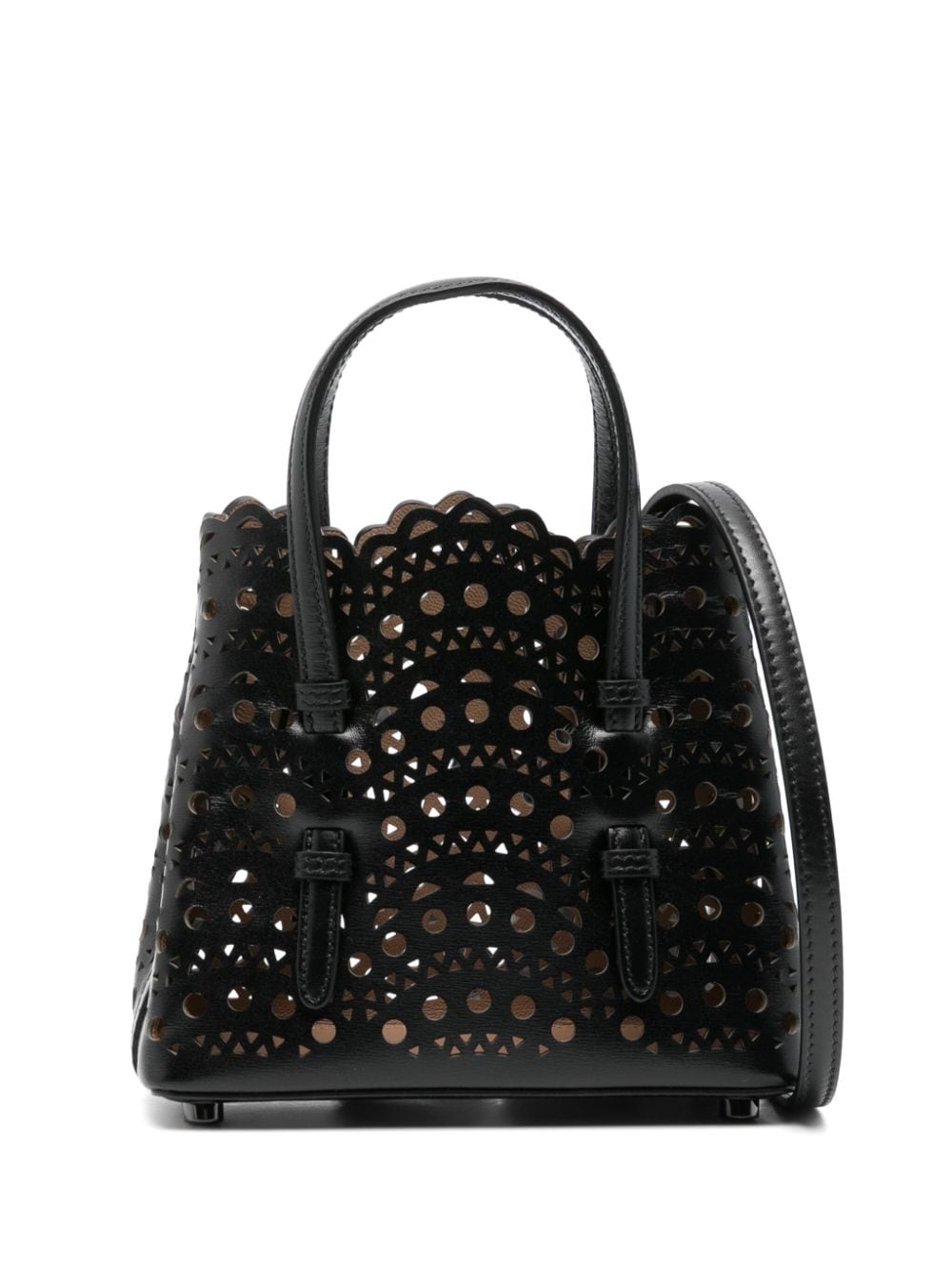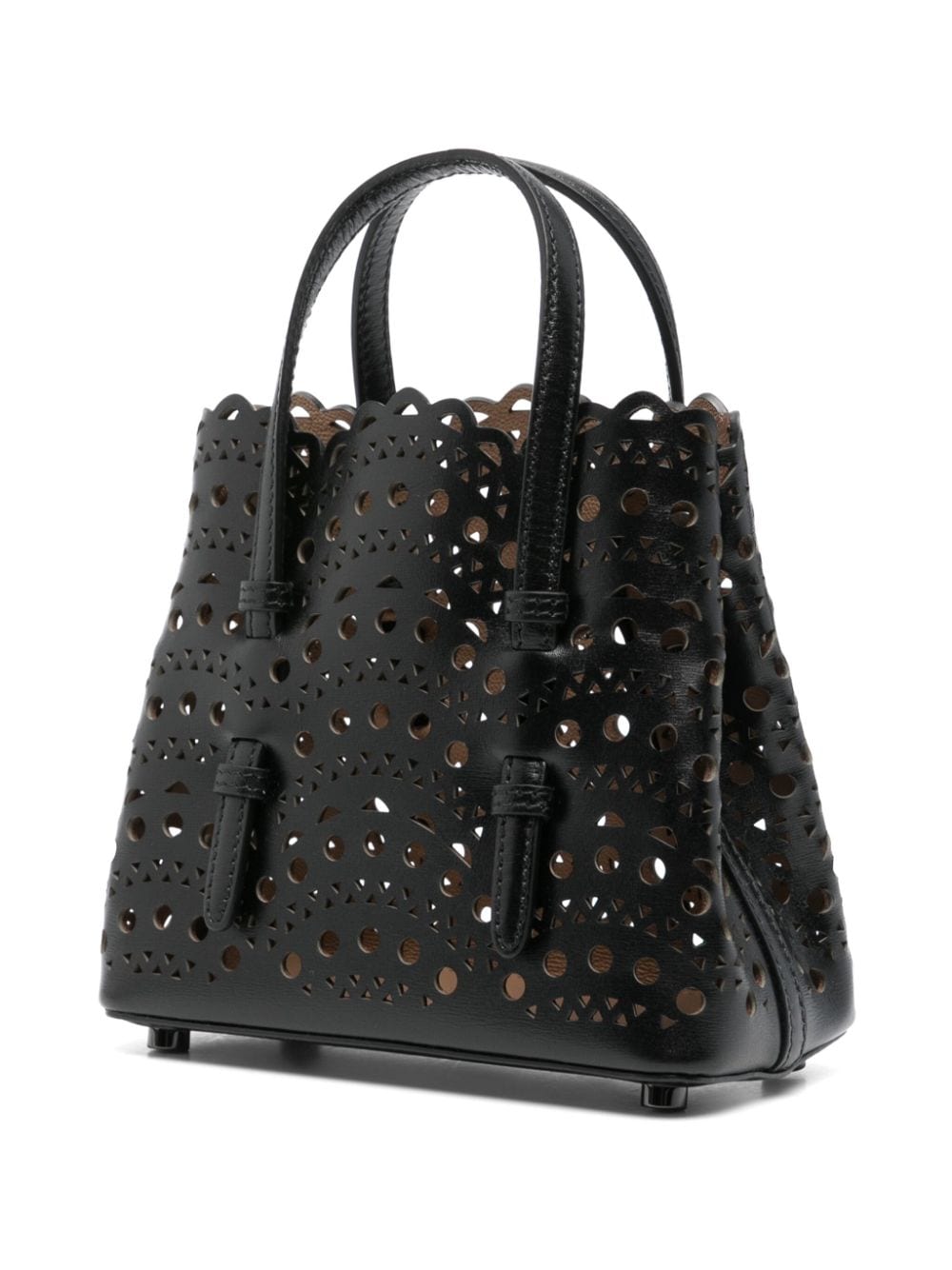 Black calf leather micro Mina tote bag from ALAÏA featuring laser-cut detail, scalloped edge, two rounded top handles, adjustable detachable shoulder strap, internal mirror, main compartment and metal feet.