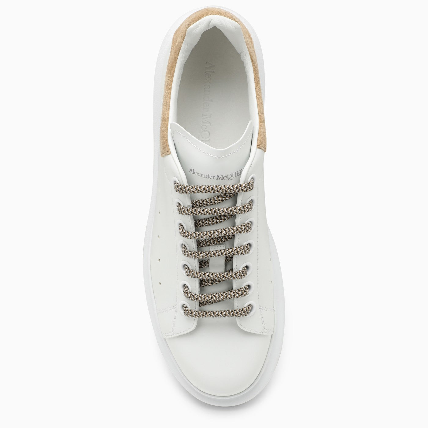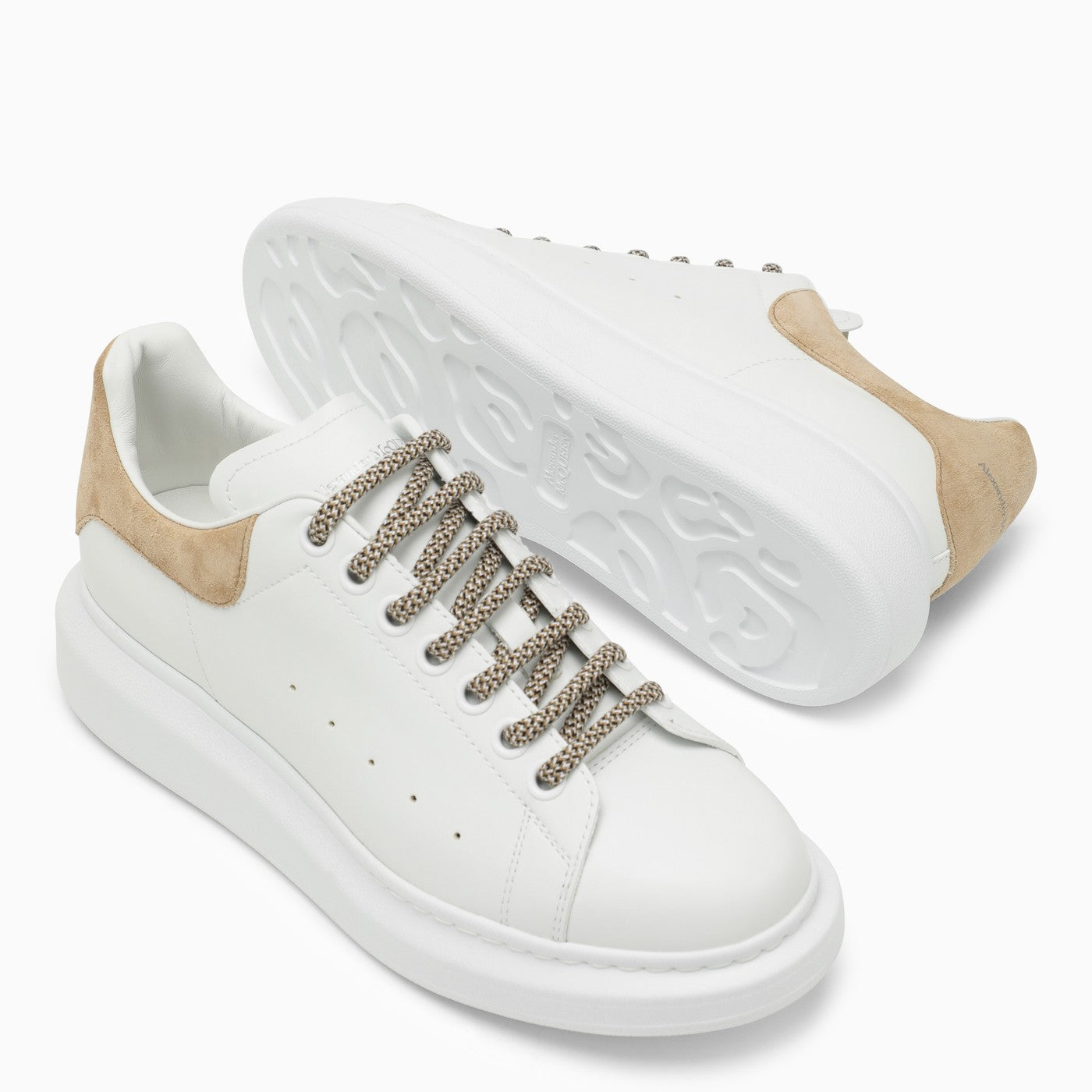 White leather low top trainer from Alexander McQueen featuring camel-coloured suede heel detail with embossed logo, lace-up fastening, round toe, embossed logo on tongue. The laces may differ from those in the product image.