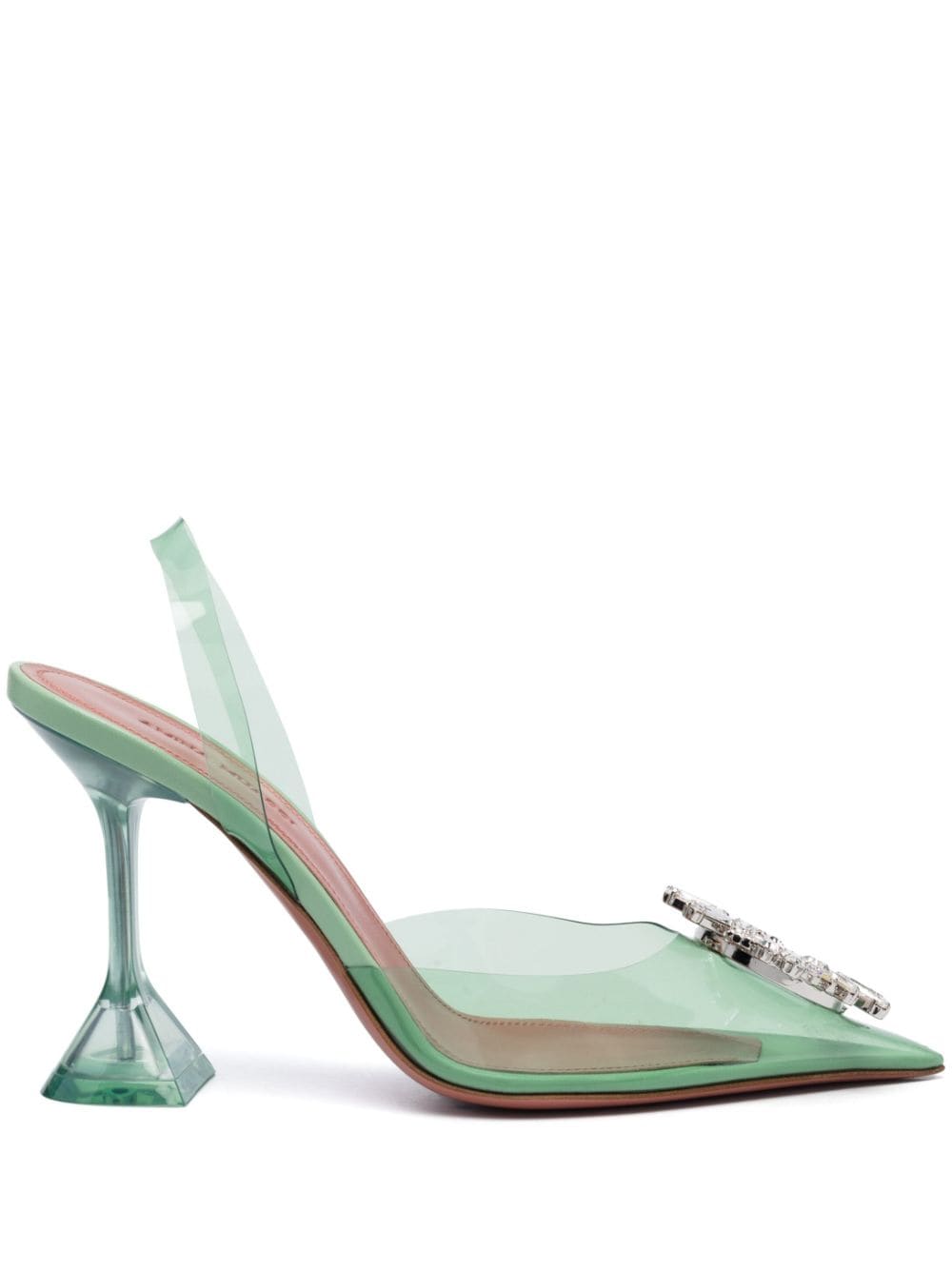 Begum 90mm slingback pumps from AMINA MUADDI featuring mint green, calf leather, PVC, pointed toe, crystal buckle detail, branded insole, slingback strap and high fluted heel.