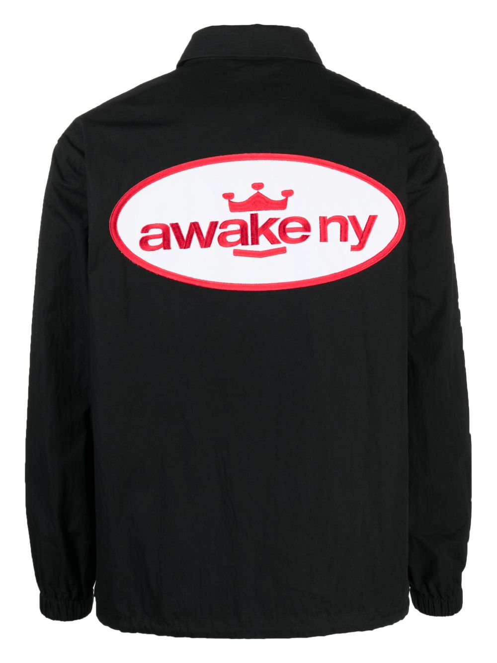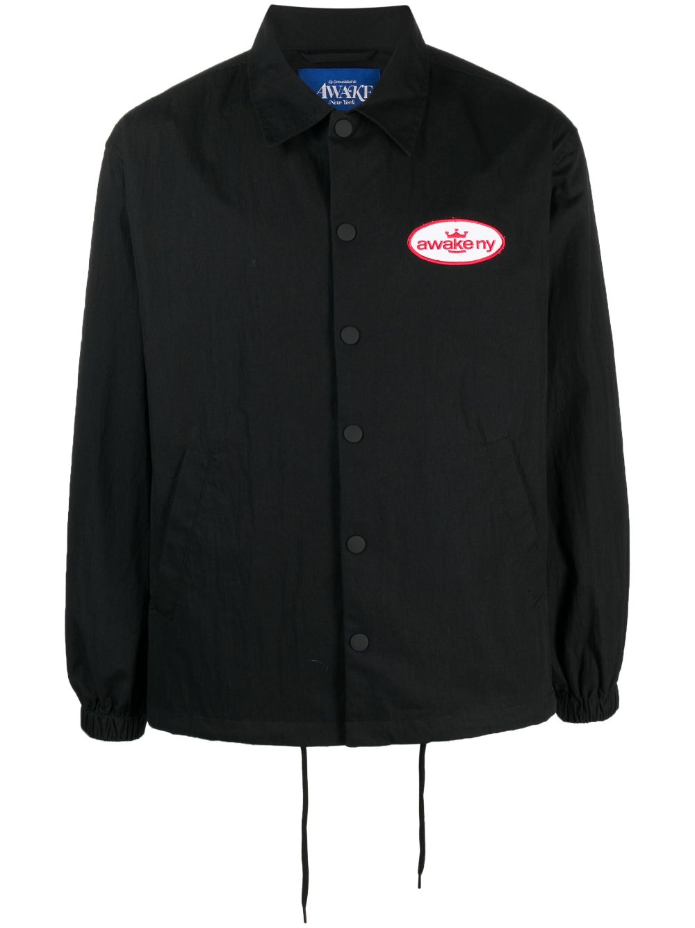 logo-patch shirt jacket from Awake NY featuring black, cotton blend, logo patch at the chest, logo patch to the rear, classic collar, front button fastening, long sleeves, buttoned-cuff sleeves and drawstring hem.