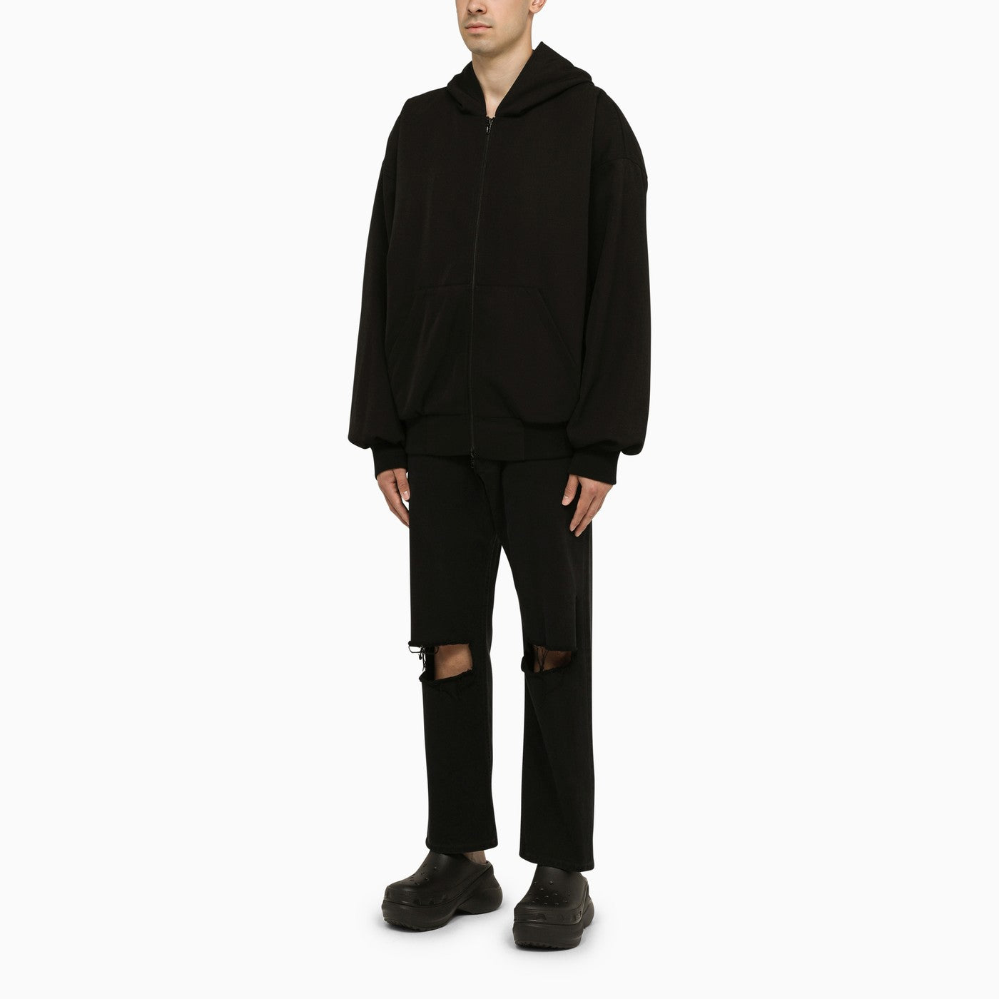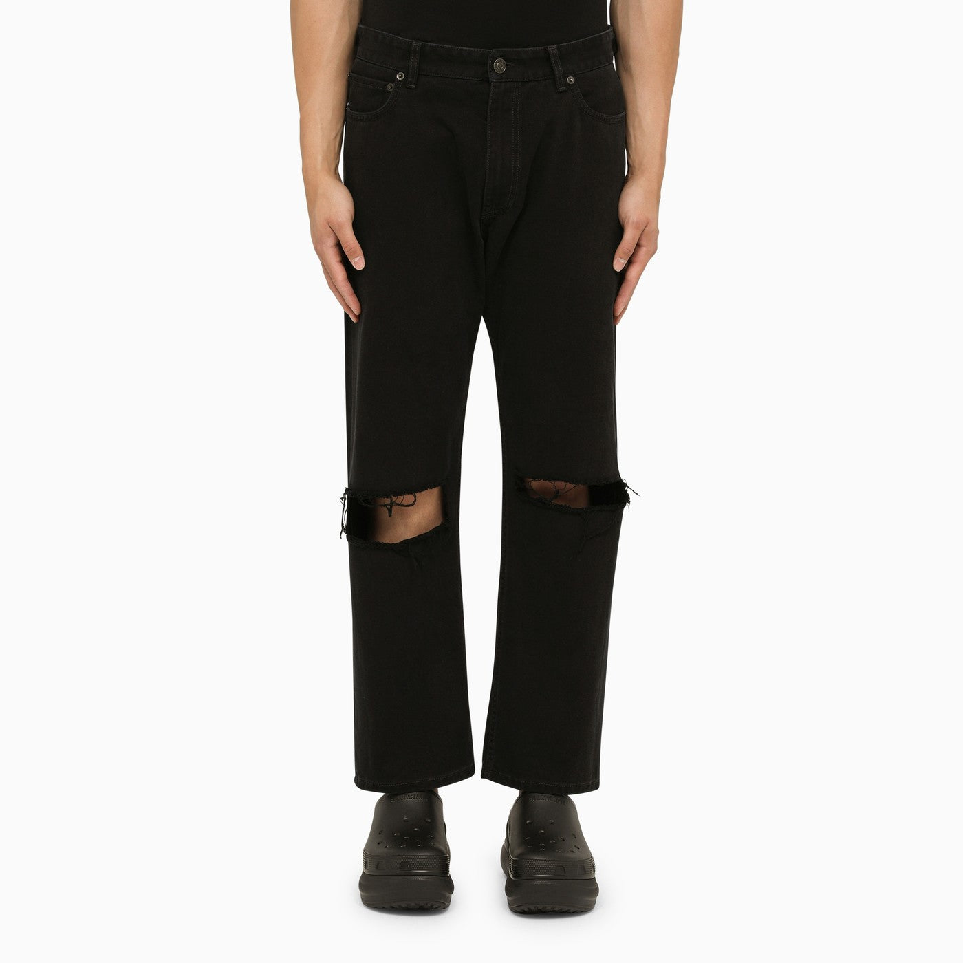 Black cotton denim cropped jeans by Balenciaga, featuring five pockets, logo patch on the back and wear at the knees.