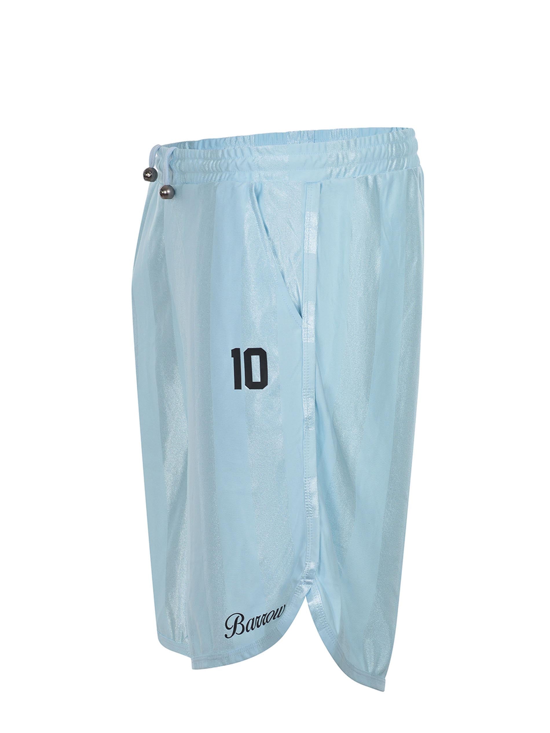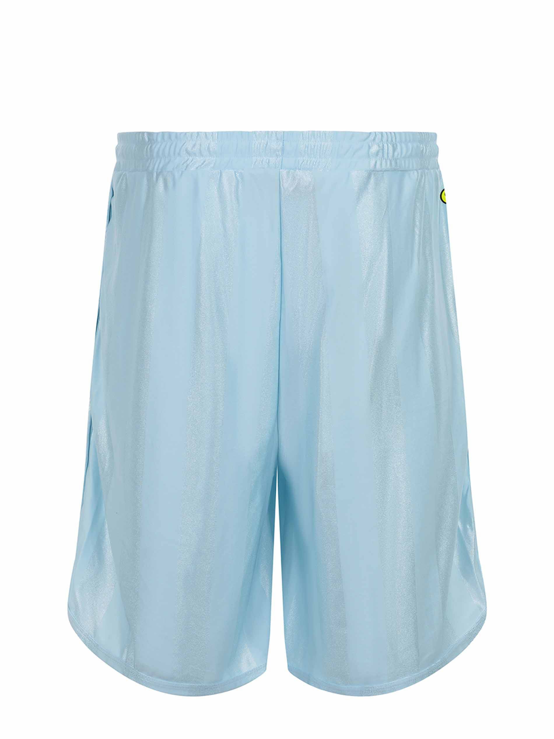 Bermuda shorts made of polyester in a light blue color. Shiny striped pattern. Elastic waistband with adjustable internal drawstring. Side pockets. Patch and contrasting logo lettering on the front. Contrasting logo applied on the back. 100% polyester.