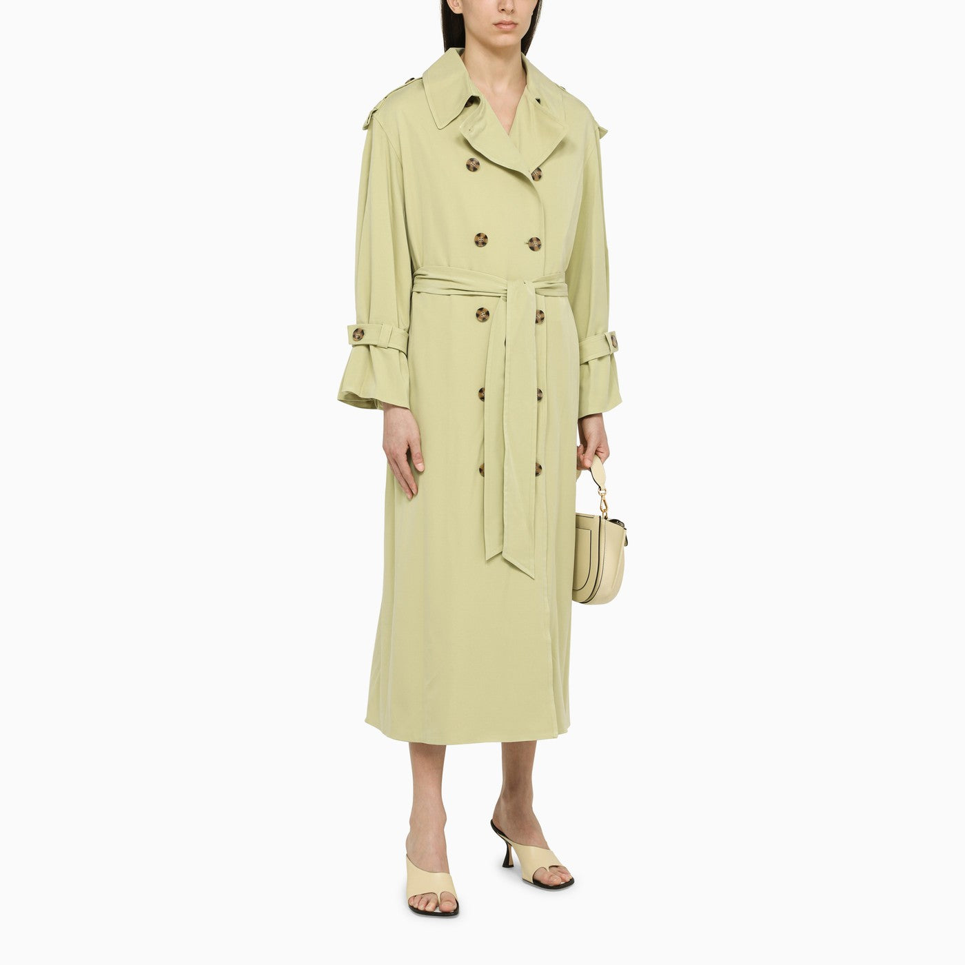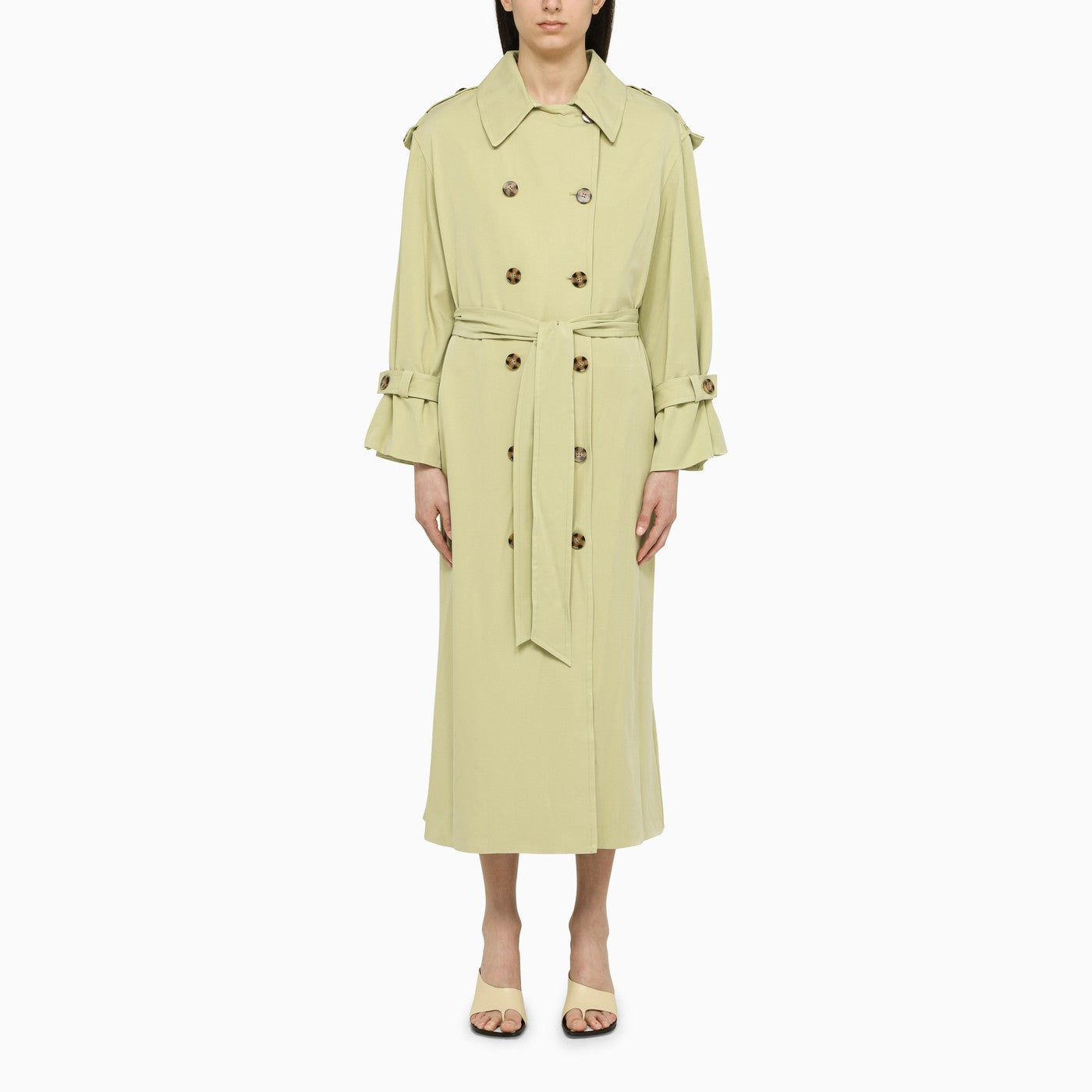 Green double-breasted duster coat by By Malene Birger featuring a front button placket, a waist belt, two front pockets, shoulder insignia and wrist straps.