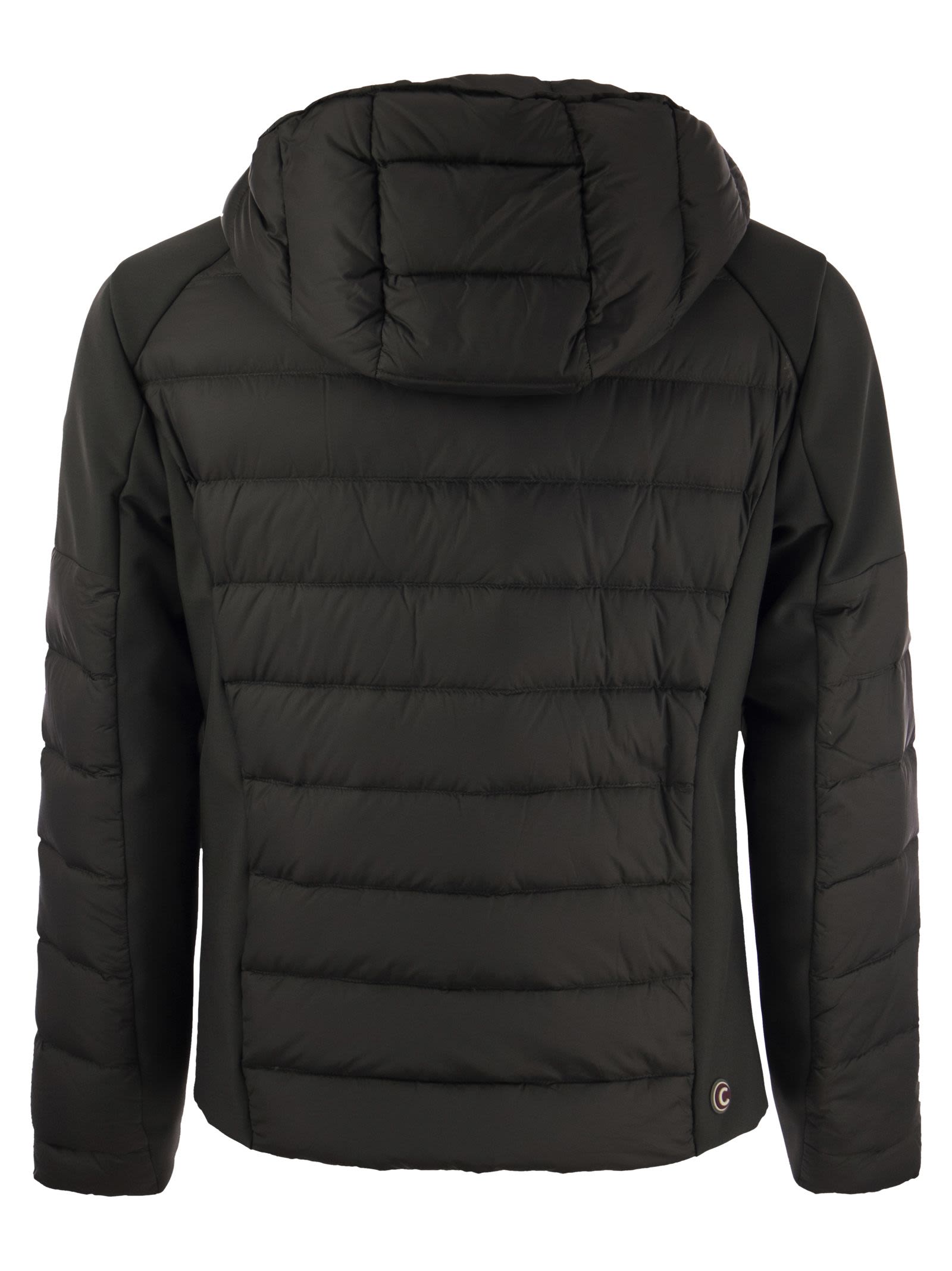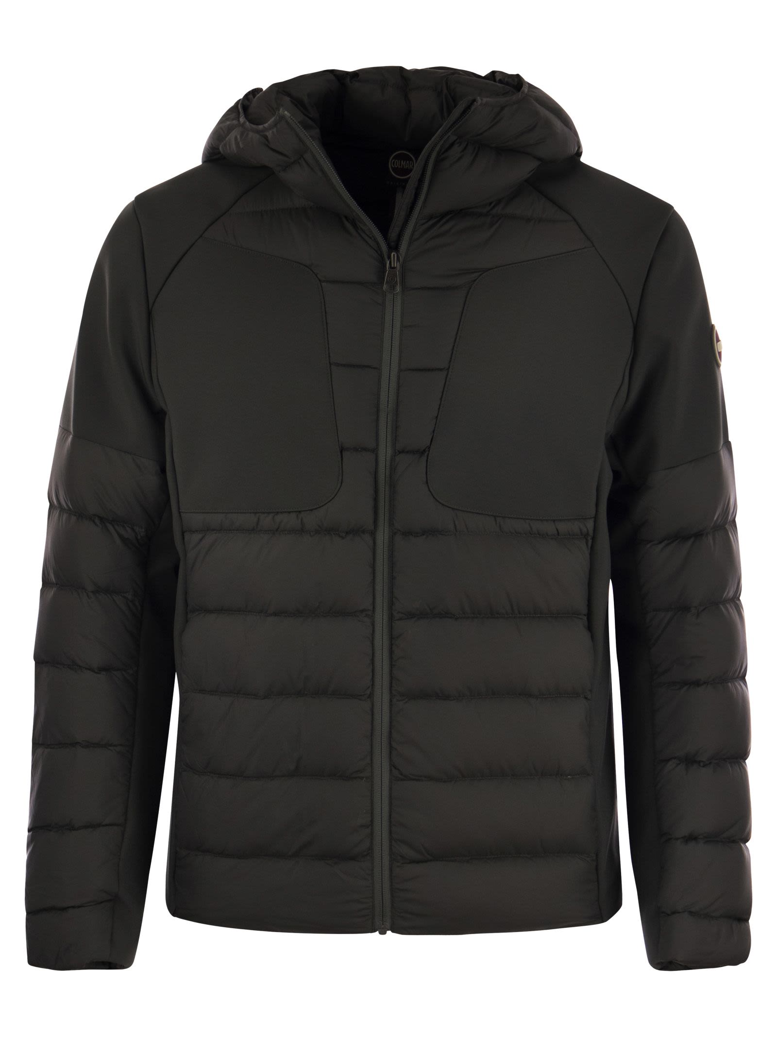 Men's jacket with fixed hood, made of opaque peach hand fabric with scuba-effect stretch fabric inserts. Padded with natural down. The winning weapon of this garment is the combination of the delicacy of a quilted hand peach fabric and the grit of the neoprene effect on the sides, shoulders and chest. A dynamic and futuristic look that underlines Colmar Originals' forward-looking outlook. - Zip closure - Side pockets and inside zip pocket - Fixed hood - Natural down filling - Water-repellent treatment - Colmar Originals logo applied on left sleeve DESIGNER ID: 1286R 1WQ 475