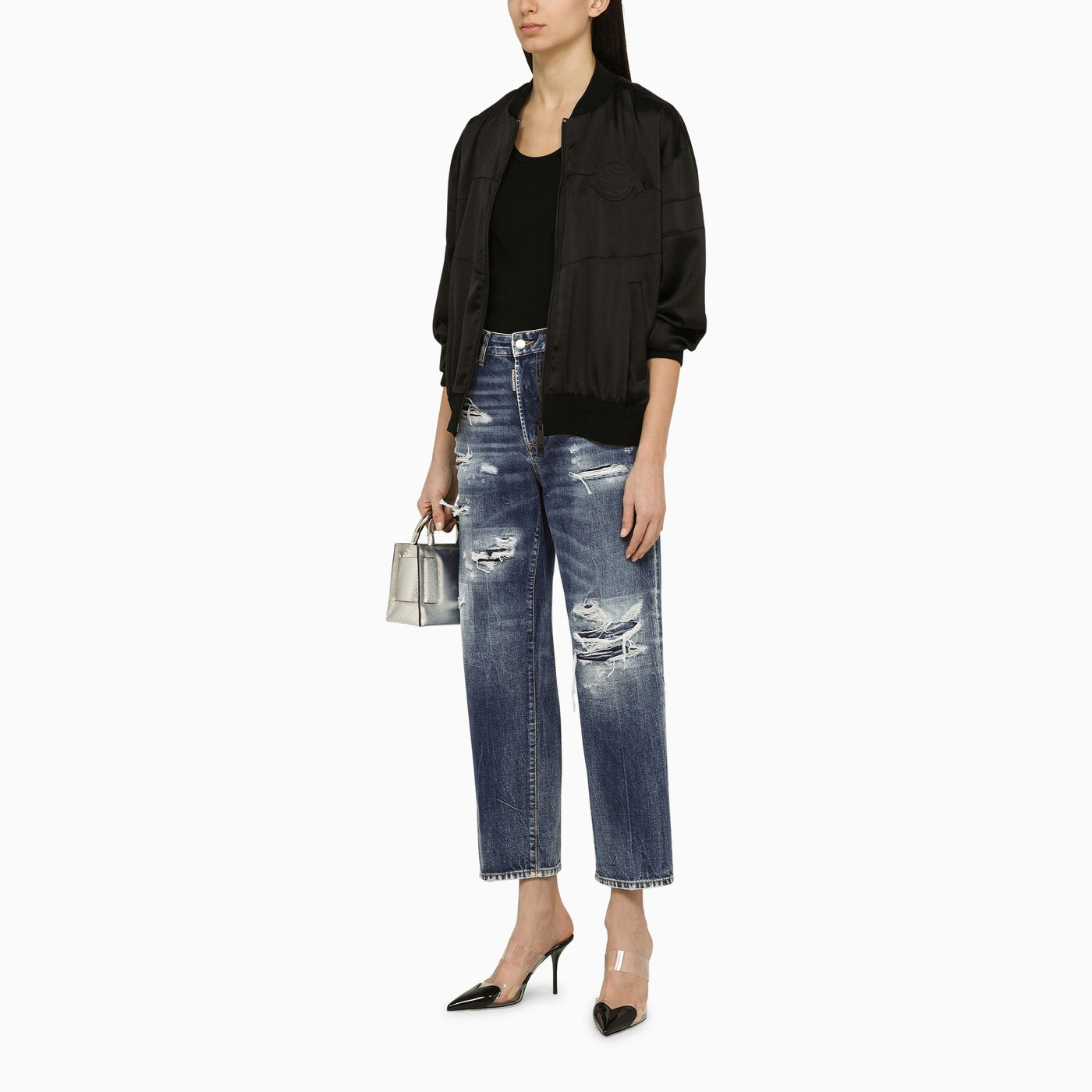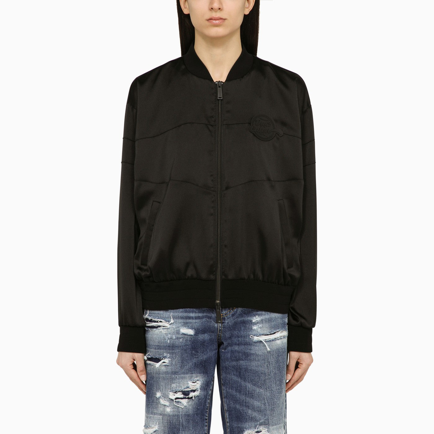 Black bomber jacket by Dsquared2 featuring long sleeves, a double zip fastening, a tone-on-tone front logo patch, two front pockets and a knitted collar, hem and cuffs.