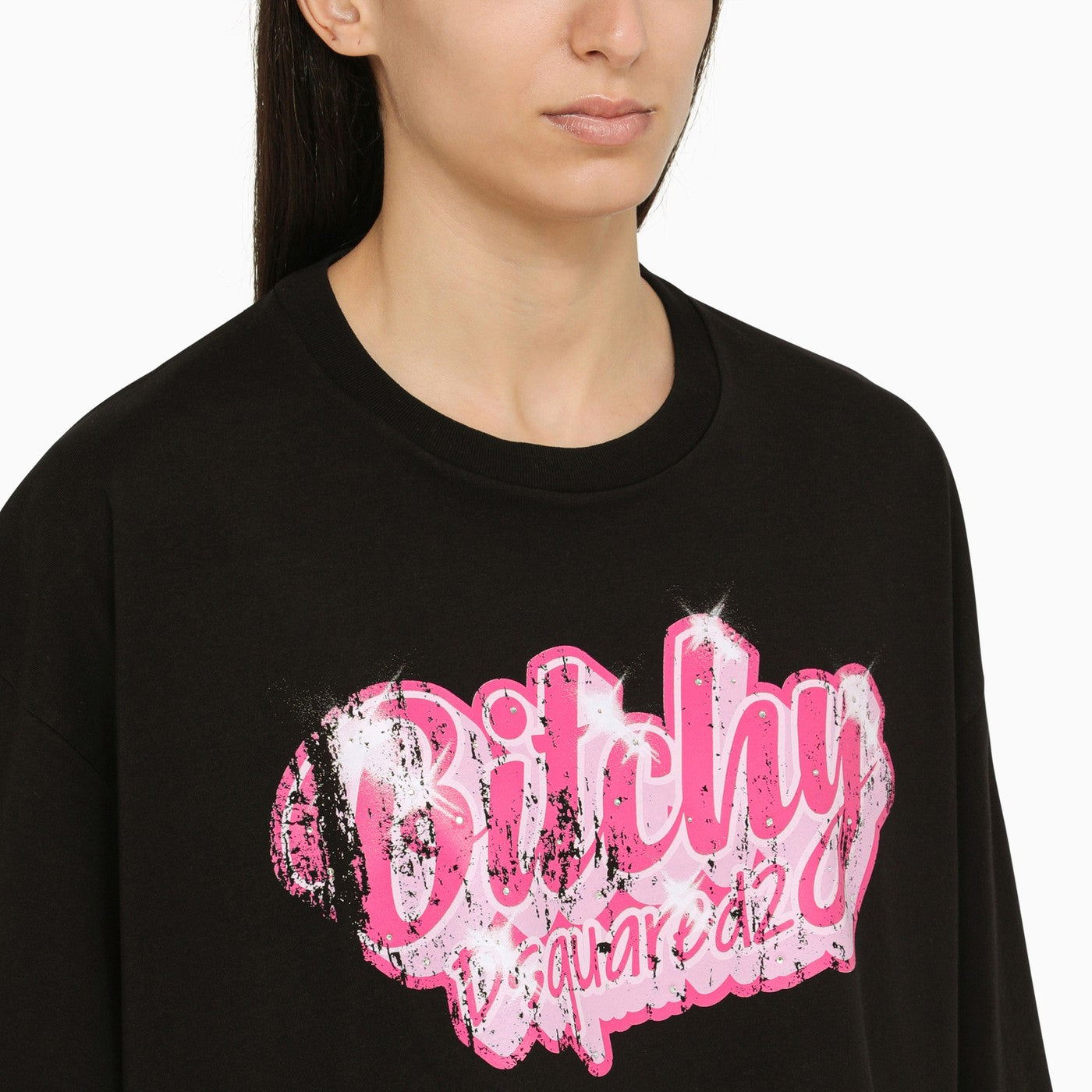 Black cotton crew-neck short T-shirt by Dsquared2 featuring a contrasting fuchsia front print and an oversized fit.