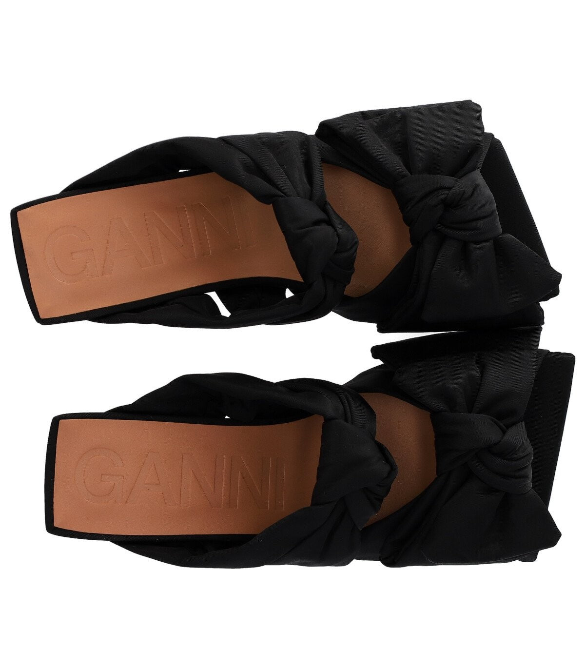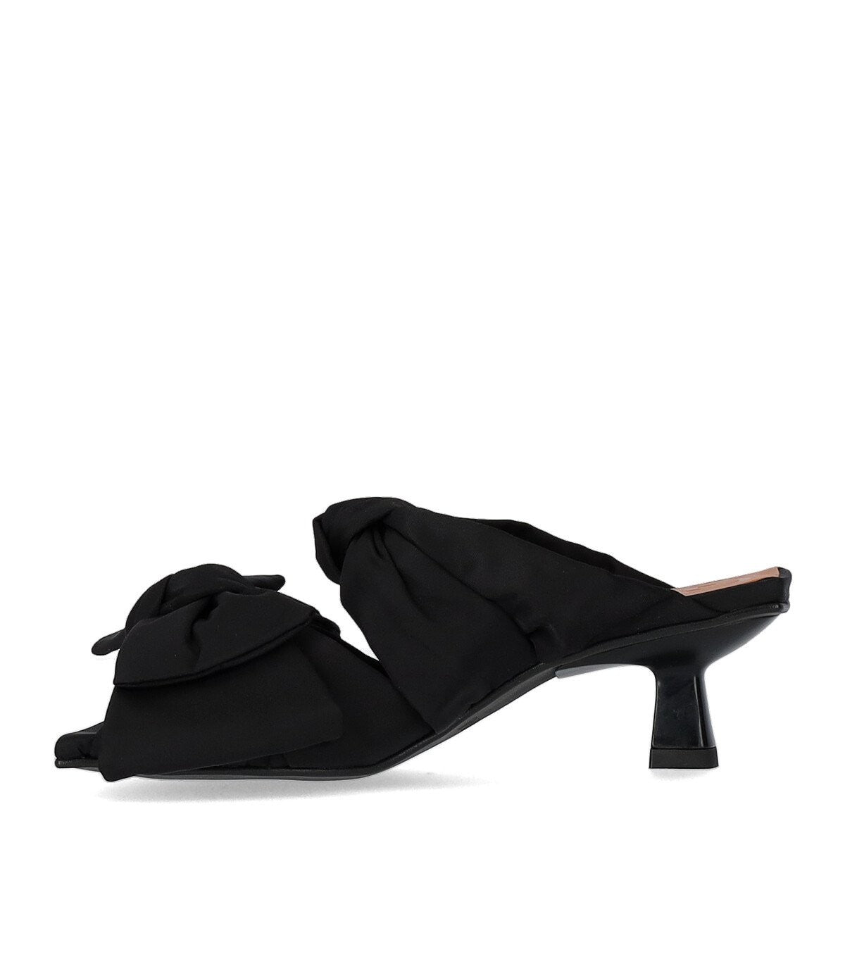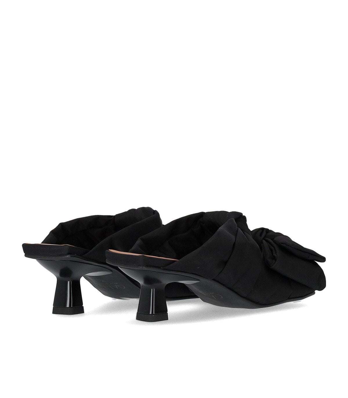 Ganni heeled mule made of black nylon with bands embellished with bows. Square toe, fabric lining and logoed leather insole. Rubber sole with spool heel, height 5.5 cm.