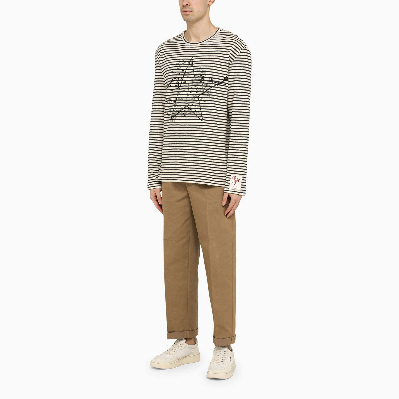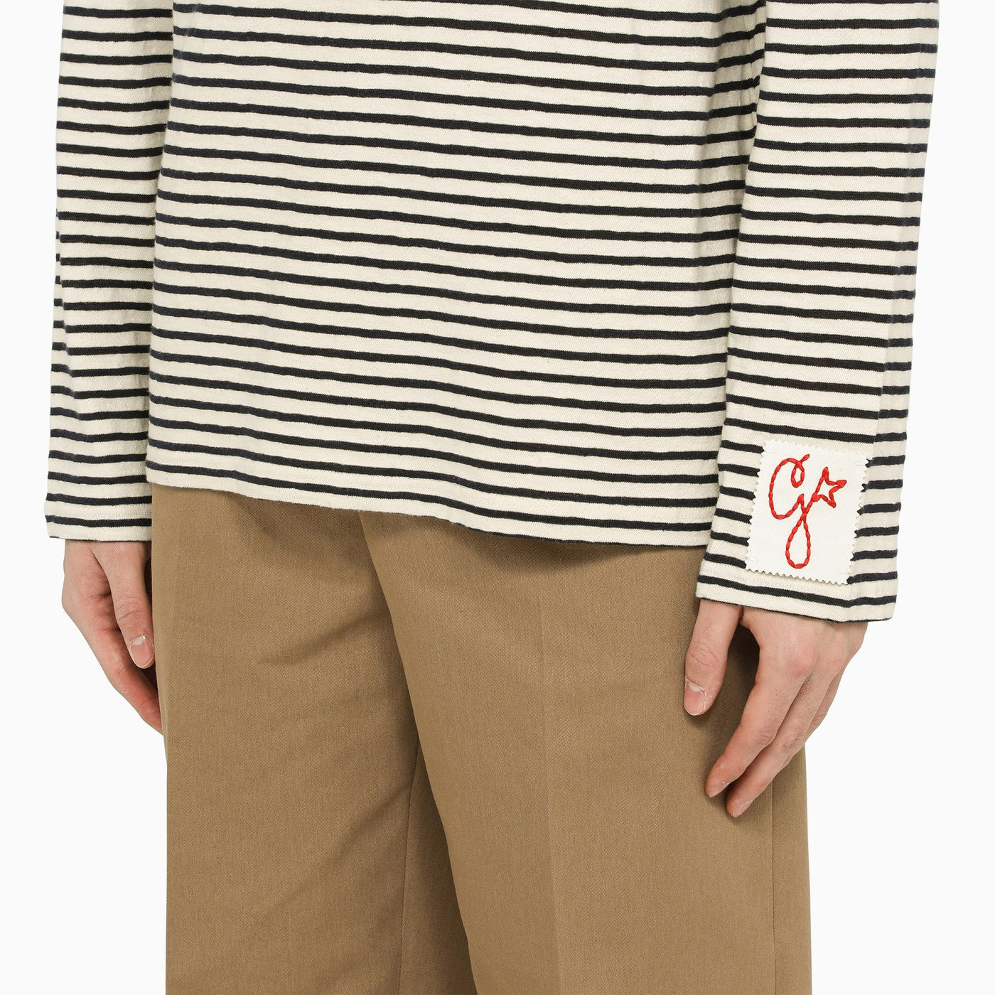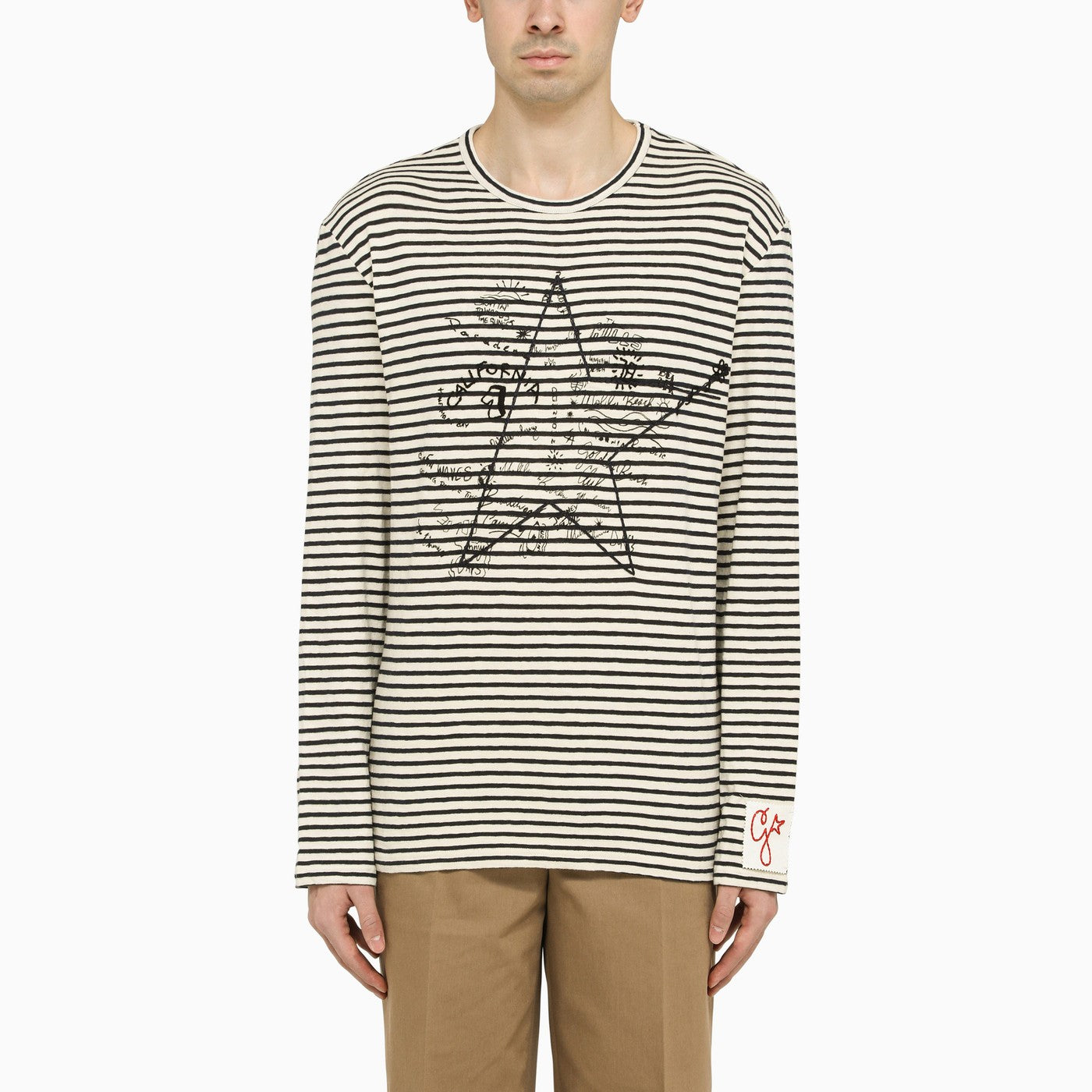T-shirt by Golden Goose Deluxe Brand in ivory and blue stripes cotton and linen, featuring long sleeves, crewneck, contrasting print on the front, contrasting logo on the cuff and regular fit.