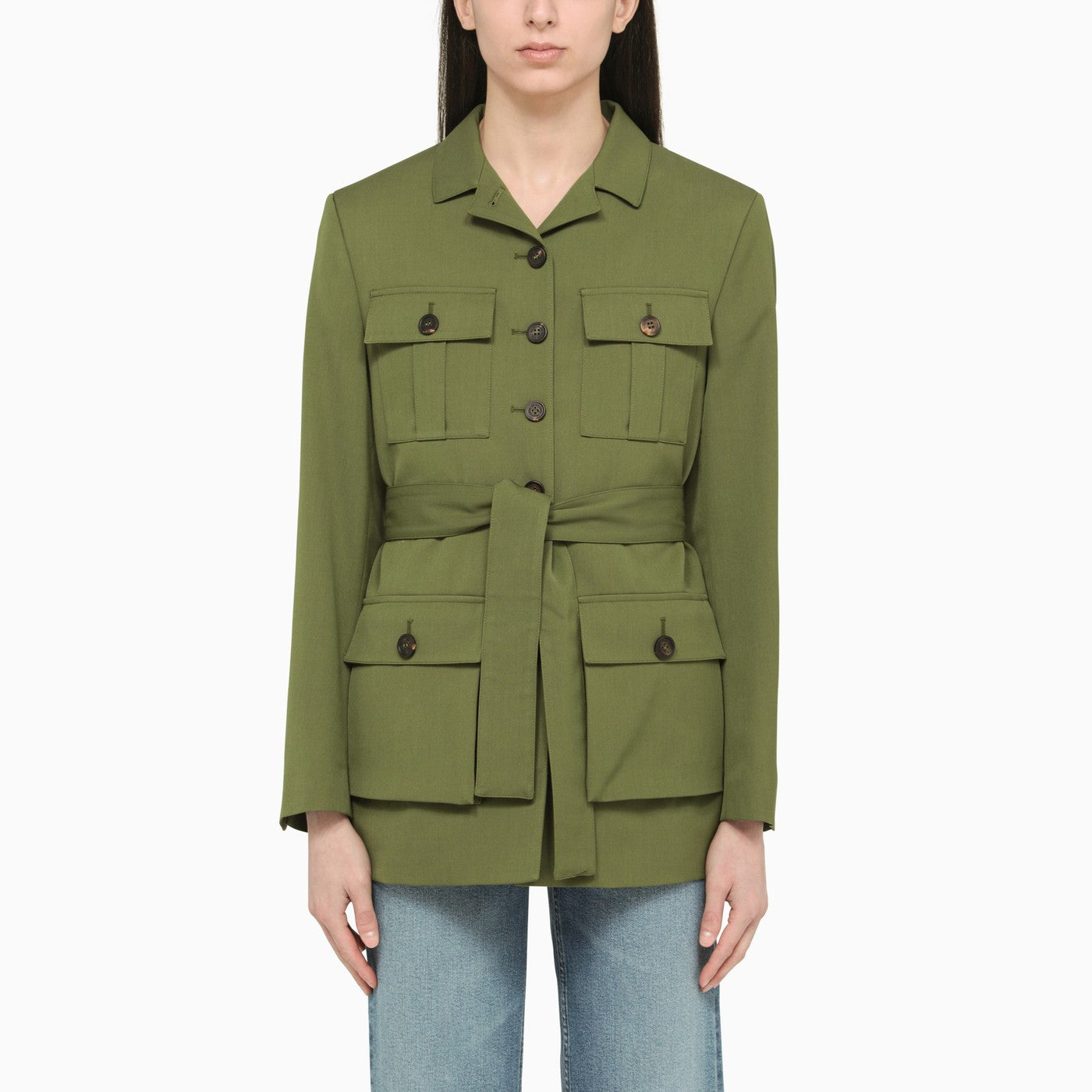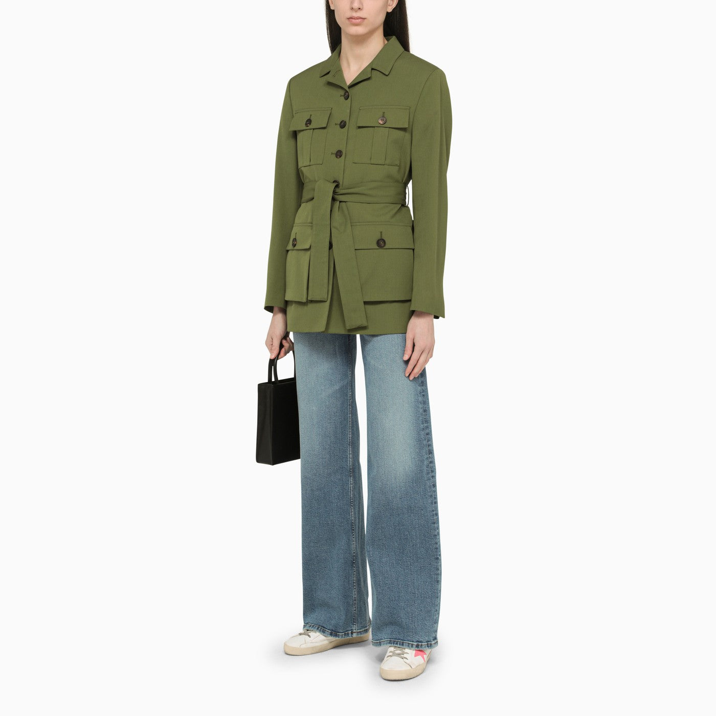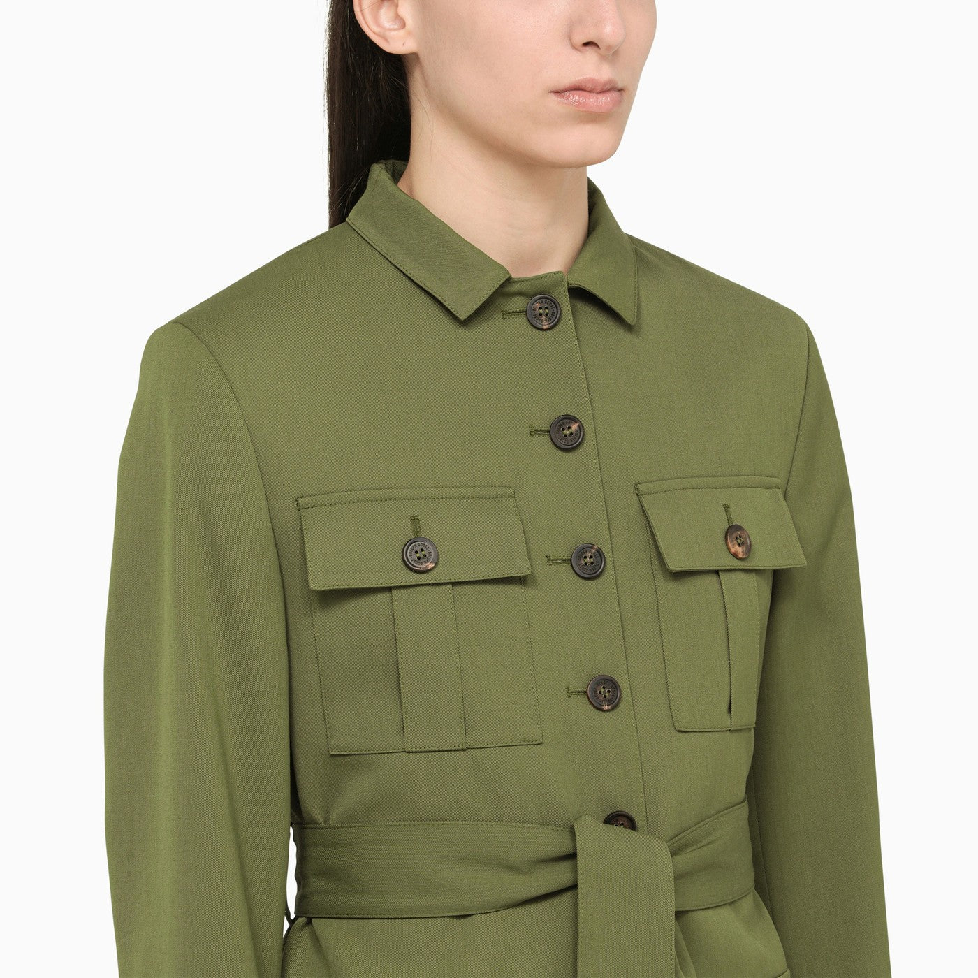 Golden Goose Deluxe Brand's single-breasted jacket in a pesto-coloured wool blend, with a belted waist, buttons on the front and several front pockets.
