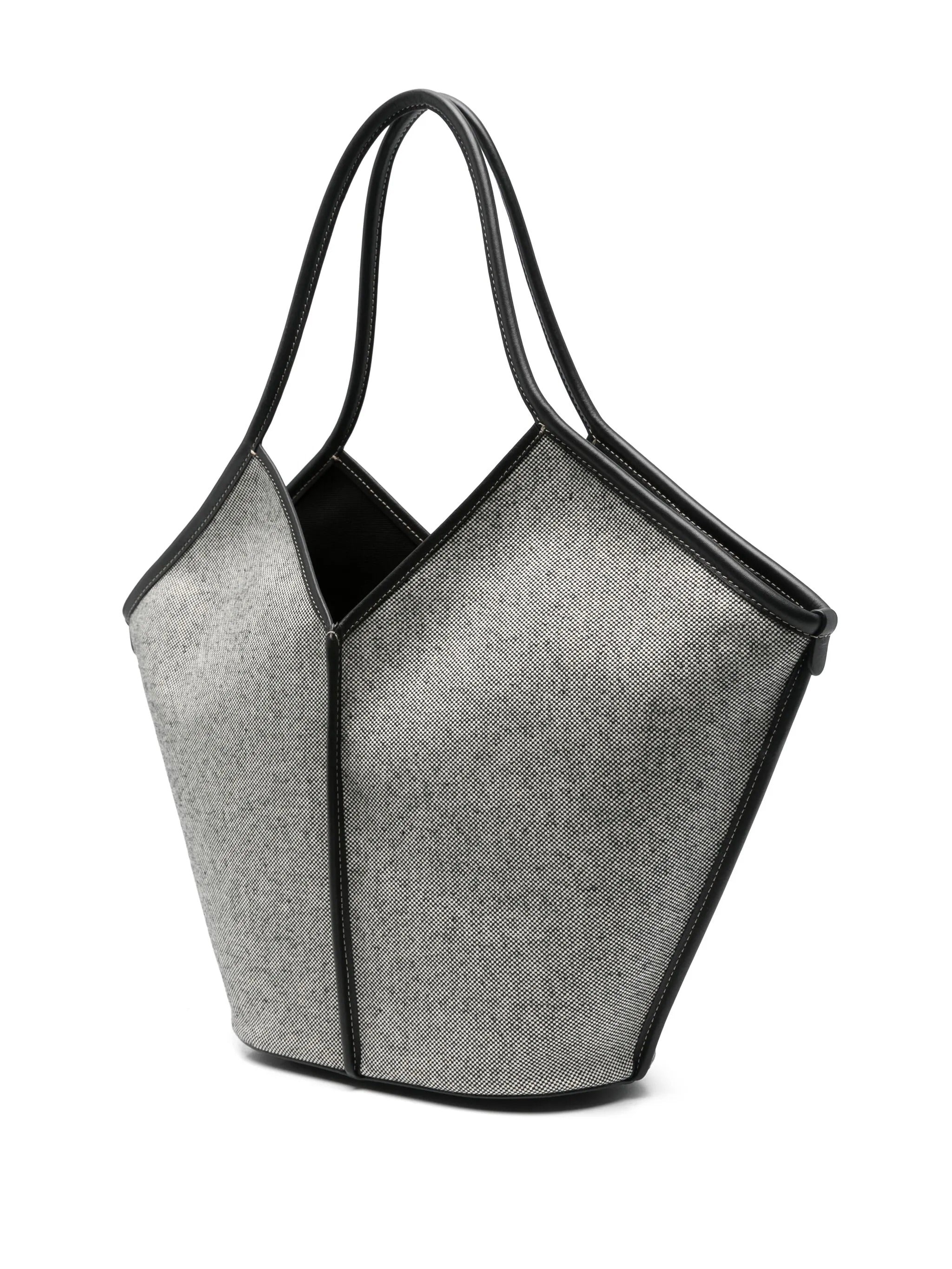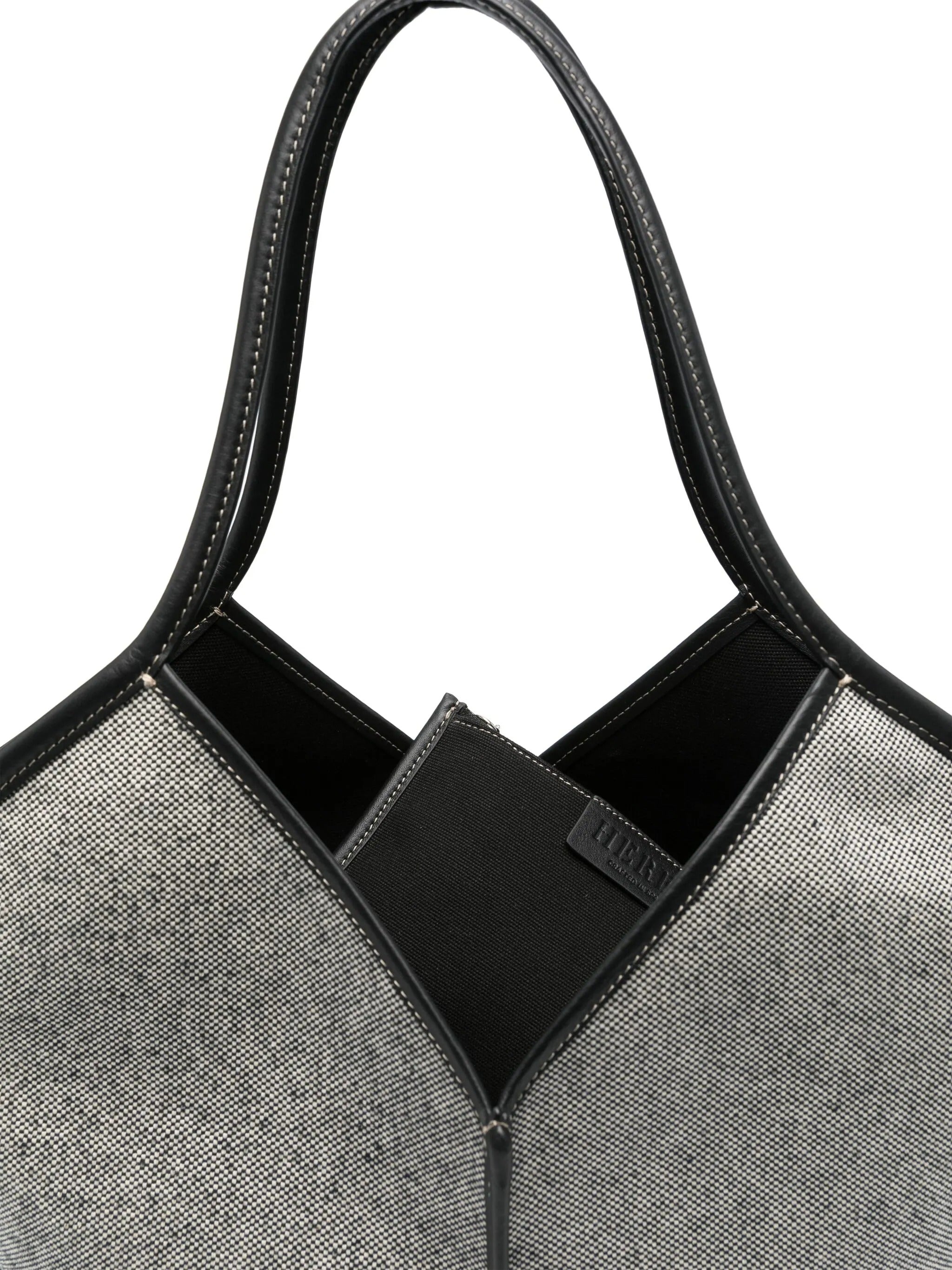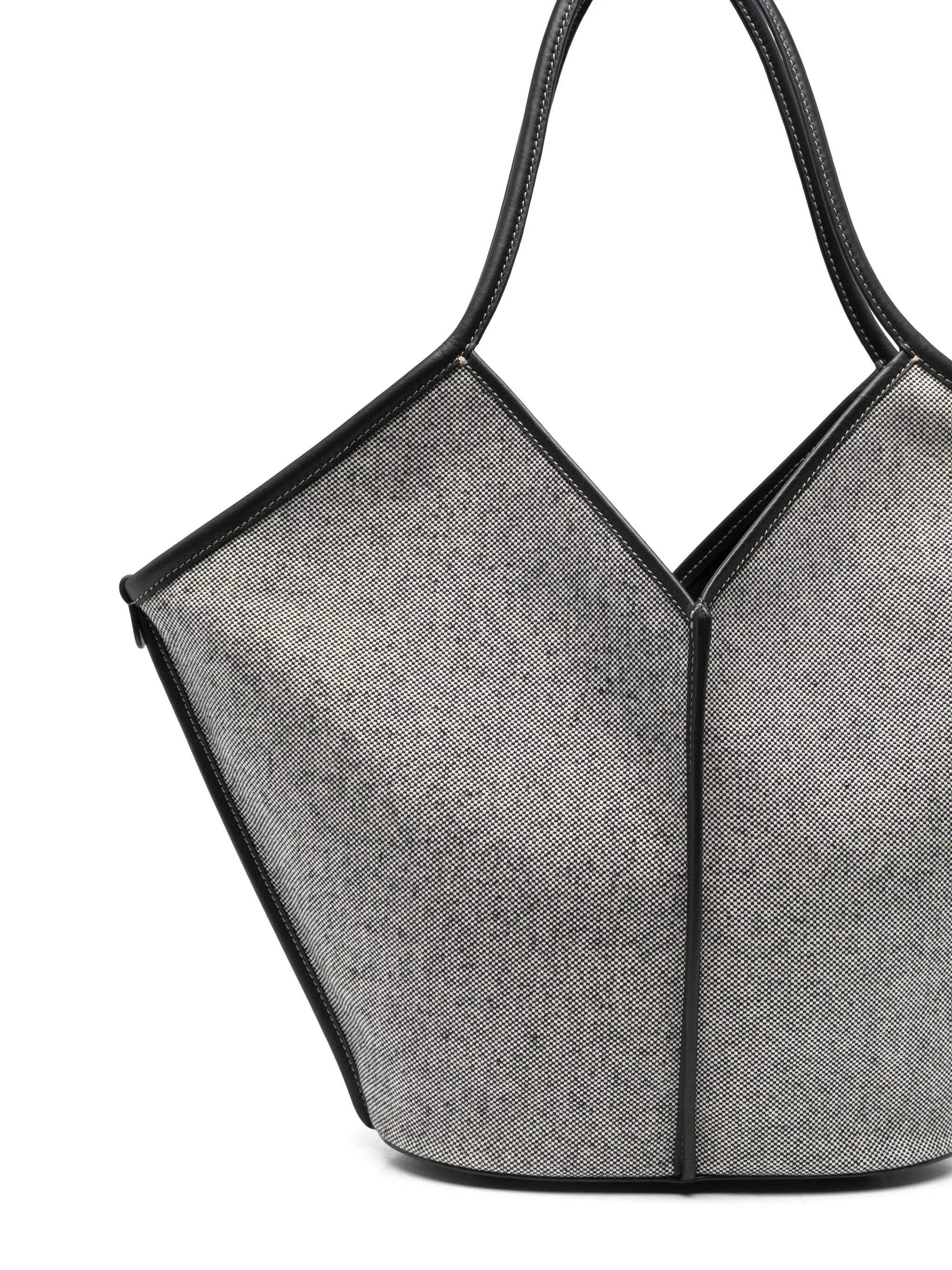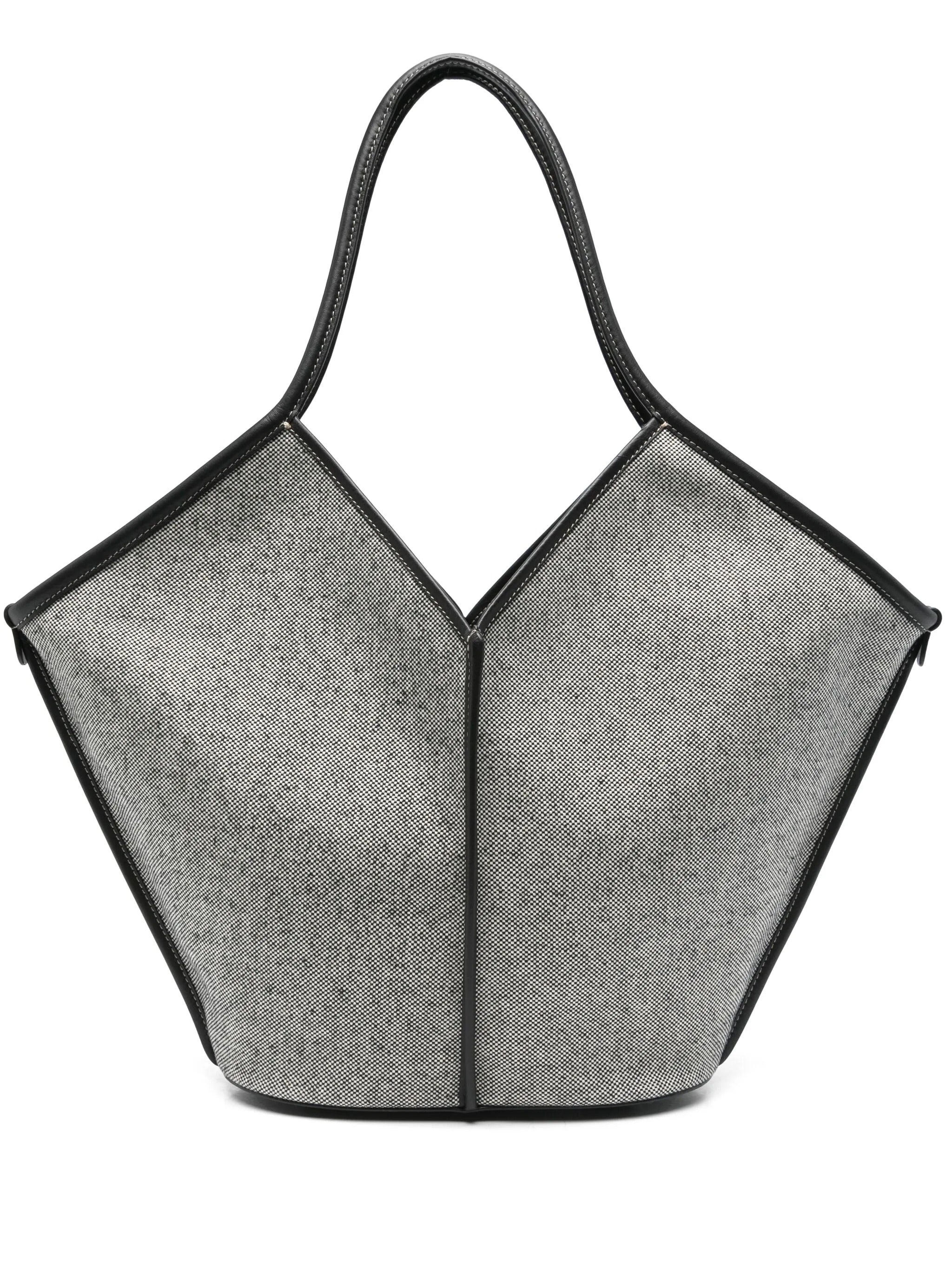 Canvas BODY: 90% CANVAS 10% Calf leather HANDLE: 100% Calf leather LINING: 100% Organic cotton DEPTH 12 cm HANDLE 18 cm HEIGHT 33 cm WIDTH 50 cm