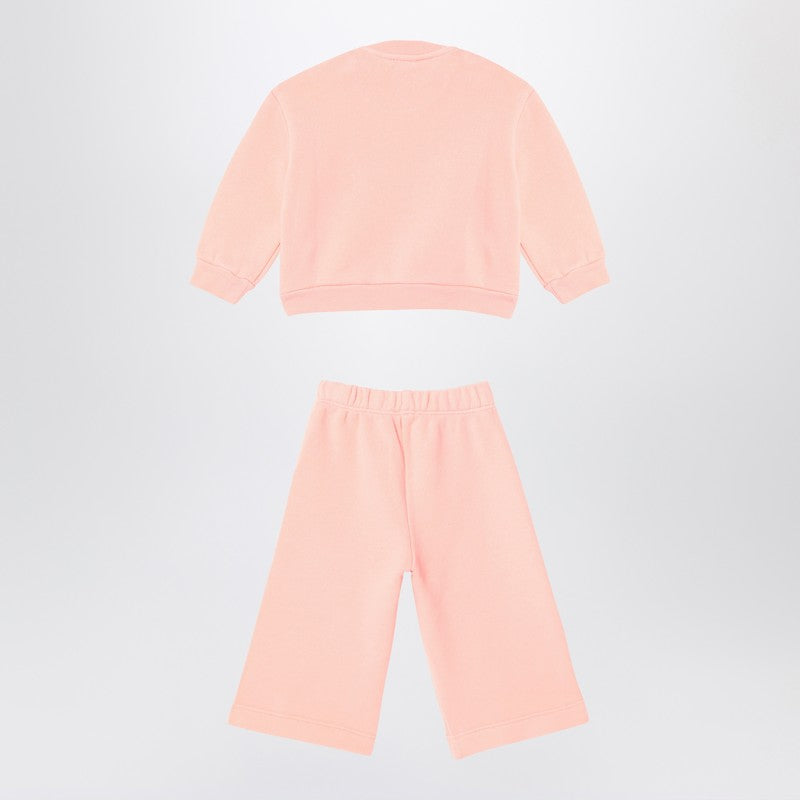 Set by Il Gufo in peach cotton fleece, consisting of a long-sleeve crew neck sweater with an embroidered bird logo on the chest, ribbed edges, and wide-leg pants with an elastic waistband.