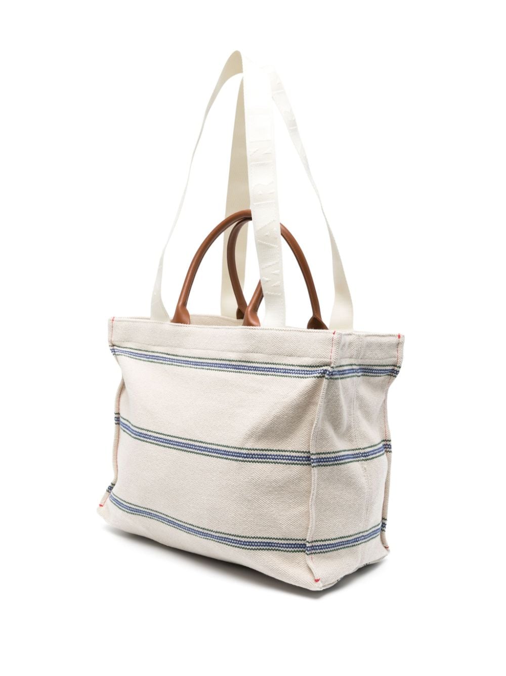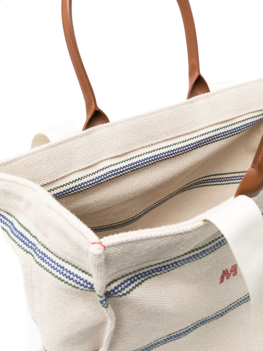 ecru/multicolour cotton canvas leather top handles two flat top handles horizontal stripe embroidery embroidered logo to the front main compartment internal patch pocket internal logo patch unlined open top This piece comes complete with a protective dust bag.