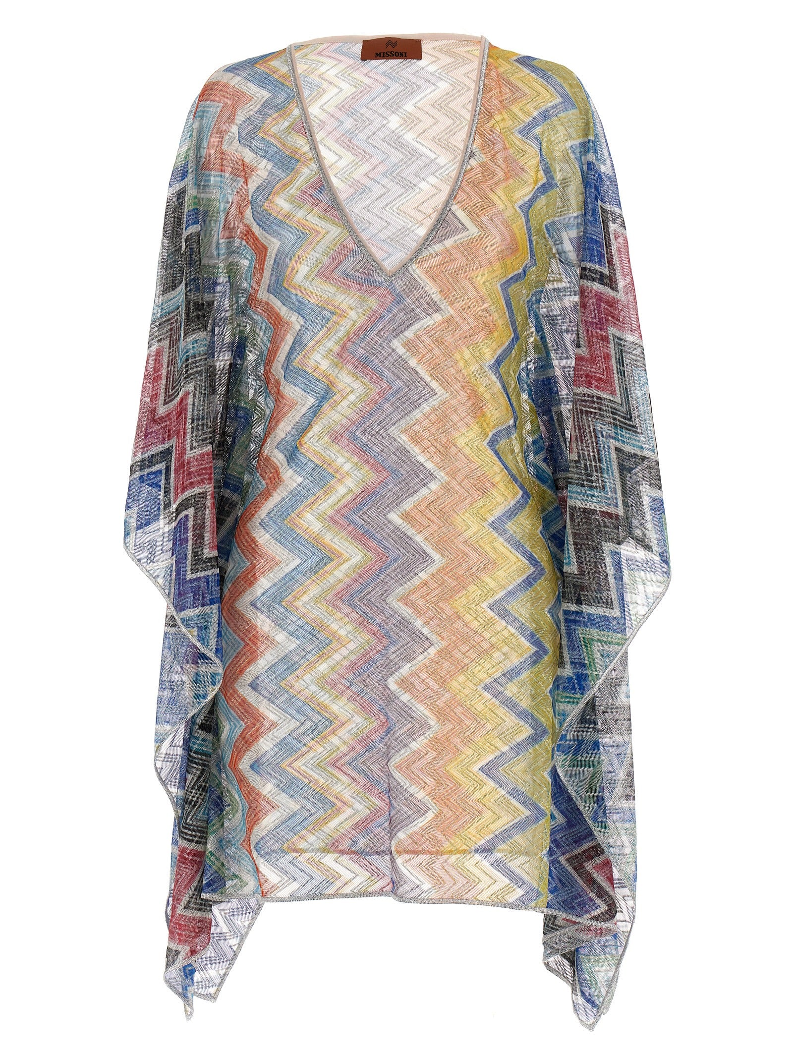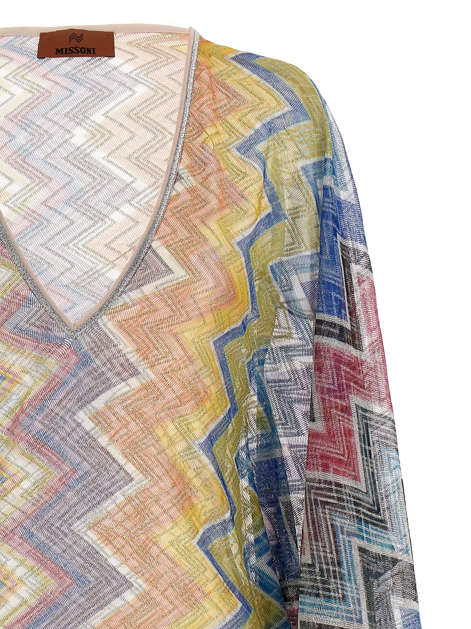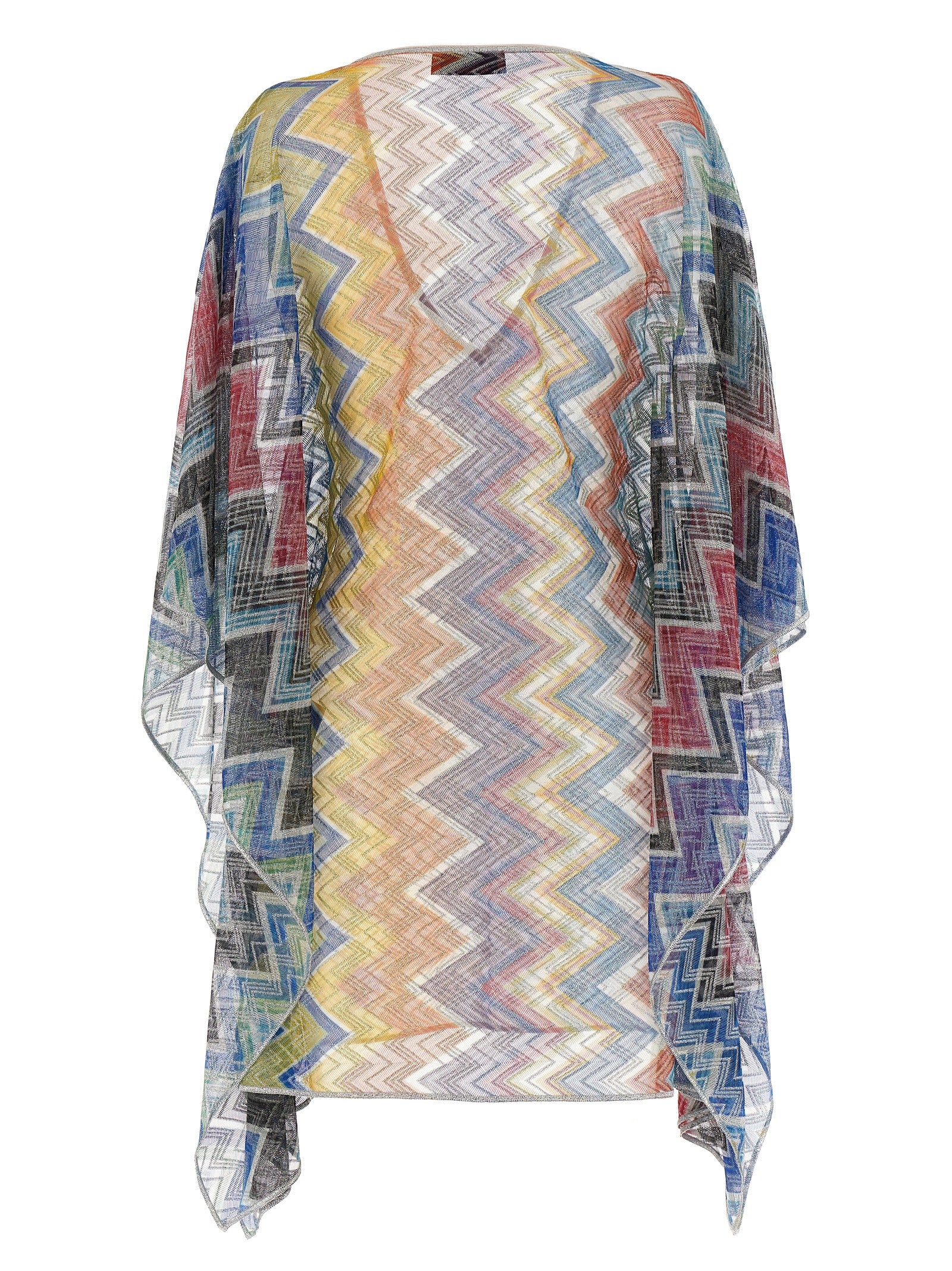 Caftan mini dress in semi-sheer fabric with 'zig zag' pattern, V-neck, wide sleeves with ruffles.