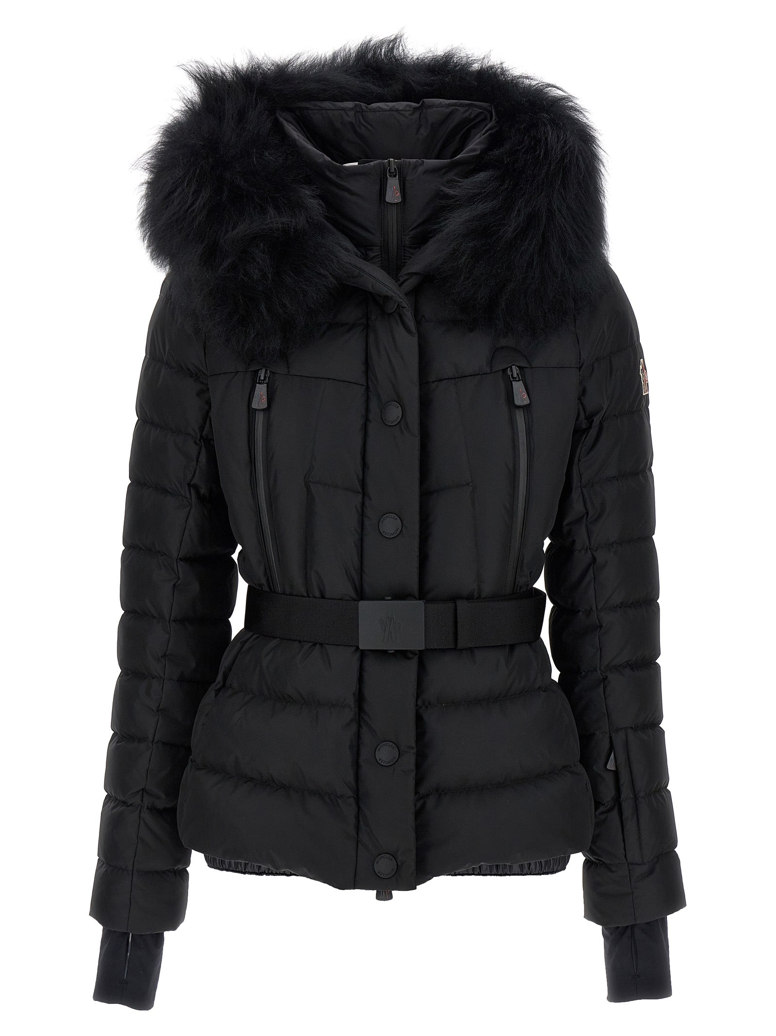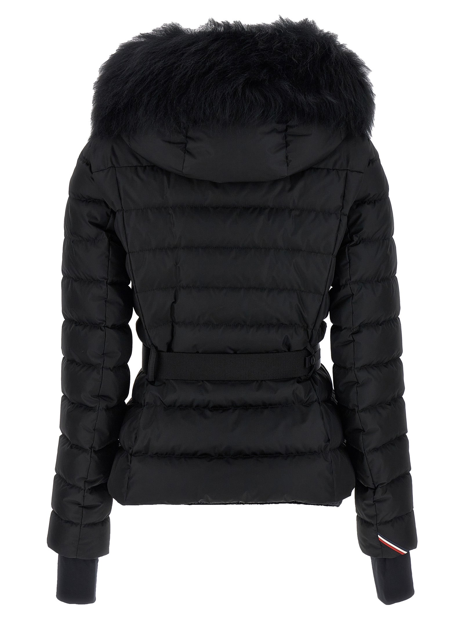 'Beverley' down jacket in technical nylon with feather padding, hood with removable sheepskin fur, high neck, logo patch on the sleeve, zip closure, pockets, adjustable and removable belt, long sleeves with windproof cuffs, windproof inner gaiter.