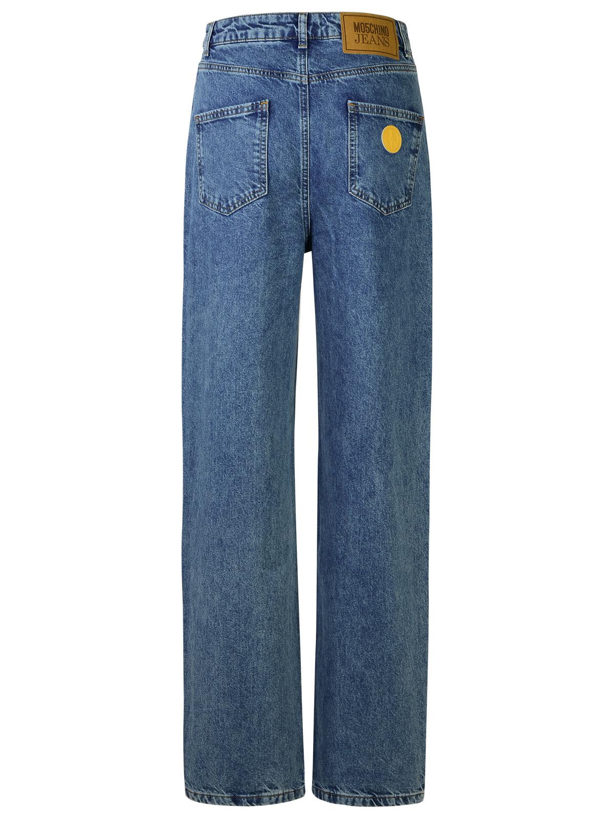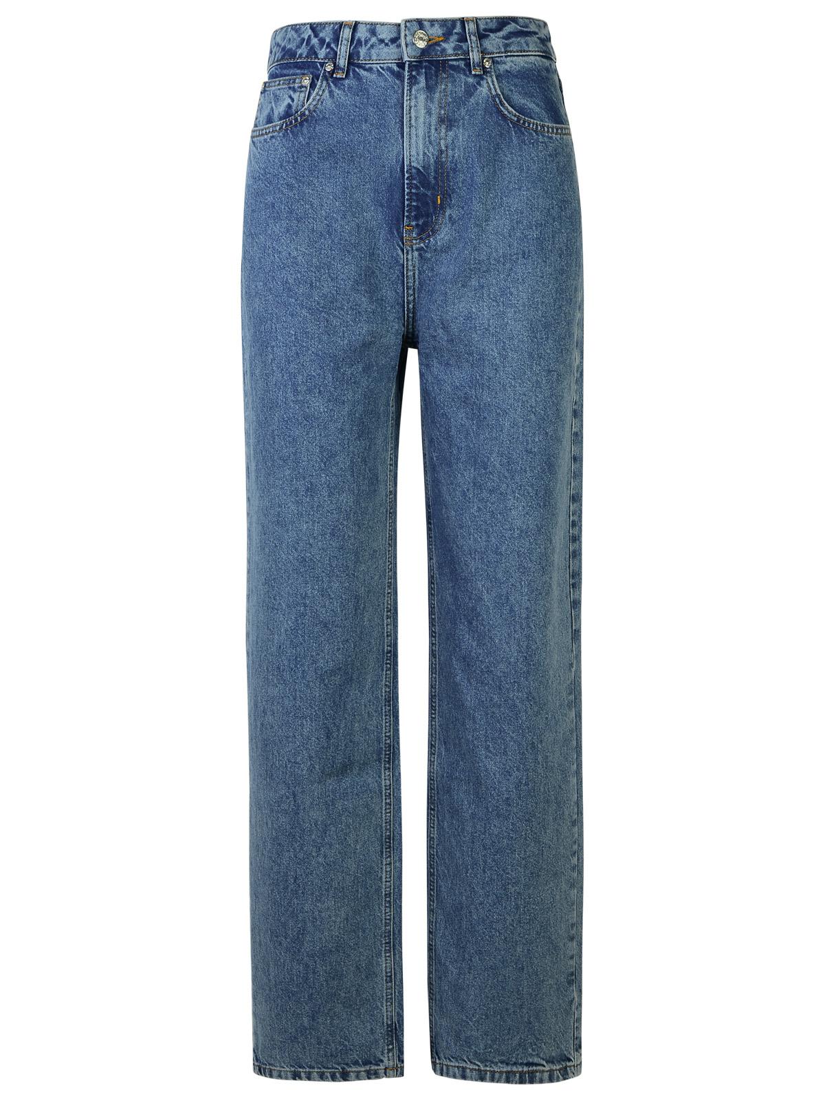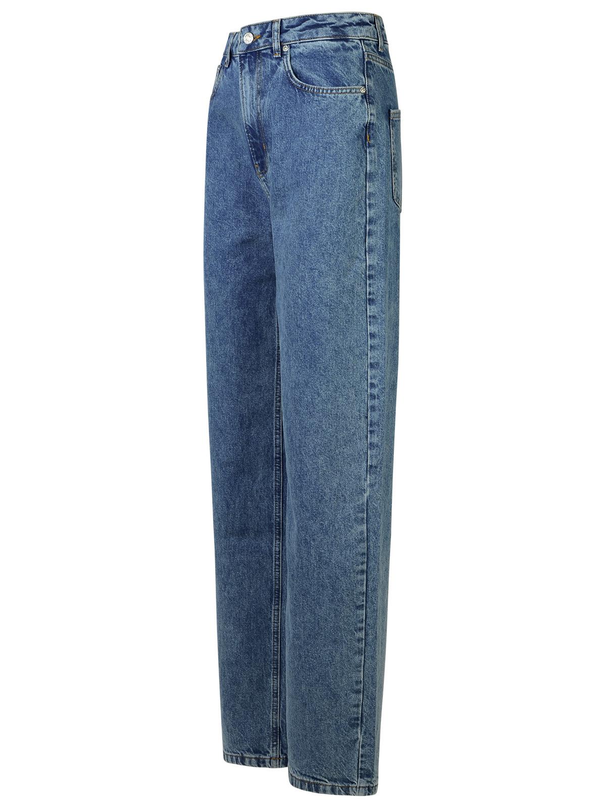 Belt loops, button closure, five-pocket zipper, double needle trim, wide hem, leather tag on the back