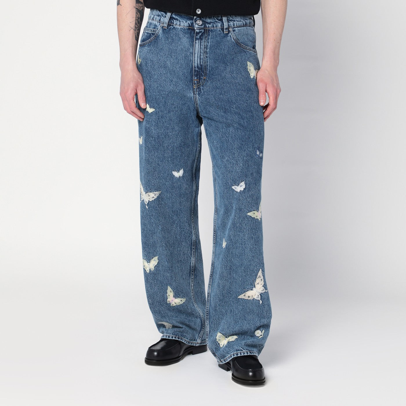 Wide jeans by Our Legacy in indigo blue cotton denim, featuring a front zip and button closure, belt loops, five classic pockets, a back logo patch, and all-over butterfly embroidery.