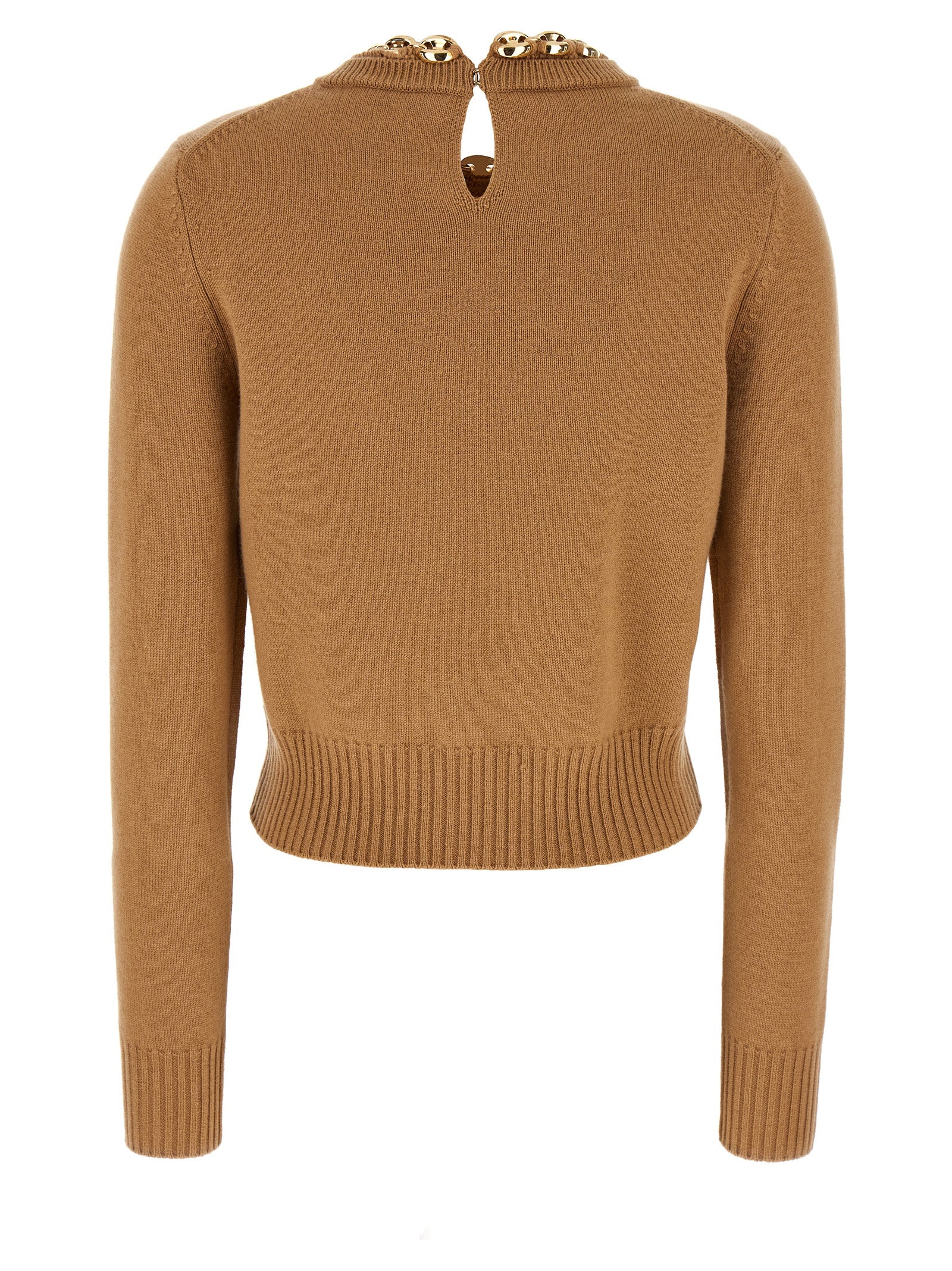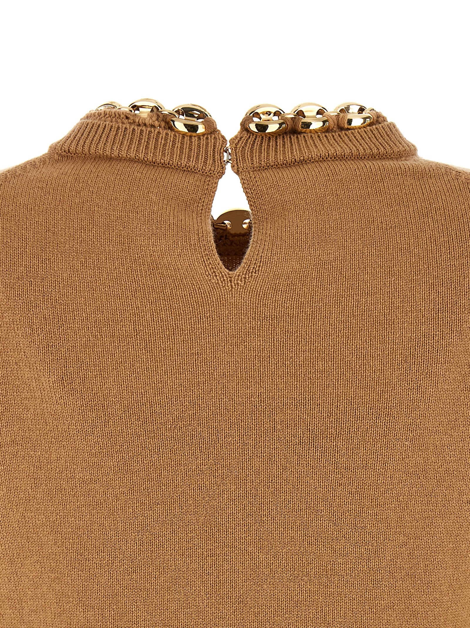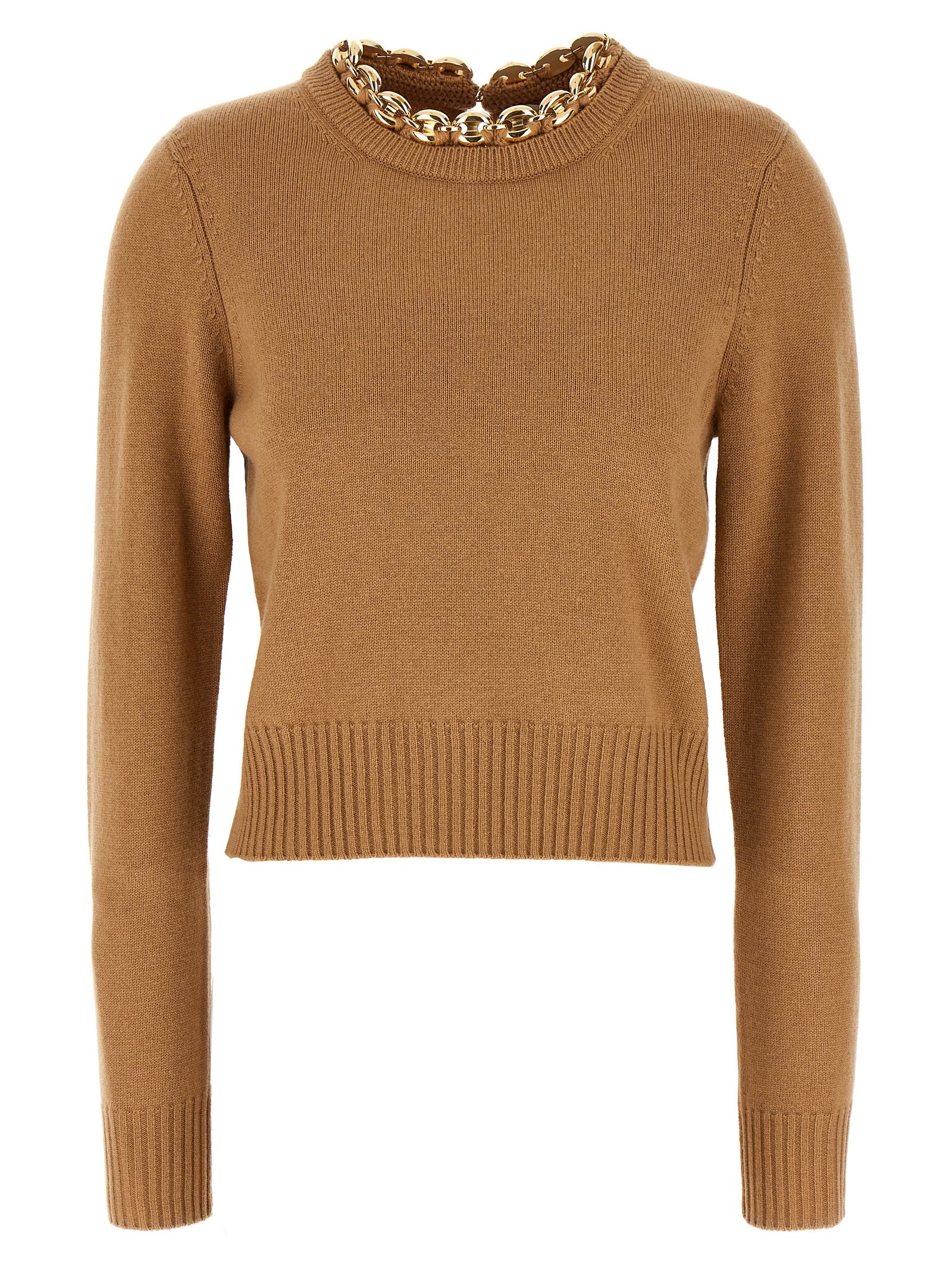 Wool and cashmere knit sweater with crew neck with chain detail, long cuffed sleeves.