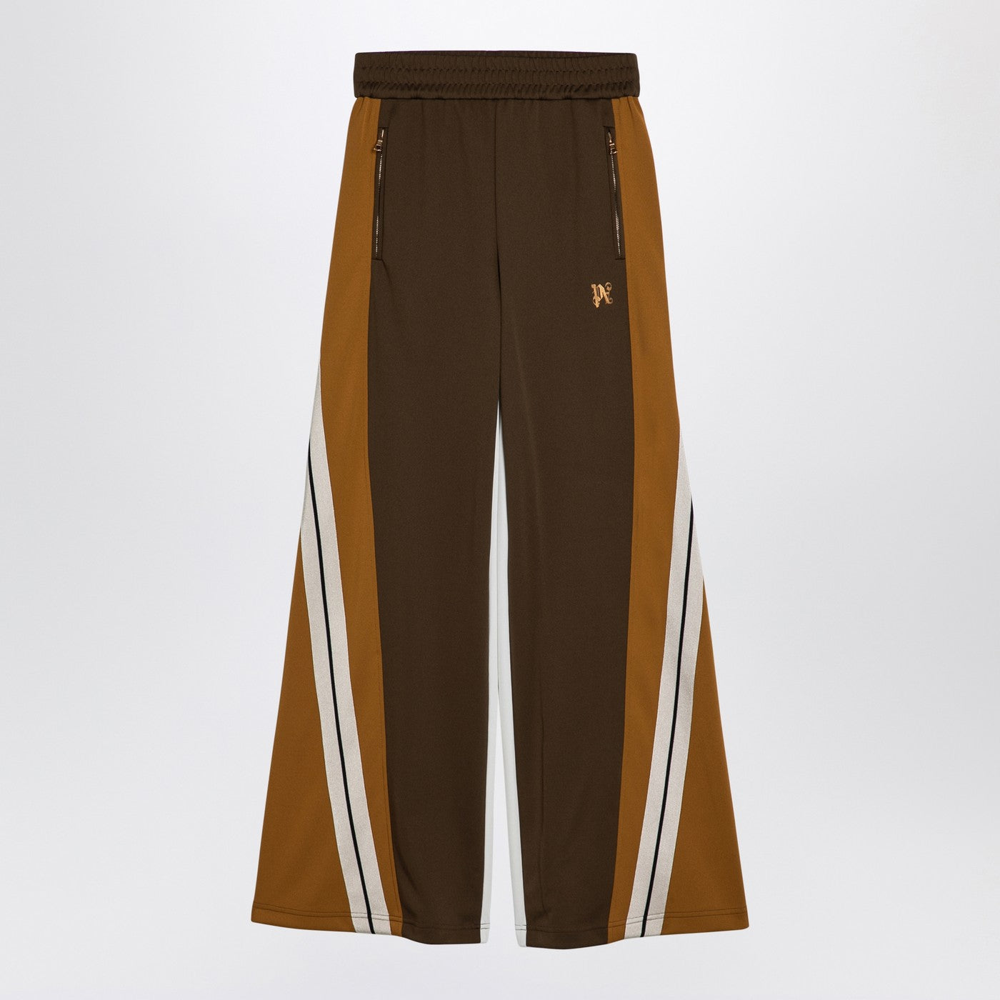 Brown, ochre and white colour-block Palm Angels loose-fitting sports trousers featuring an elasticated waistband, two zipped side welt pockets and an embroidered logo on the front.