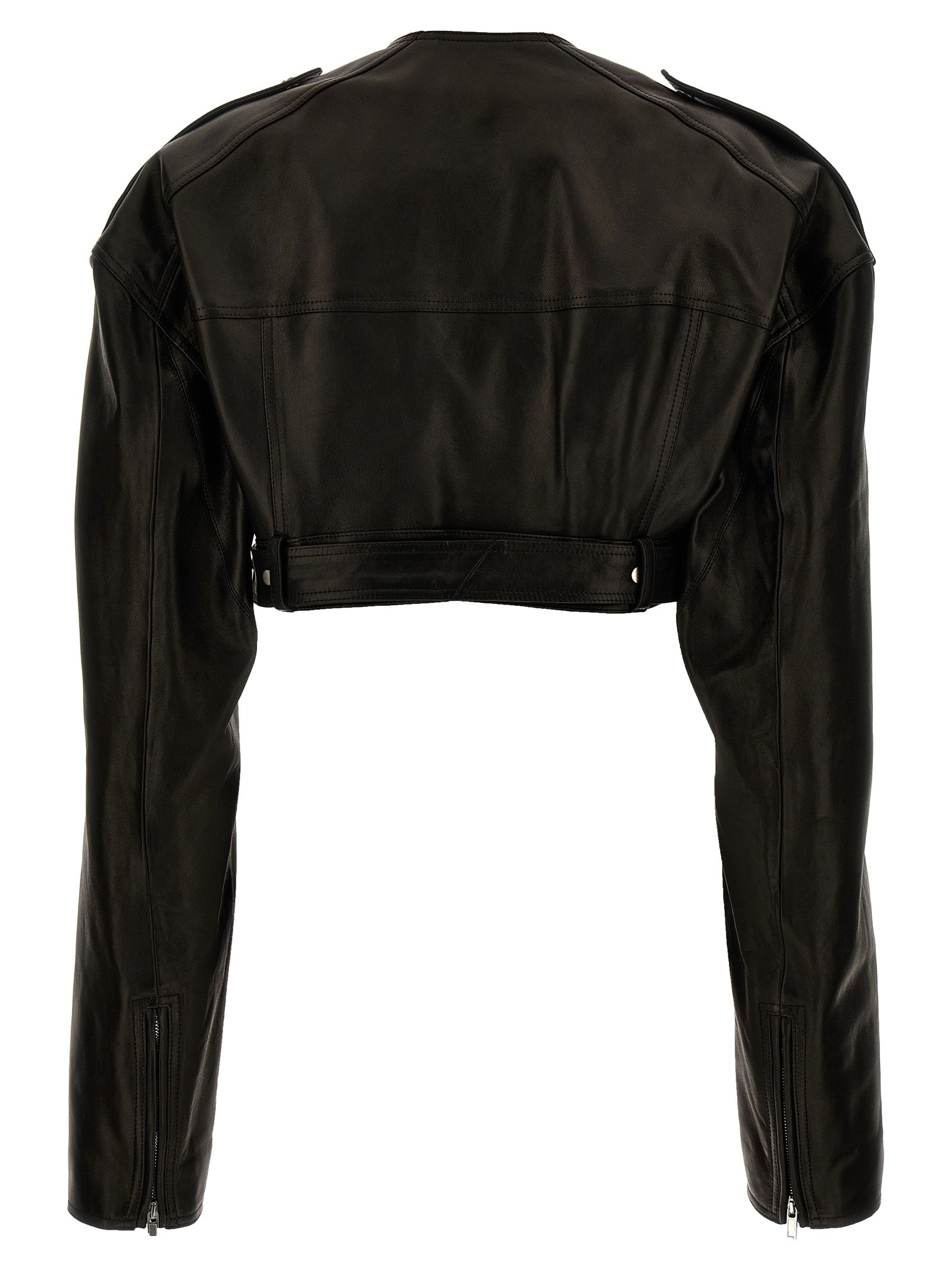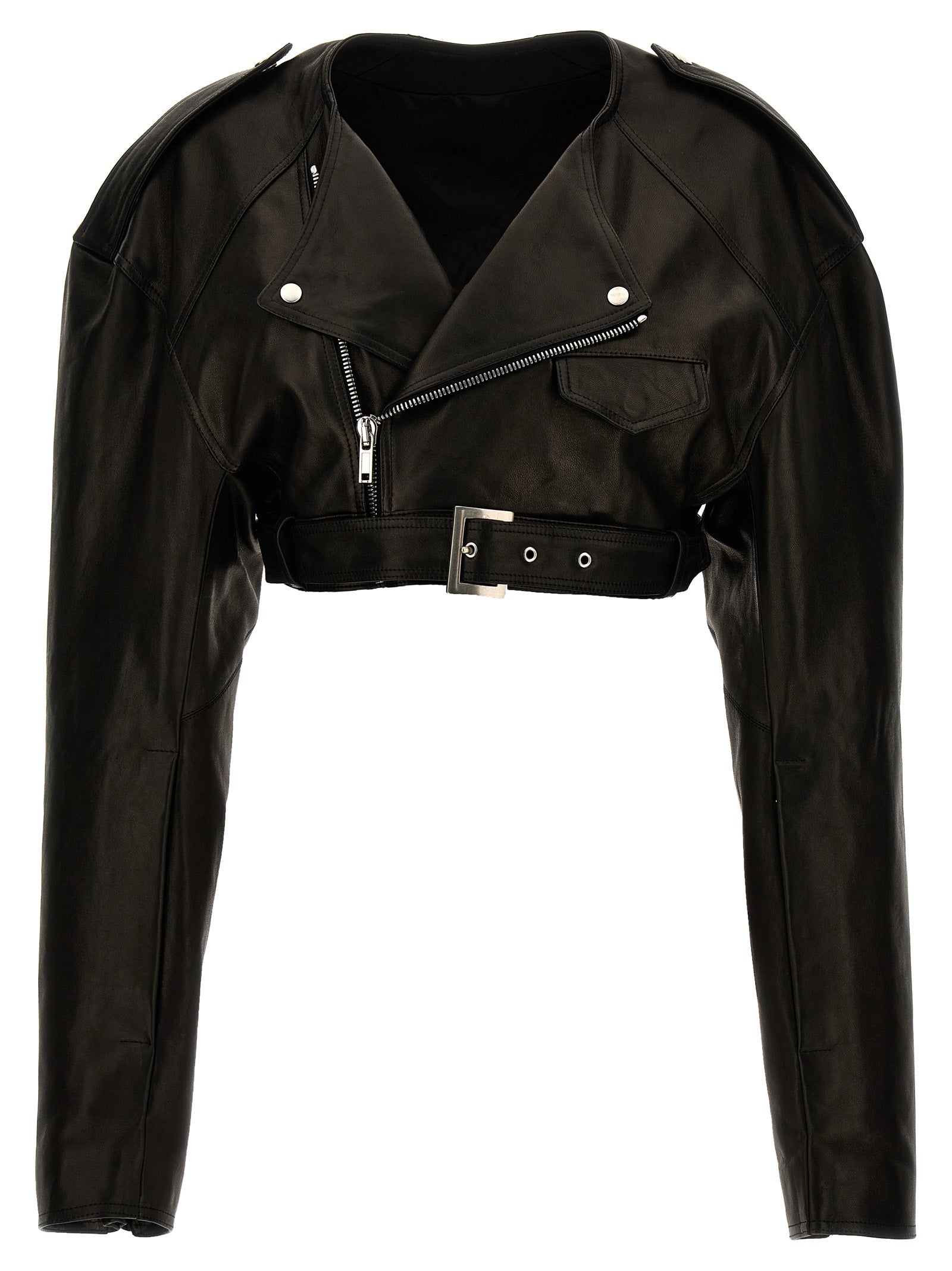 'Micro Biker' leather crop biker jacker, zip closure, belt at the waist, long sleeves.