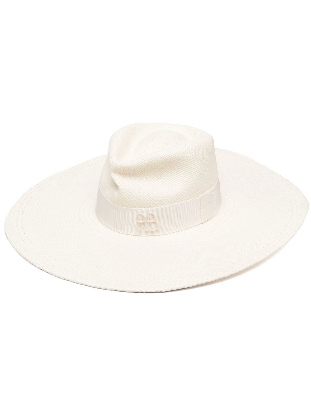 embroidered-logo fedora hat from RUSLAN BAGINSKIY featuring woven wicker design, embroidered logo to the front, wide brim, off-white and cotton/straw.