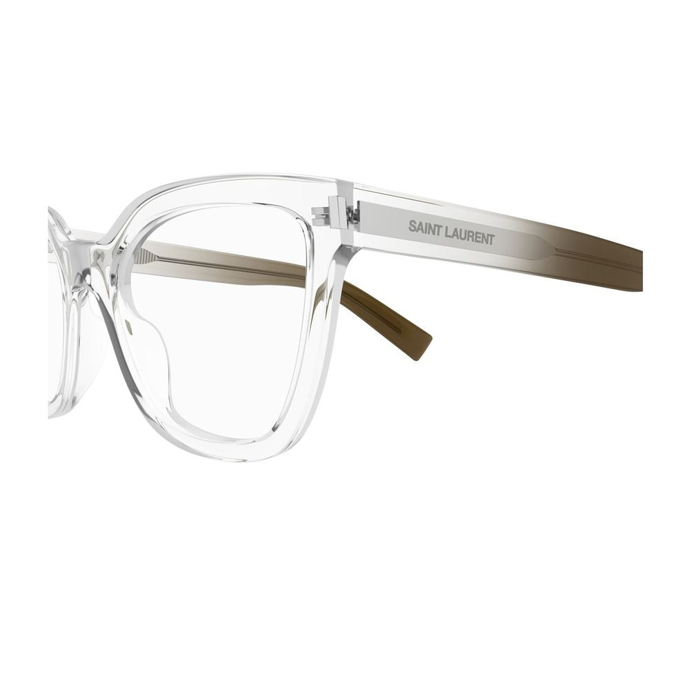 The Saint Laurent SL 748 optical model from the Corner Angle line stands out with its transparent acetate cat-eye frame and an internal arrow-shaped metal core. The temples, shaded from dark green to brown, feature the engraved Saint Laurent logo, visible through the ultra-glossy cast resin finish.