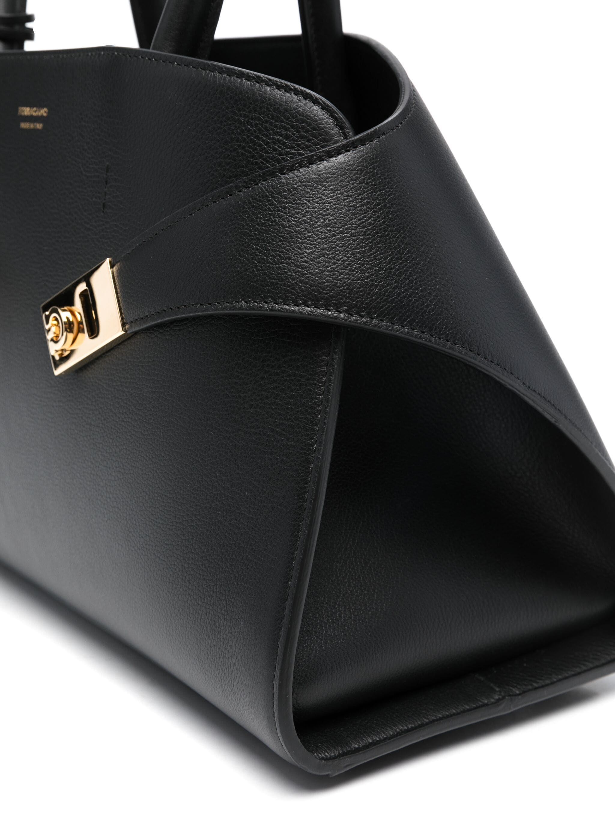 La borsa tote Hug media di Ferragamo, in pelle di vitello nera con trama martellata, si distingue per la stampa con logo frontale e la fibbia Gancini. I dettagli color oro e la chiusura con zip a giro completano il design. È dotata di tracolla regolabile e rimovibile, due manici tondi e tasca interna con zip.