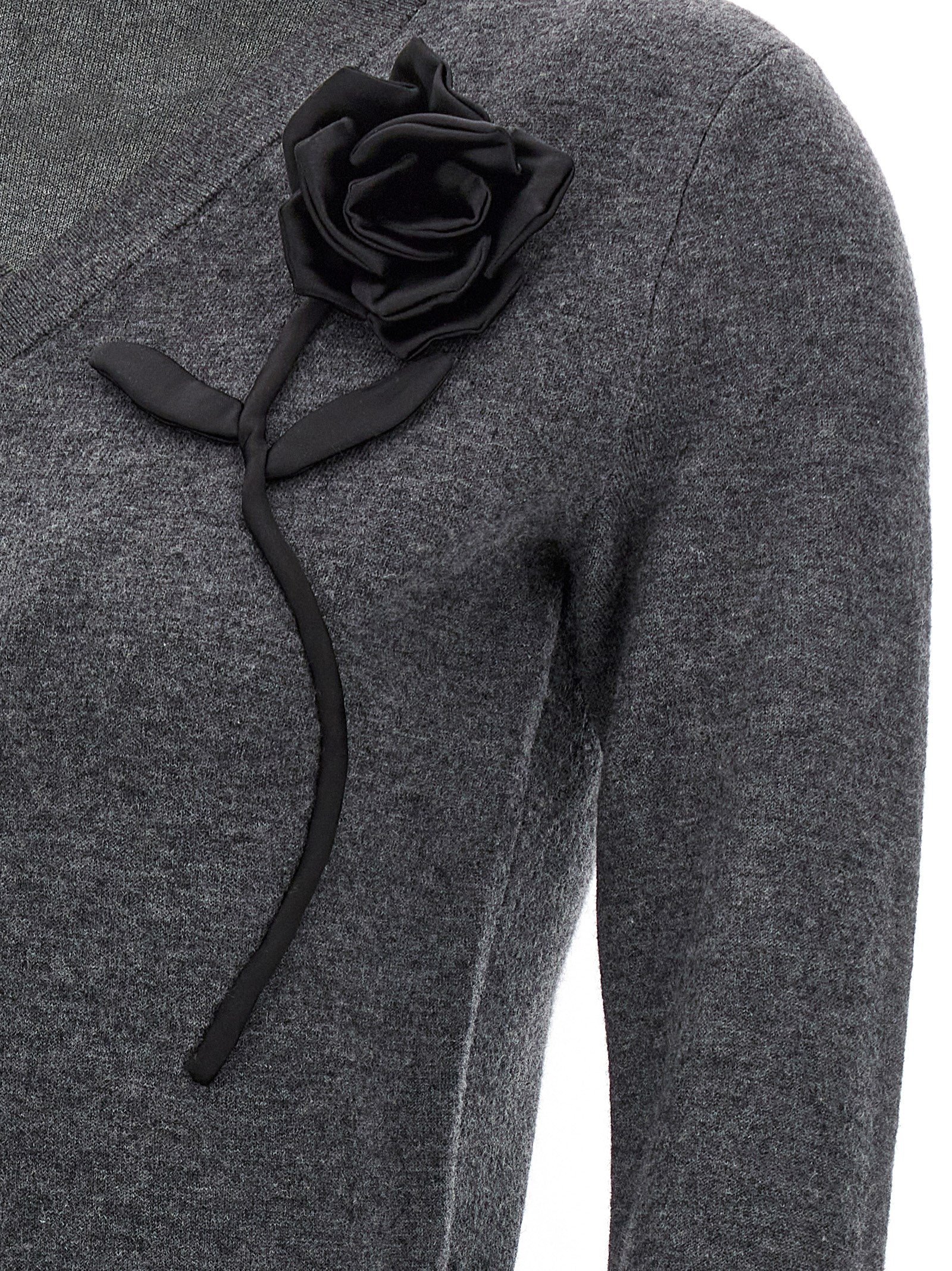 'Charcoal Black Rose Jumper' cotton and cashmere wool blend sweater with 3D satin floral detail, V-neck, long cuffed sleeves.