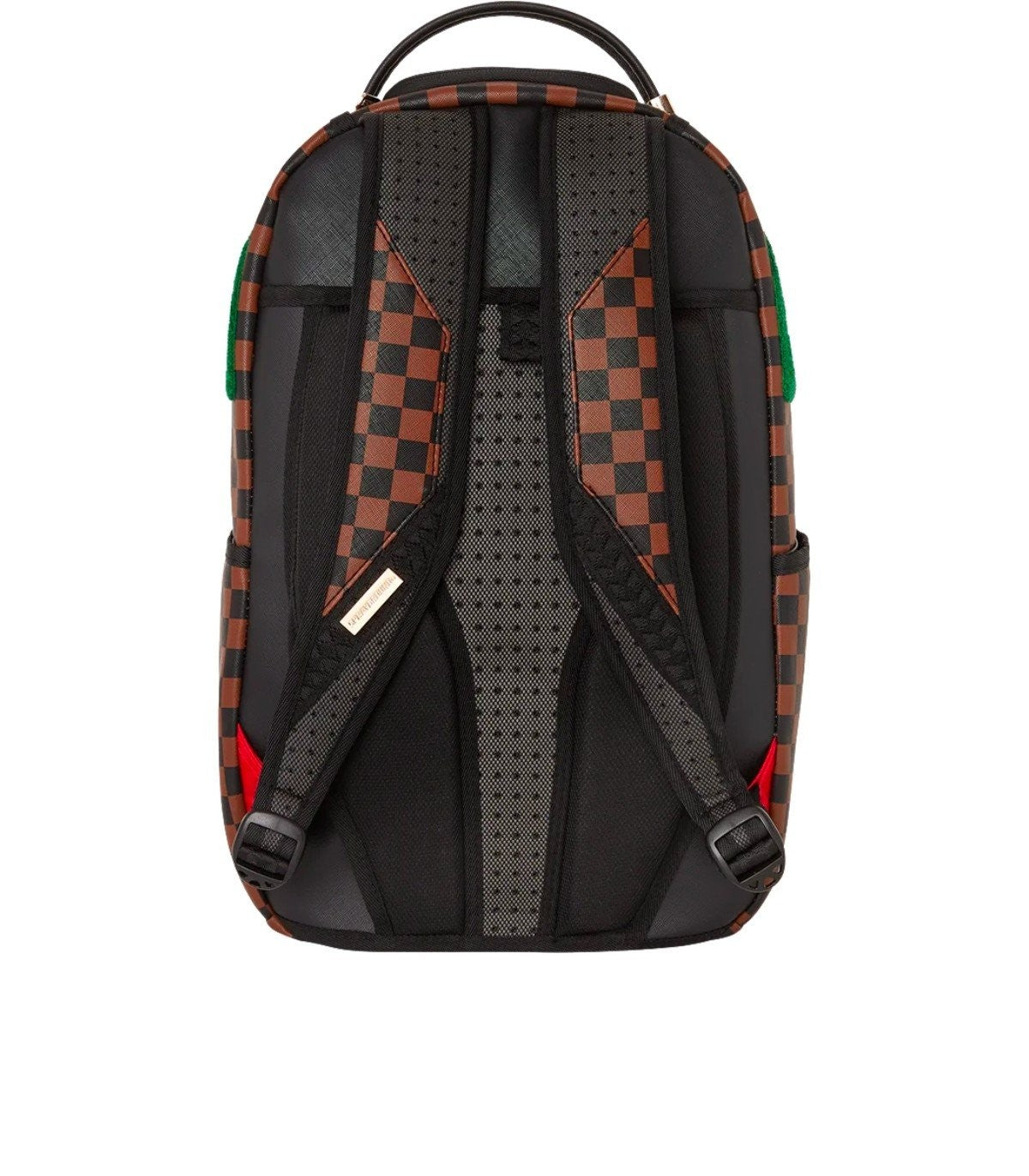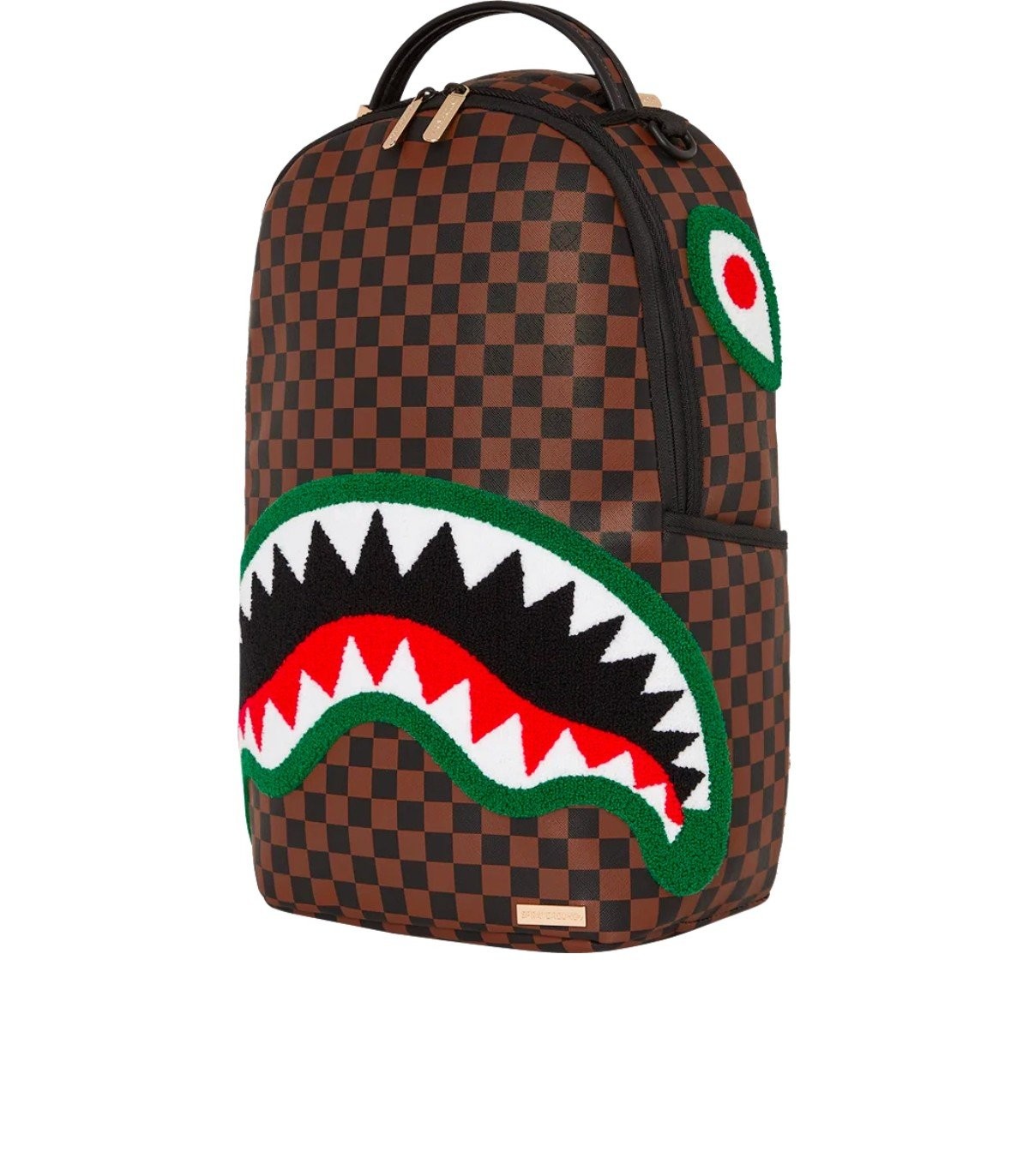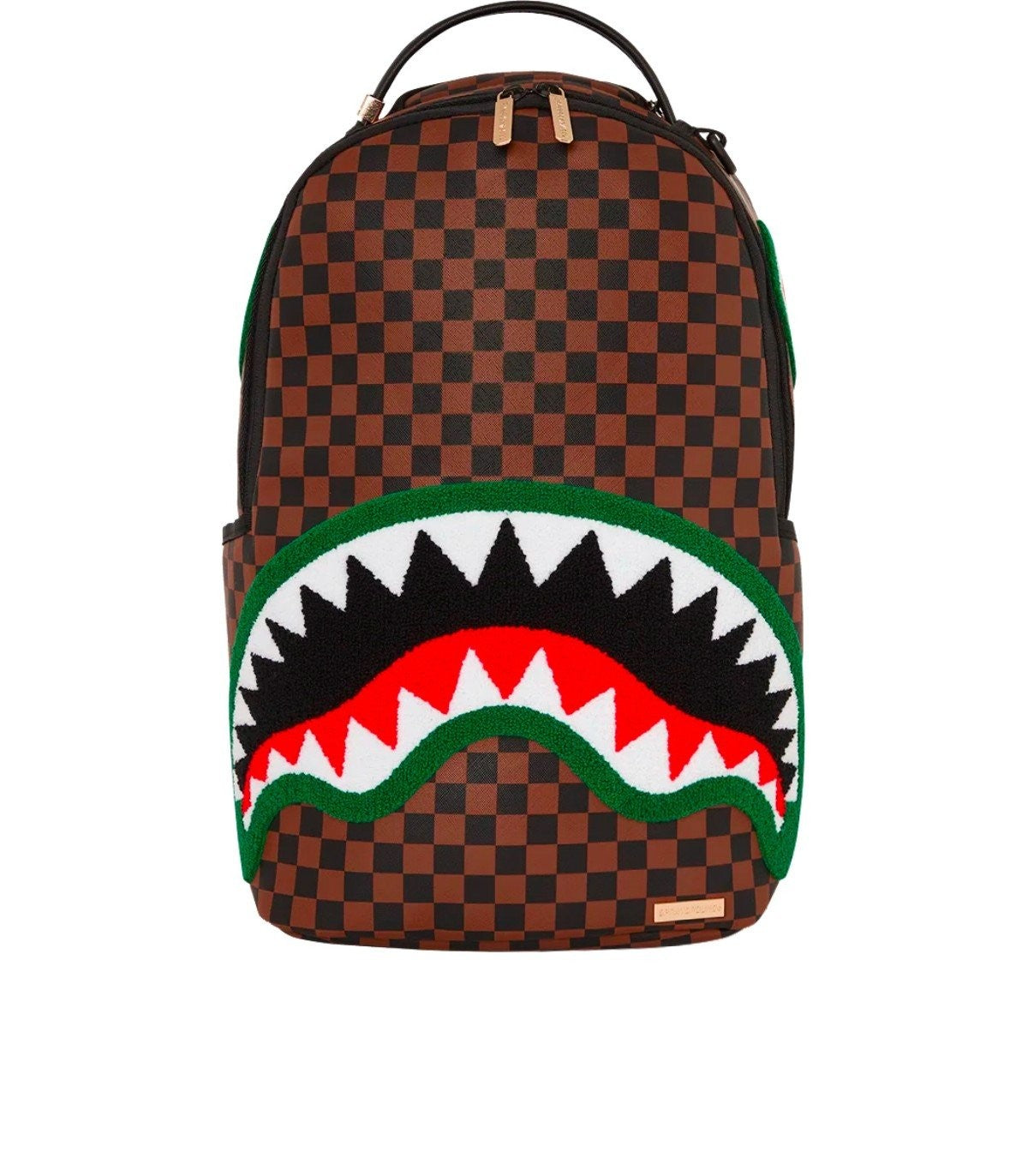 Chenille Sip backpack by Sprayground made of faux leather with brown and black checkered pattern, decorated with a chenille shark mouth, the brand's symbol, applied in contrast on the front. Details in golden metal, interior with multiple compartments, including a dedicated velvet laptop pocket, top handle and zip closure. Side pockets with velcro. Adjustable shoulder straps and padded ergonomic back, with an opening to hook it onto the trolley handle. Measures 46x30x16.5 cm.